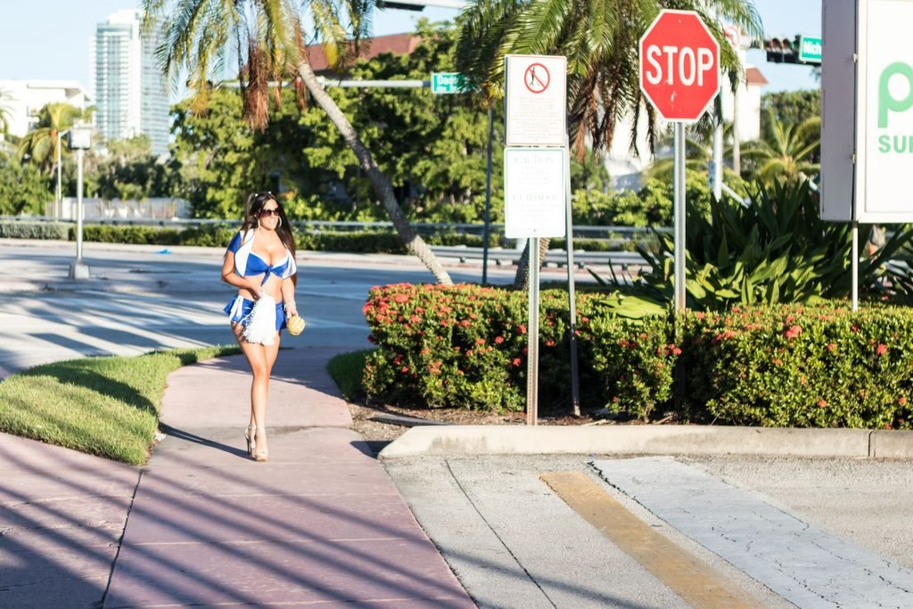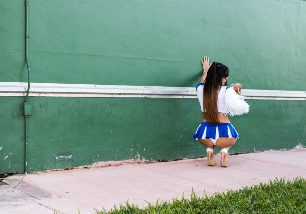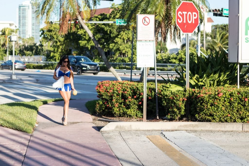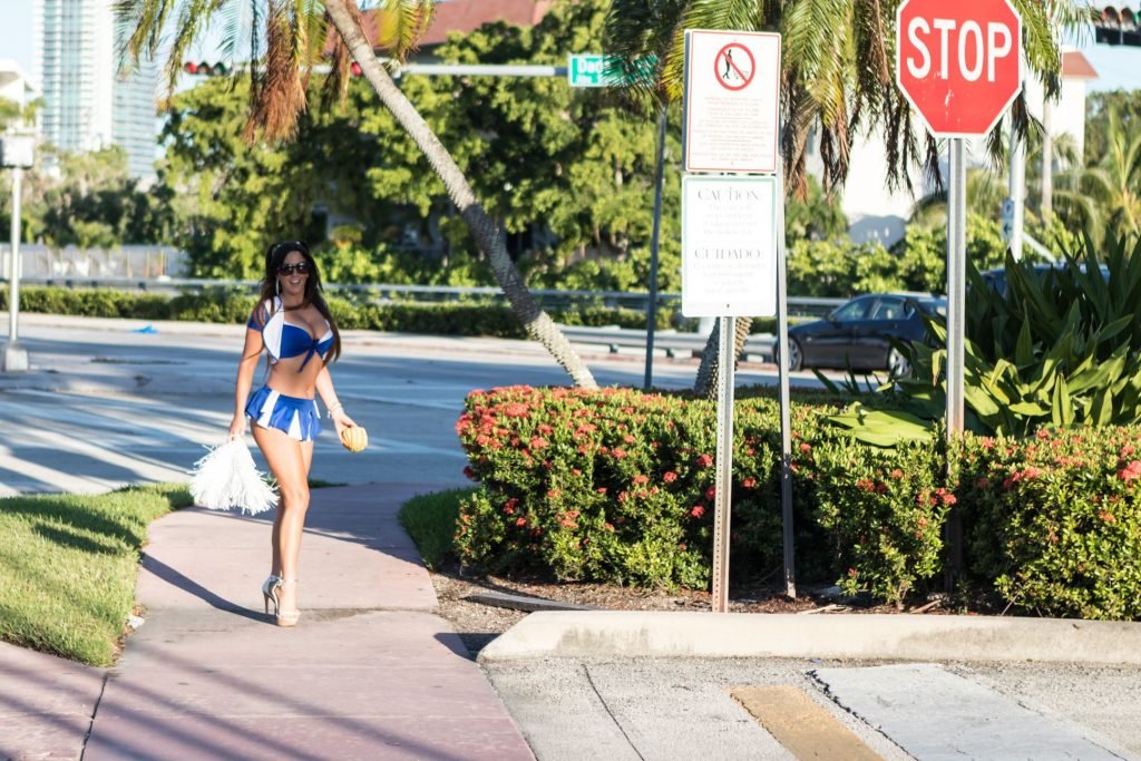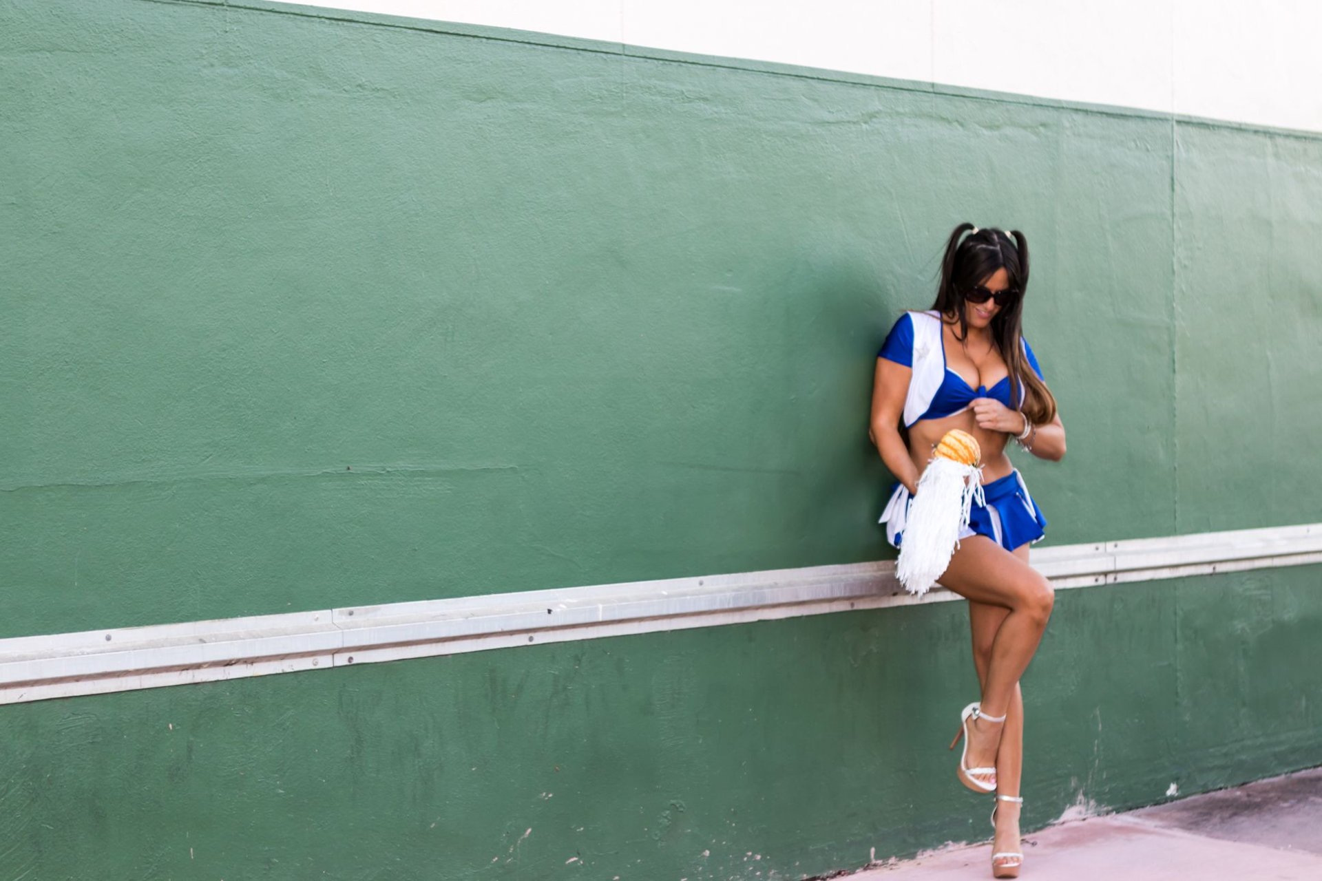 Modella italiana, star della TV reality Claudia Romani (35) a Publix a South Beach, attirando sguardi e rubando cuori con un costume da cheerleader di Halloween super piccolo, 29/10/2017. Gonna corta che non nasconde davvero il perizoma bianco sotto.