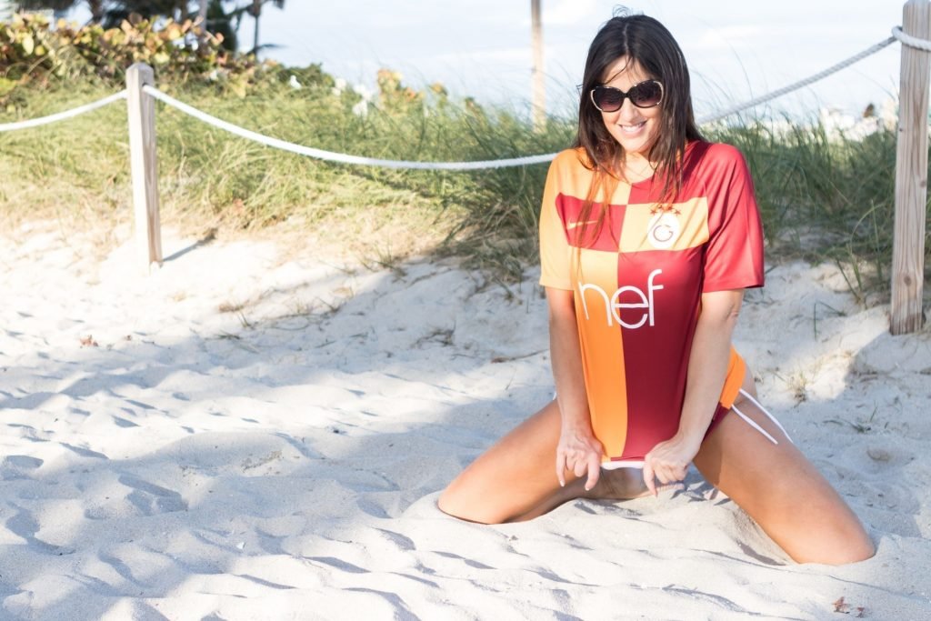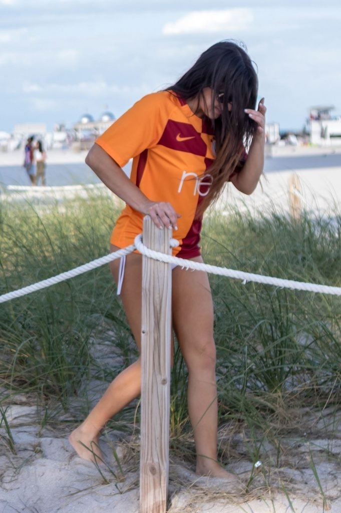 Arbitro italiano, appassionata di calcio, star della televisione reality e modella Claudia Romani, 36 anni, è stata vista posare indossando solo un perizoma e una maglia del Galatasaray a Miami, 29/04/2018. Mostrava il suo sostegno per il club turco per onorare la richiesta dei suoi follower.
