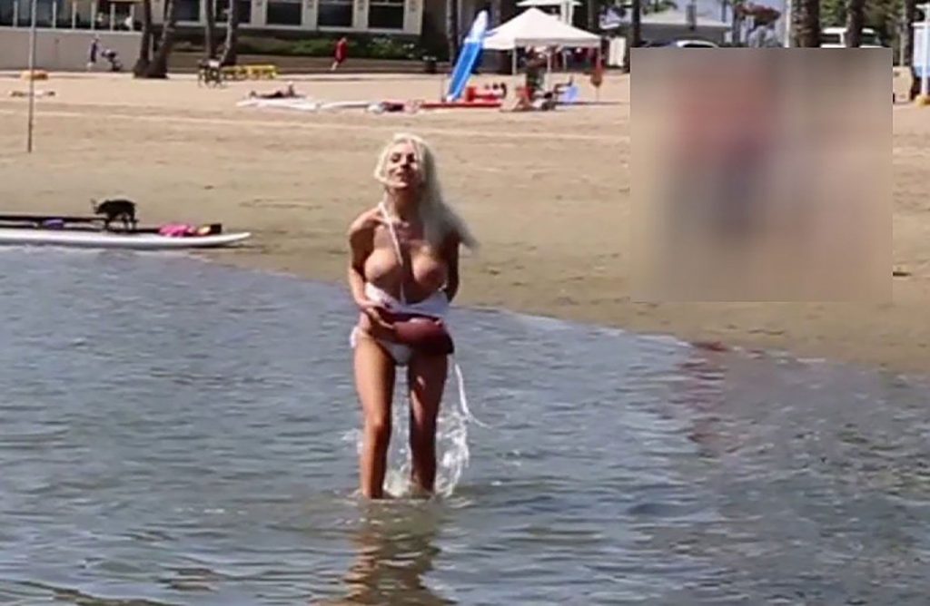 Then Courtney Stodden is fully naked, flashing her giant fake balloons and entering the swimming pool to get her pussy and boobs all wet!