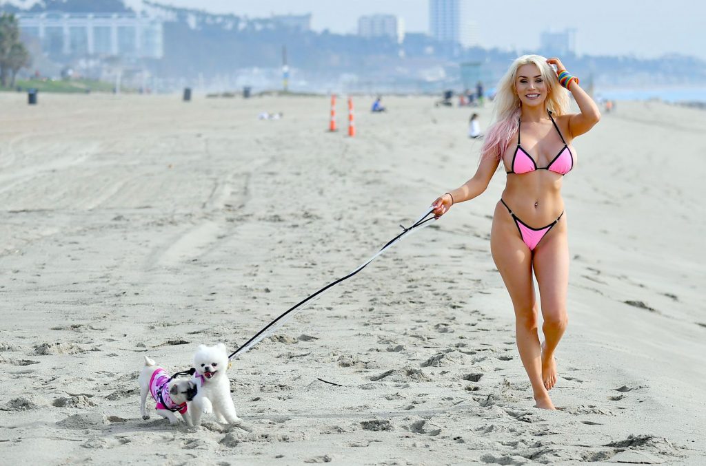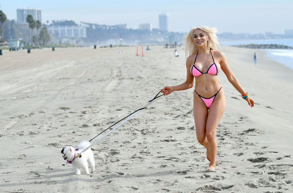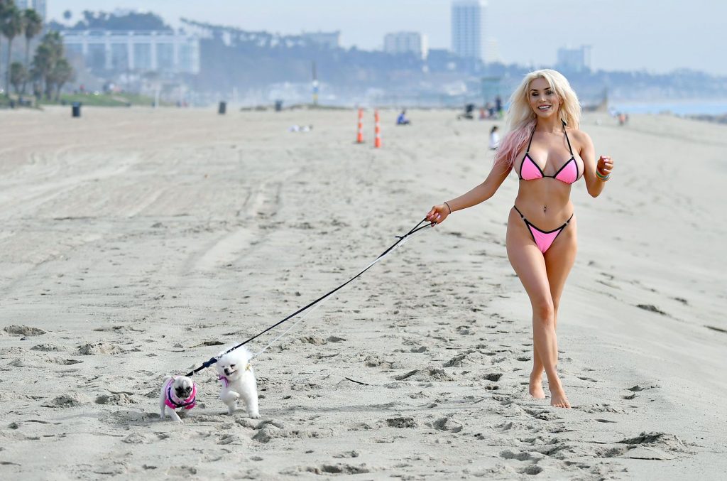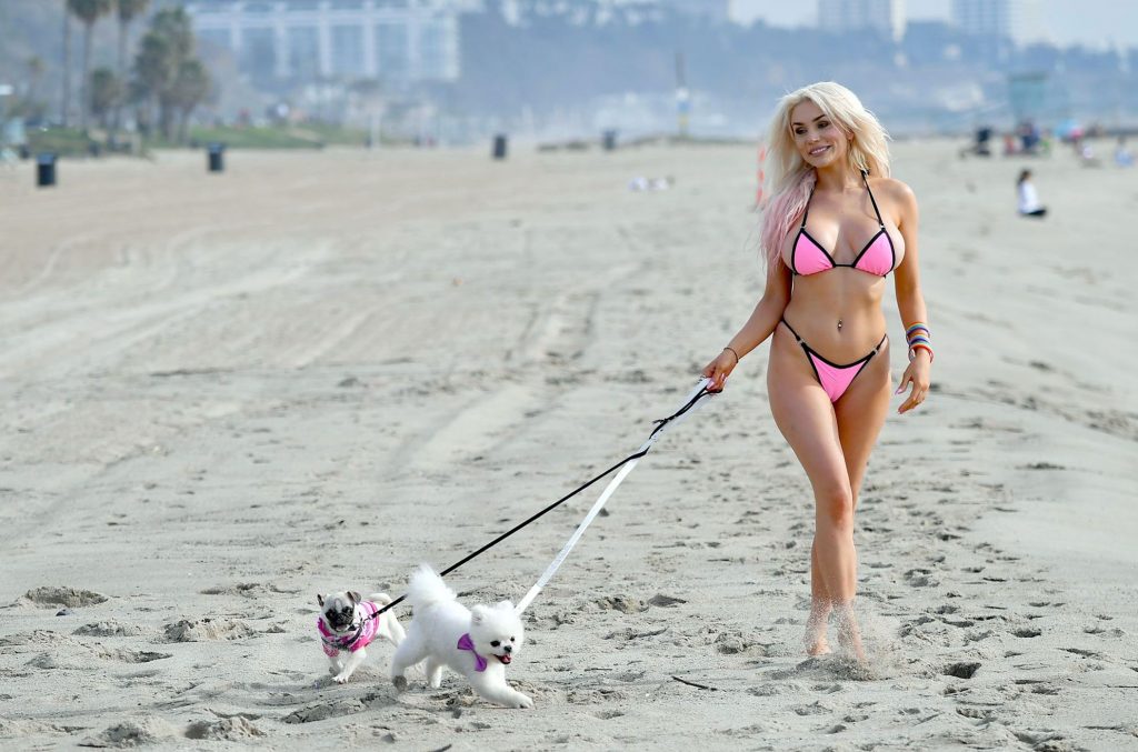 Check these out, guys! For the end, We have some Courtney Stodden bikini photos to show you! Miss plastic blonde wore a skimpy pink bikini from which her plastic tits almost fell out! The whore also posed with some two dogs, a volleyball, and her cameltoe was in the center of attention!