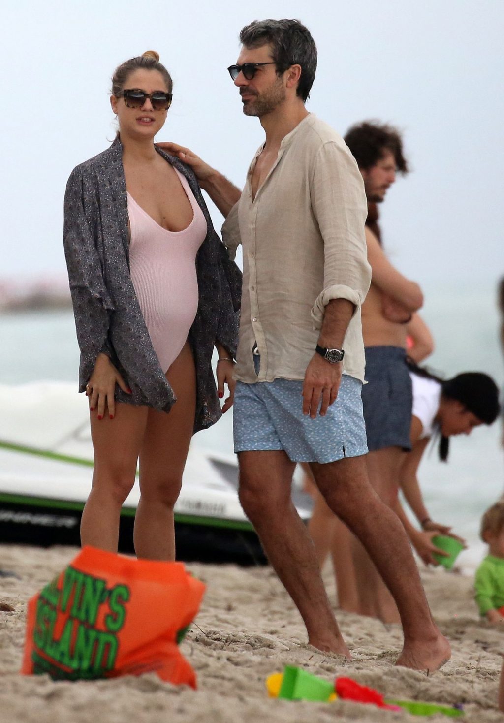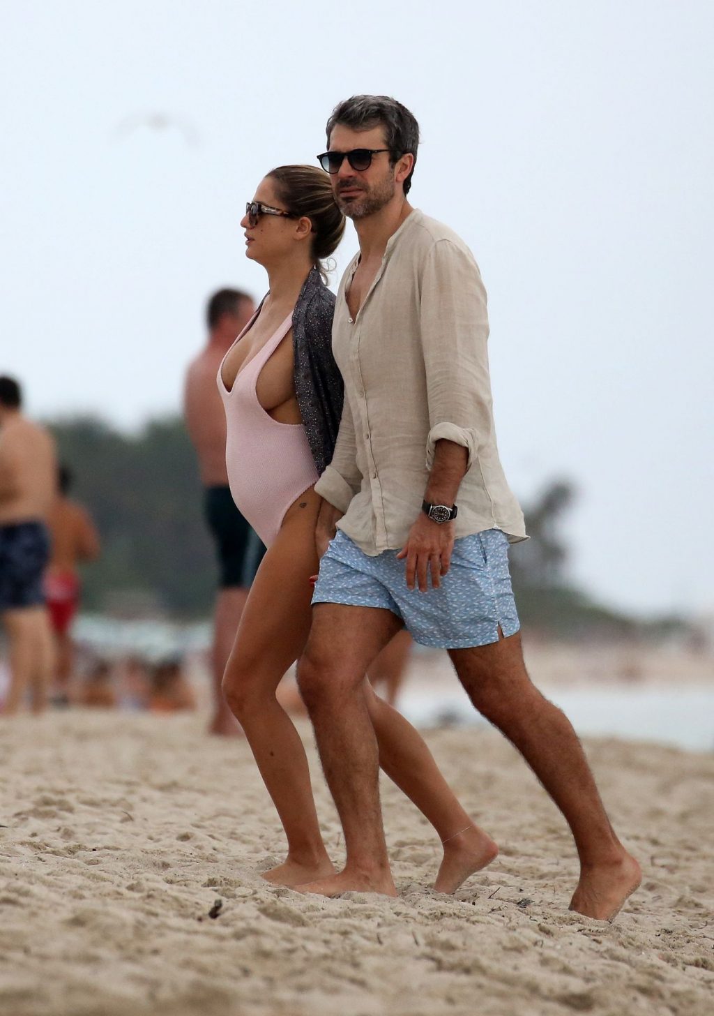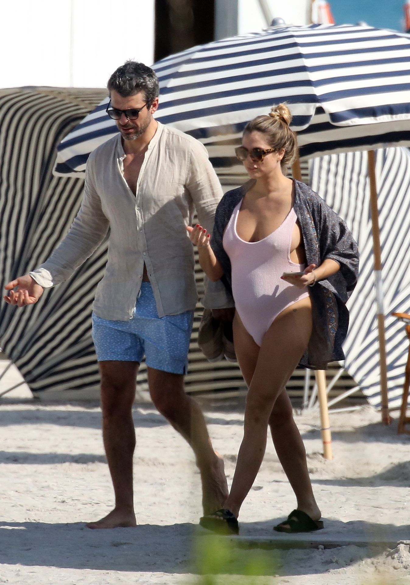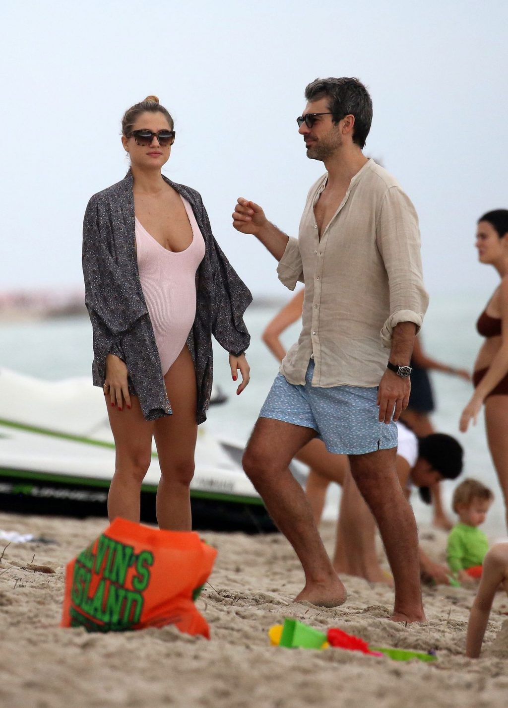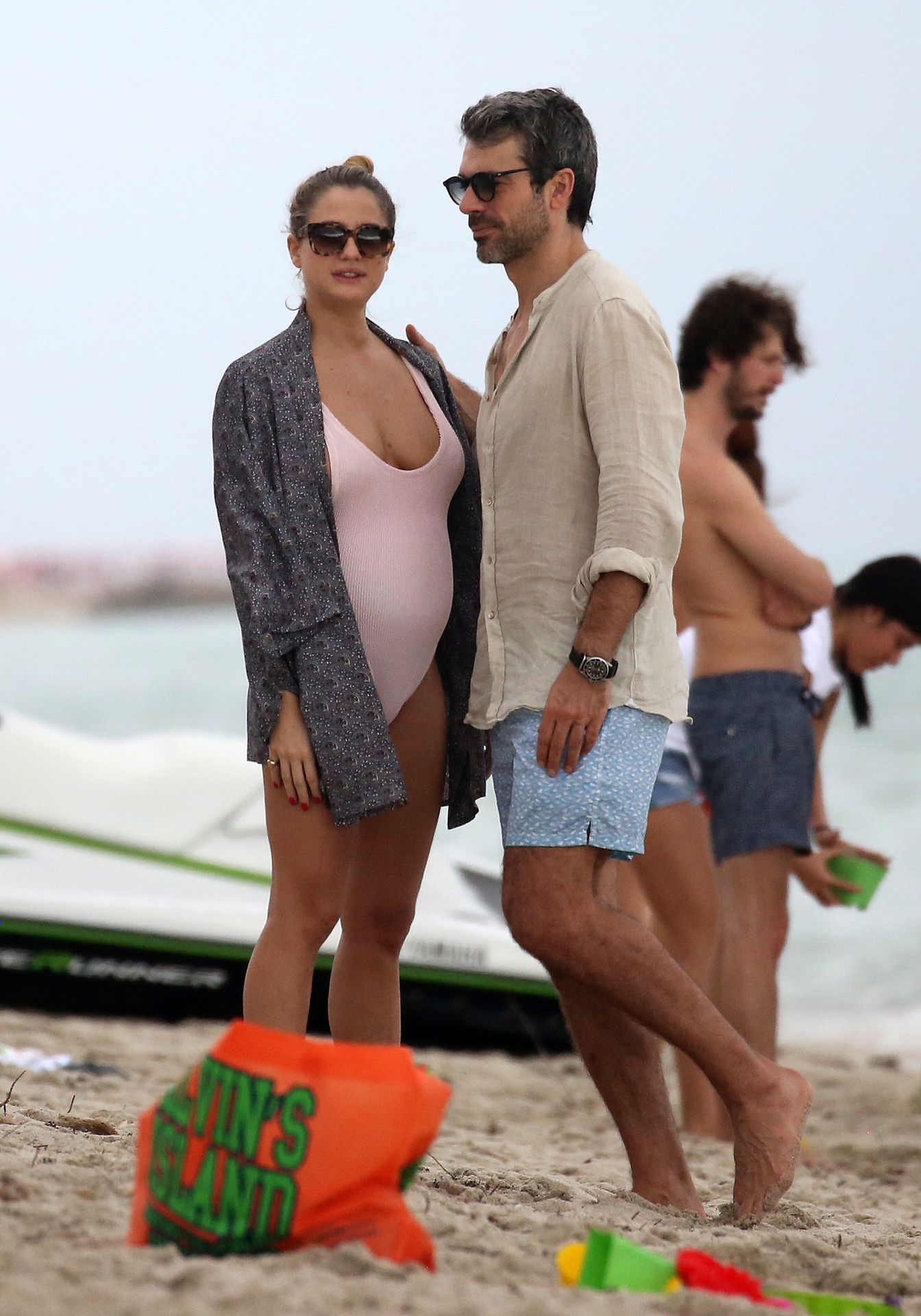 L’attrice Cristina Marino mostra il suo pancione e tutte le sue nuove curve in un costume da bagno molto rivelatore mentre si gode la spiaggia con Luca Argentero a Miami la vigilia di Capodanno, 31/12/2019.