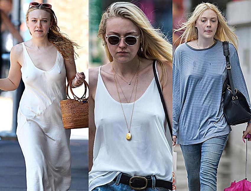 Questa ragazza si rifiuta semplicemente di indossare un reggiseno. E non solo, sembra che tutto il suo guardaroba sia fatto di camicie sottili e trasparenti. Espongono completamente i seni nudi di Dakota Fanning e i capezzoli duri sotto il tessuto sottile.