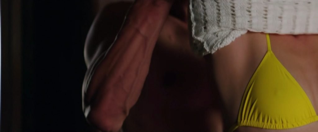 Vediamo un breve scorcio del seno sinistro quando Dakota Johnson si toglie completamente il bikini dopo la lozione.