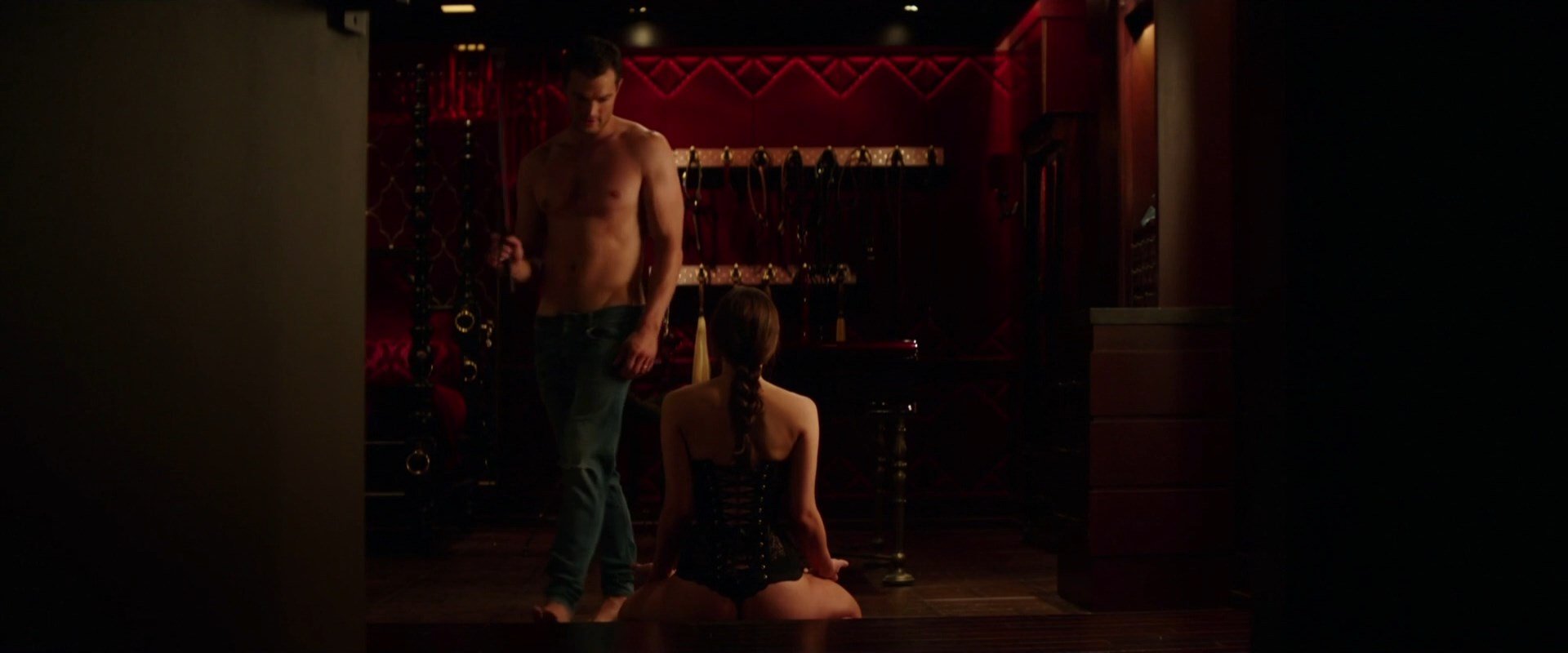 Dakota si spoglia fino alle mutandine camminando verso la doccia e vediamo i suoi seni. Vediamo i suoi glutei nella doccia dopo che Dornan se ne va.