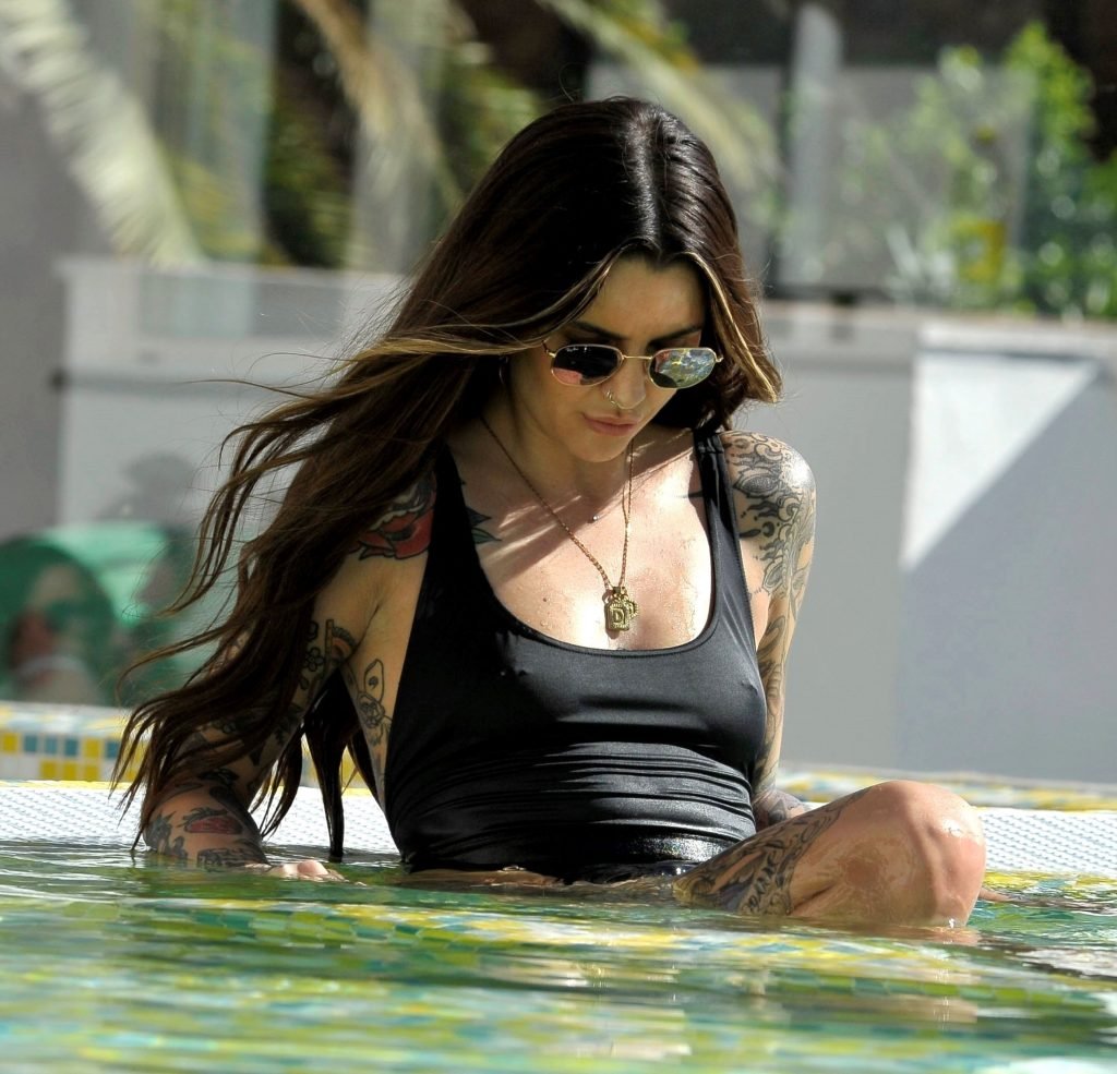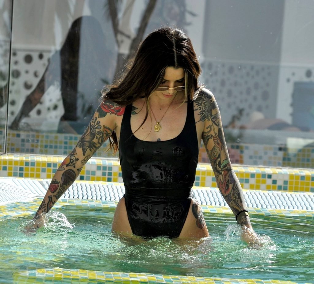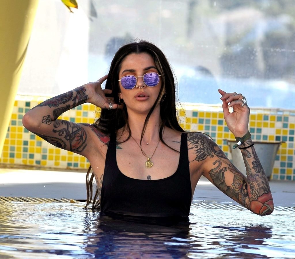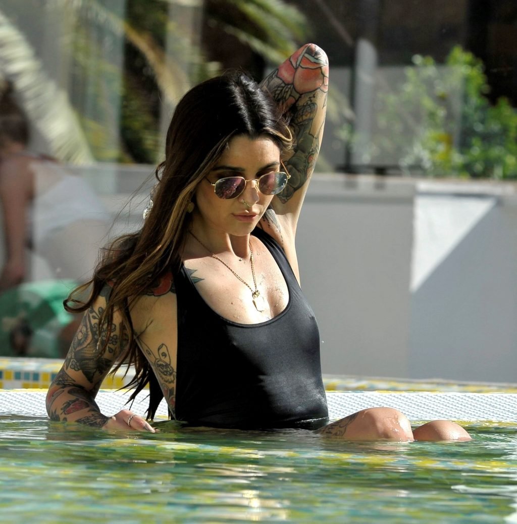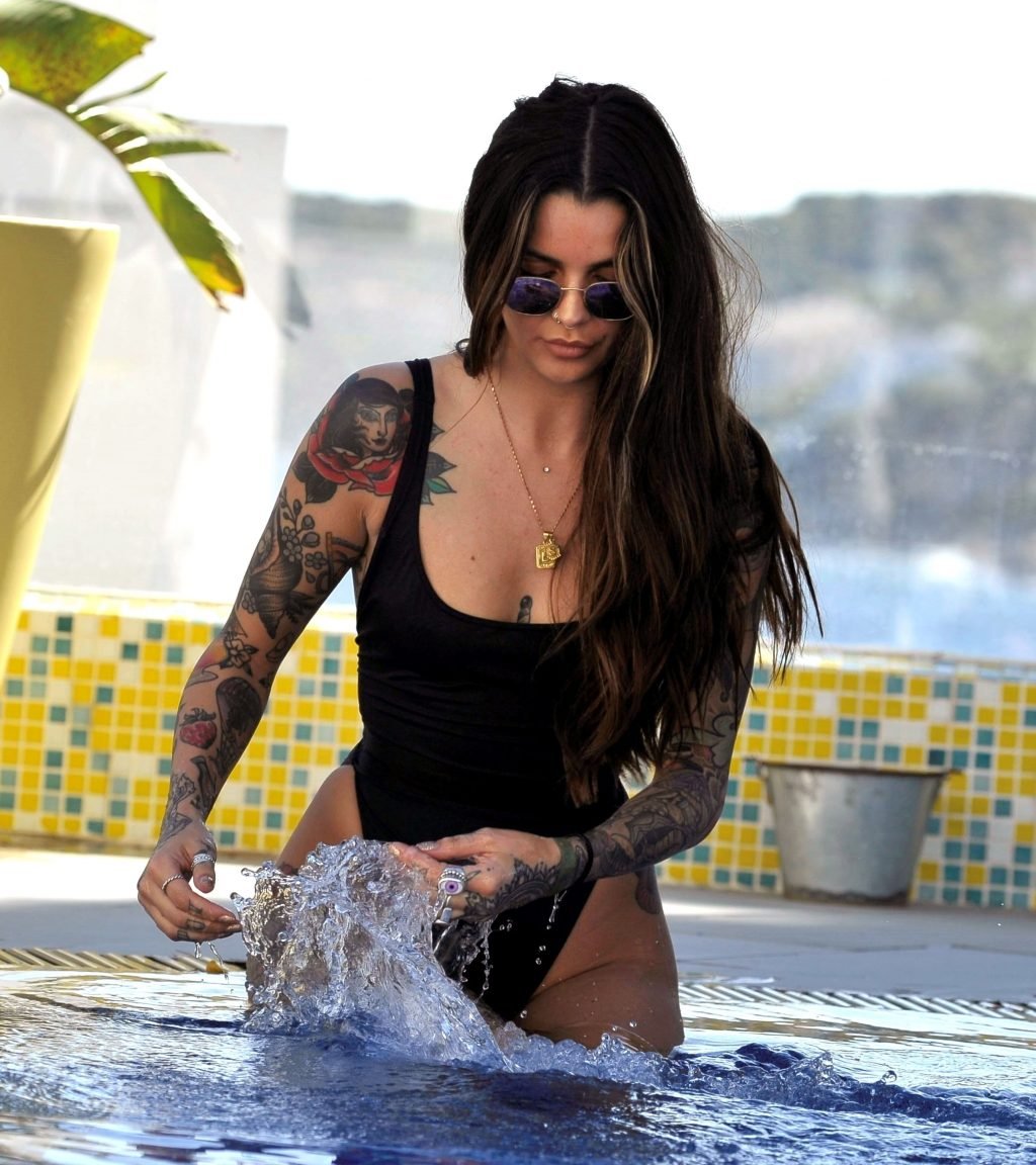 Love Island’s Darylle Sargeant (24) posa mentre si gode la sua vacanza spagnola a Ibiza, 22/10/2018. Darylle ha mostrato la sua impressionante esposizione di tatuaggi e ha stupito con il suo sexy costume da bagno nero mentre si rilassava al sole caldo spagnolo a bordo piscina.