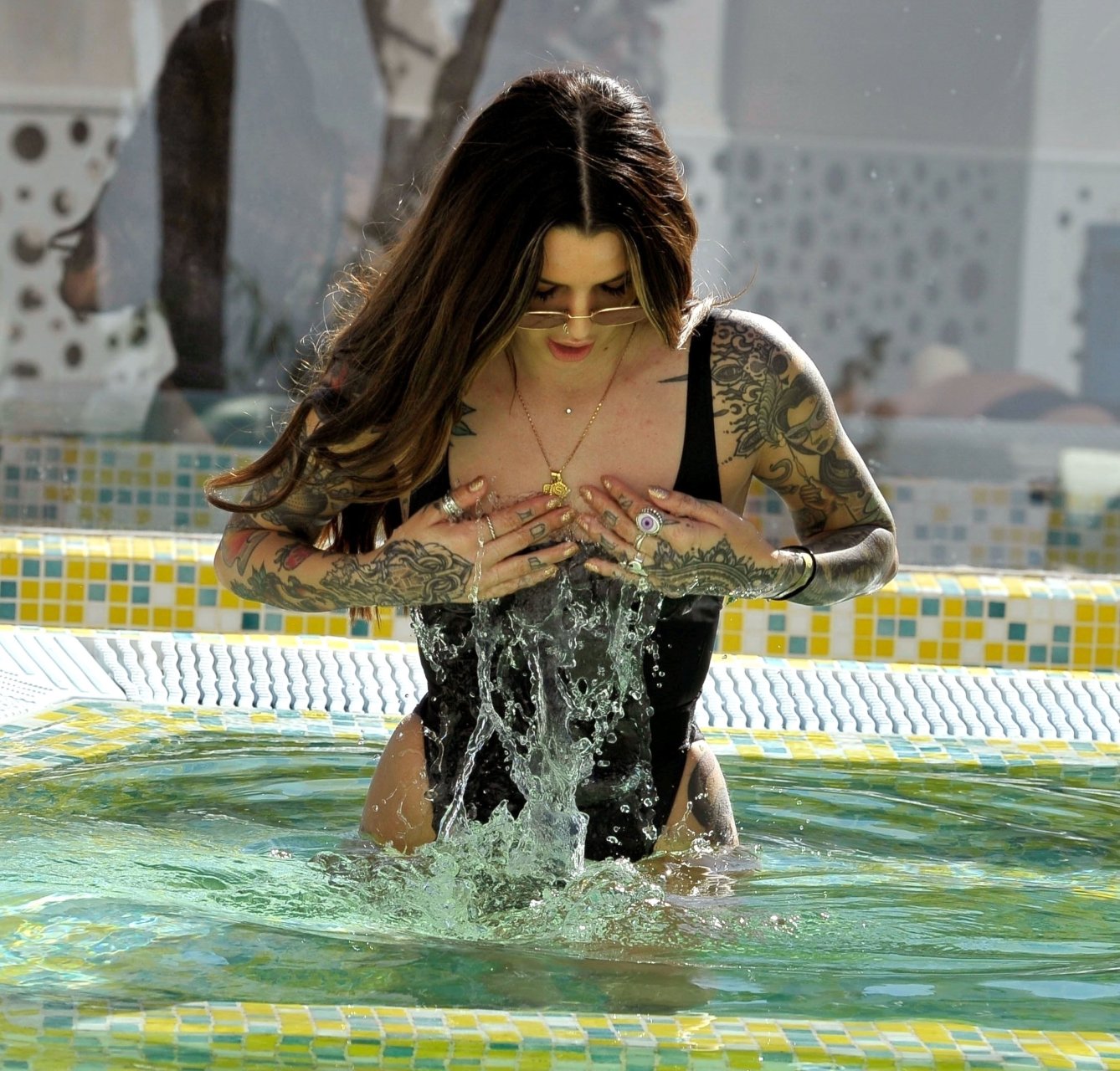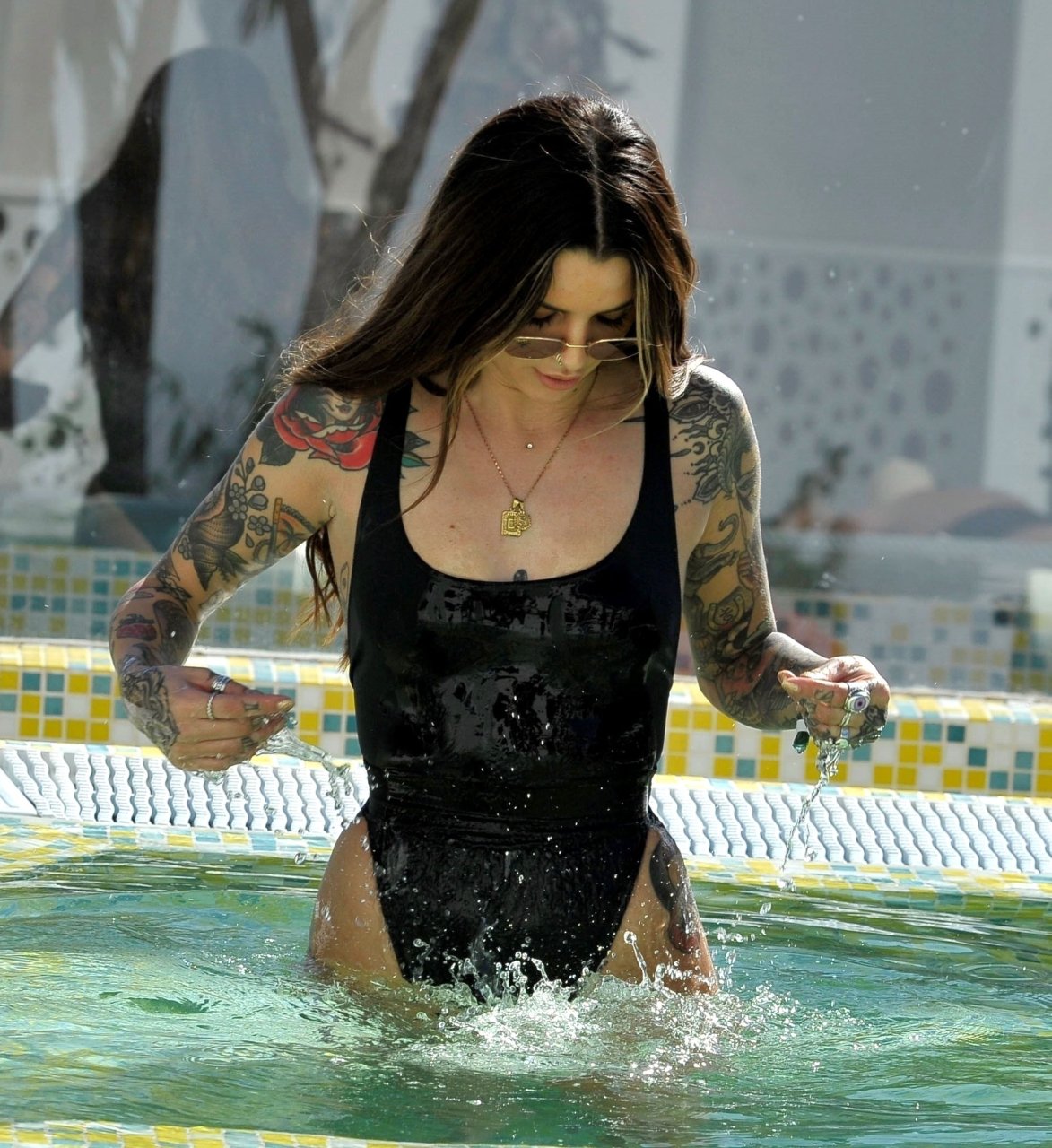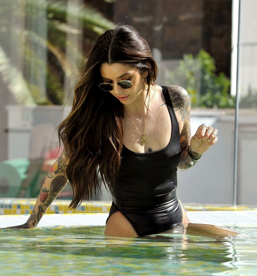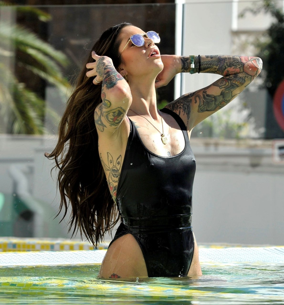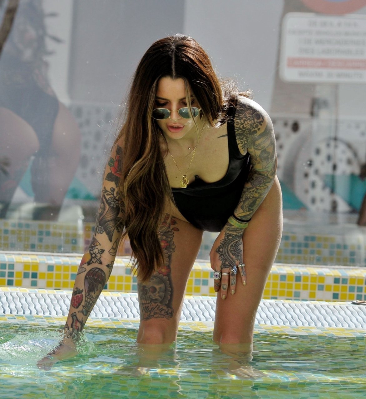 Love Island’s Darylle Sargeant (24) posa mentre si gode la sua vacanza spagnola a Ibiza, 22/10/2018. Darylle ha mostrato la sua impressionante esposizione di tatuaggi e ha stupito con il suo sexy costume da bagno nero mentre si rilassava al sole caldo spagnolo a bordo piscina.
