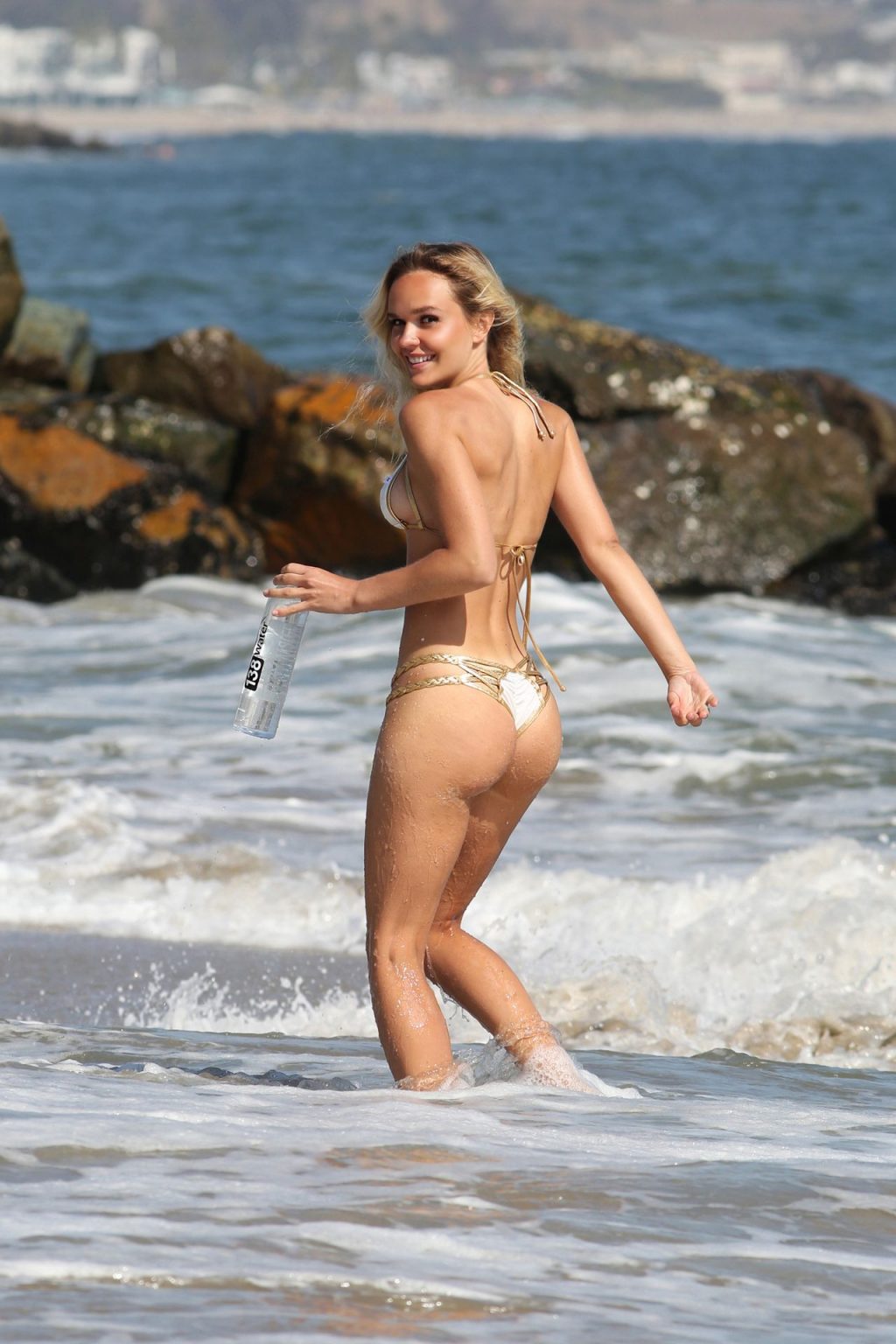 La modella russo-americana Dasha Inyutkina mostra il suo corpo sexy da spiaggia in un minuscolo bikini mentre gira un nuovo spot per 138 Water a Malibu, 27/05/2020.