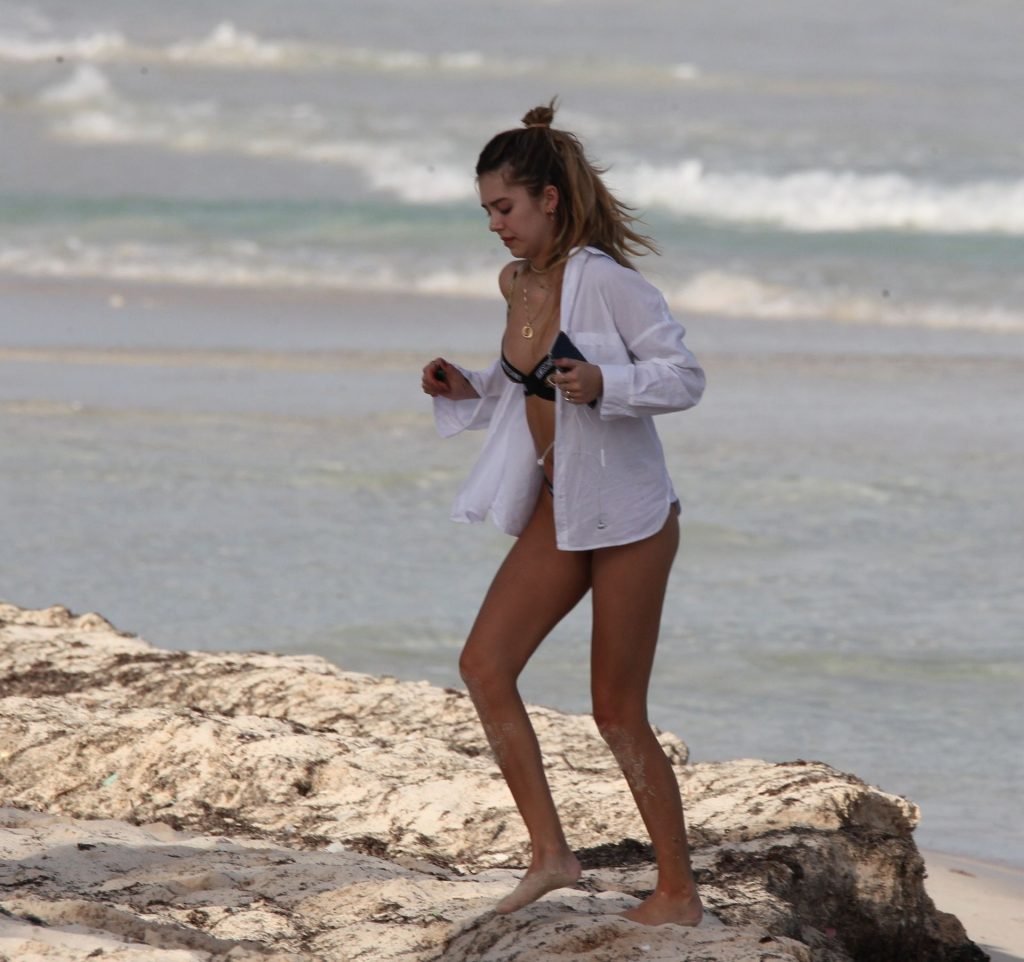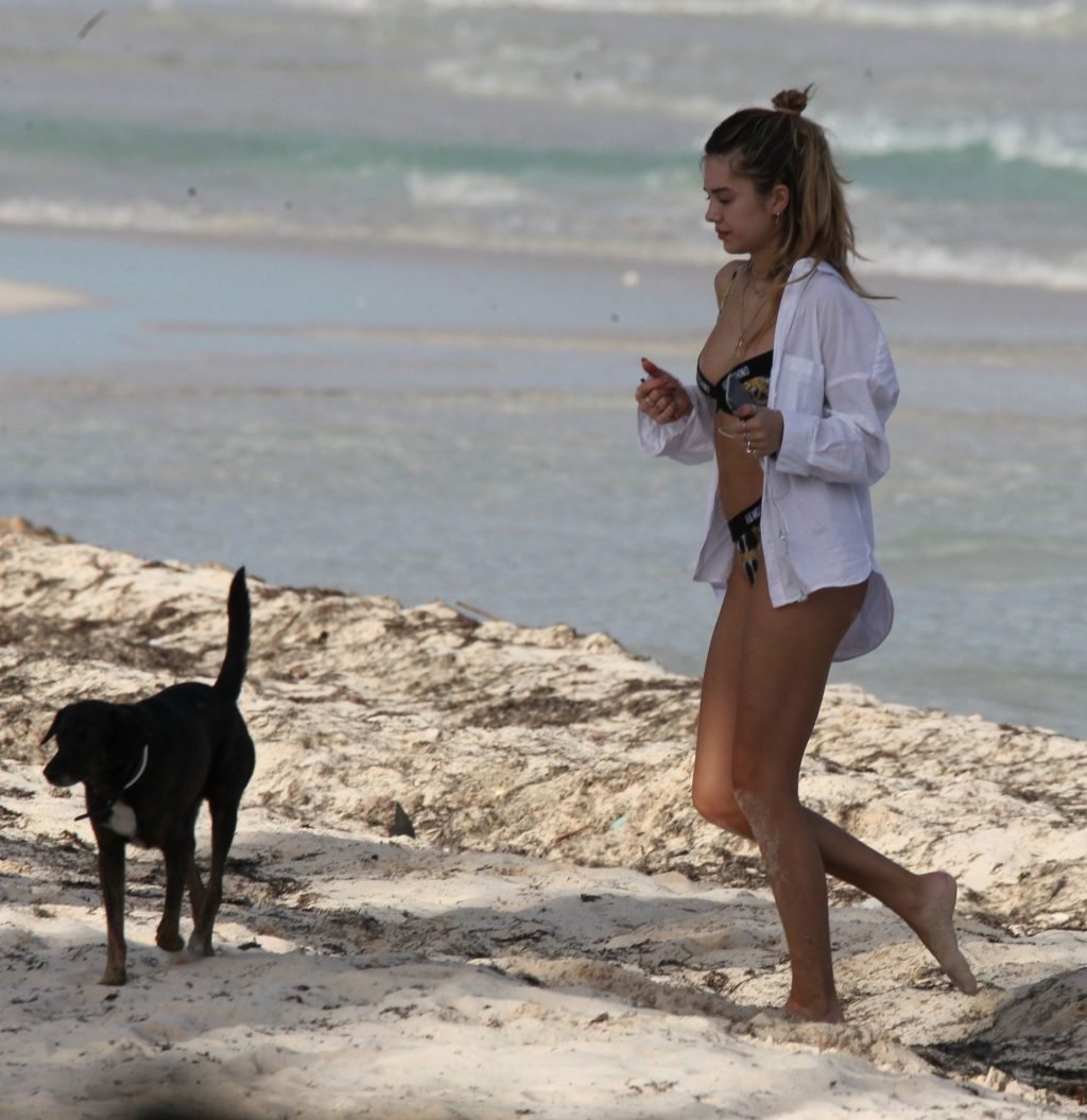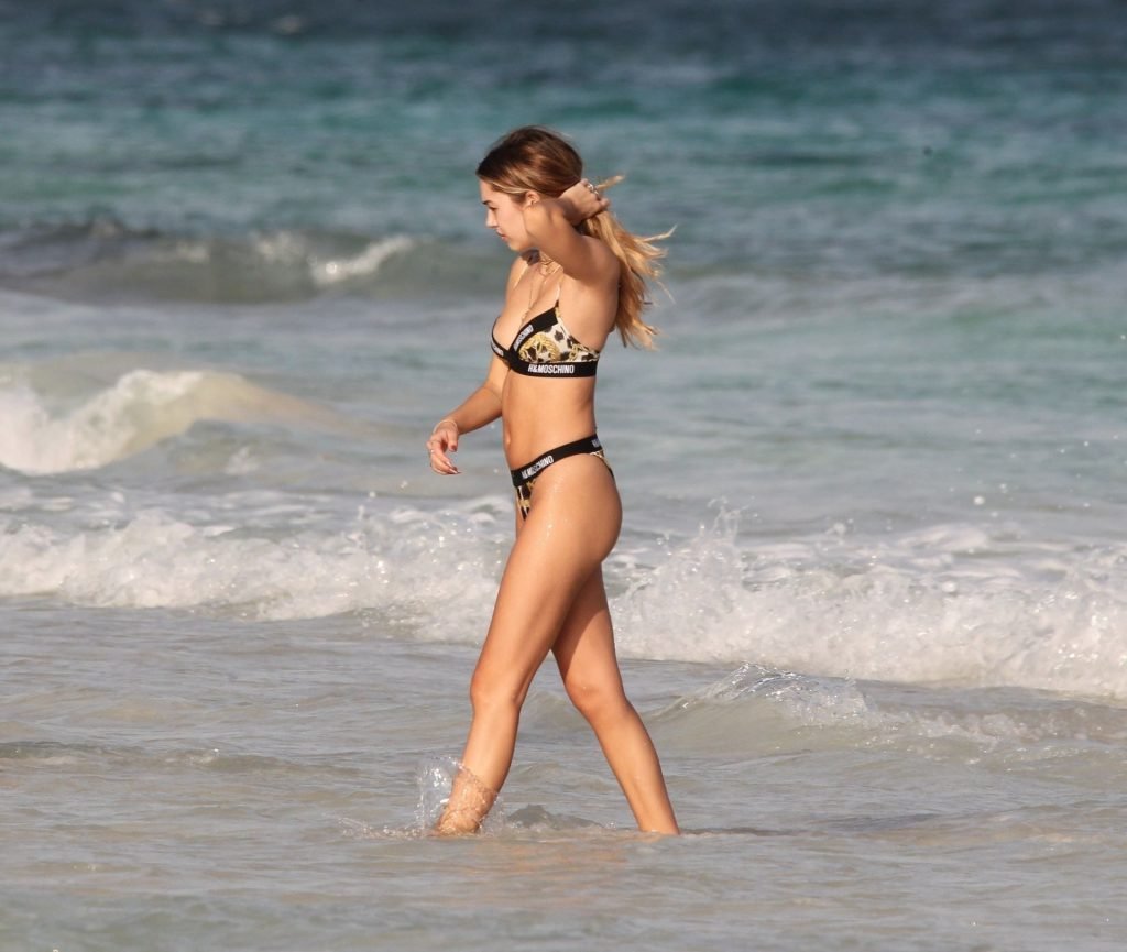 Model Delilah Belle Hamlin (20) è apparsa splendida mentre indossava un bikini leopardato H&M x Moschino e mostrava la sua figura impeccabile sulla spiaggia con un gruppo di amici a Tulum, Messico, 01/10/2019.