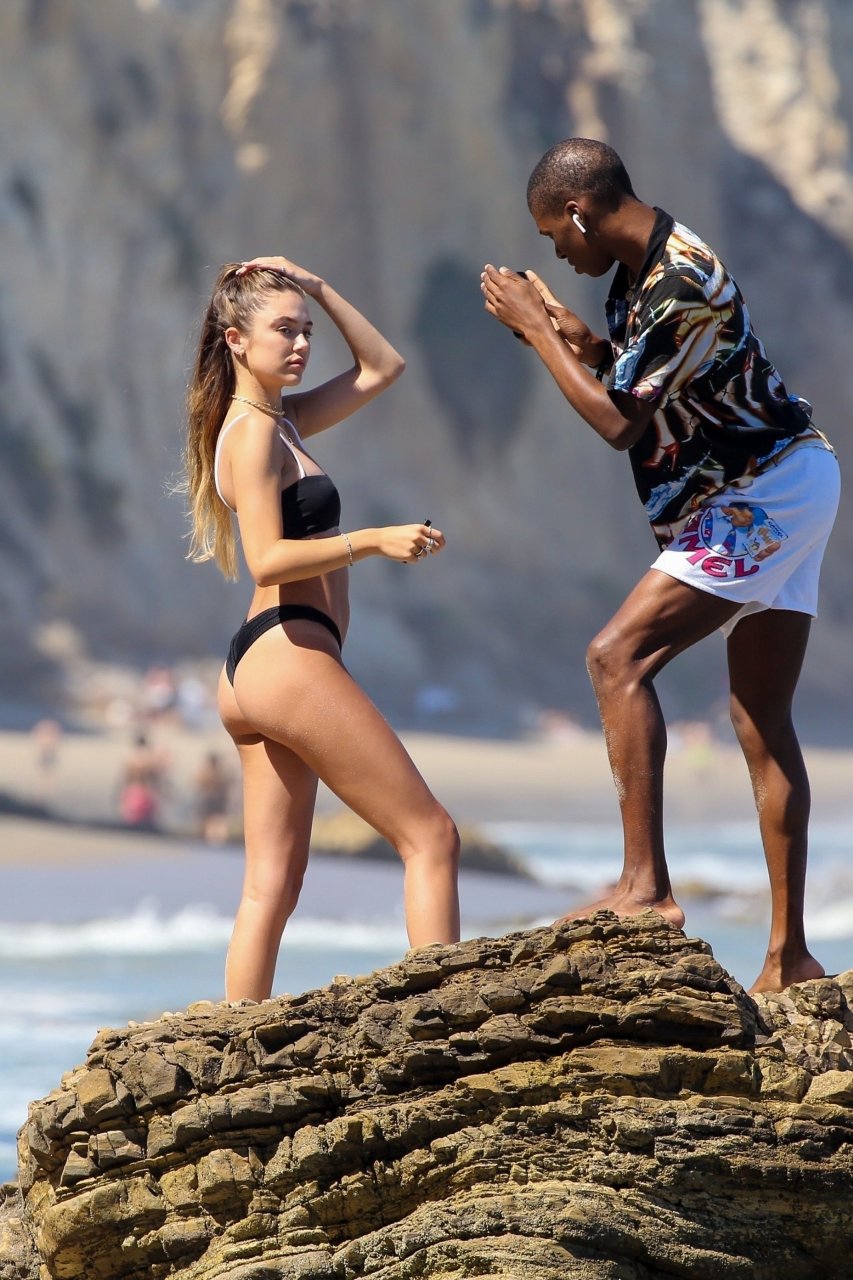 Le figlie delle star della realtà Lisa e Harry Hamlin, Delilah Hamlin (20), appare impeccabile in un bikini bianco e nero durante un servizio fotografico amatoriale con un amico a Malibu, 15/07/2018. L’amico di Delilah scatta foto mentre le dirige le pose con un telefono cellulare. I due condividono qualche risata mentre i fotografi scattano foto con loro.