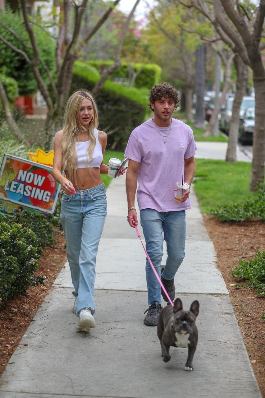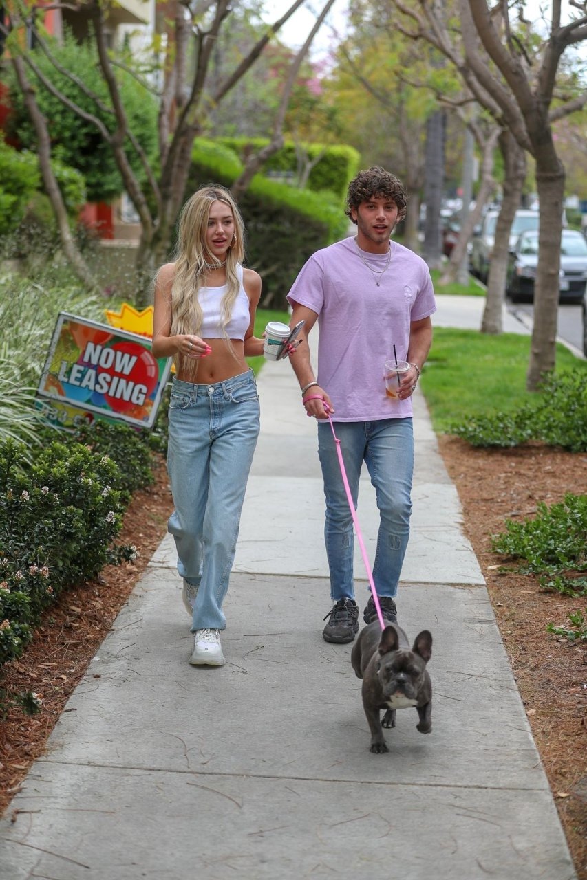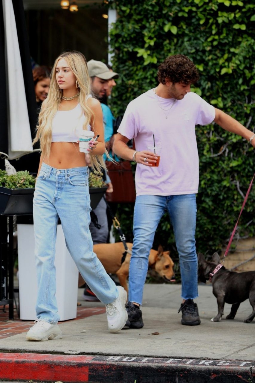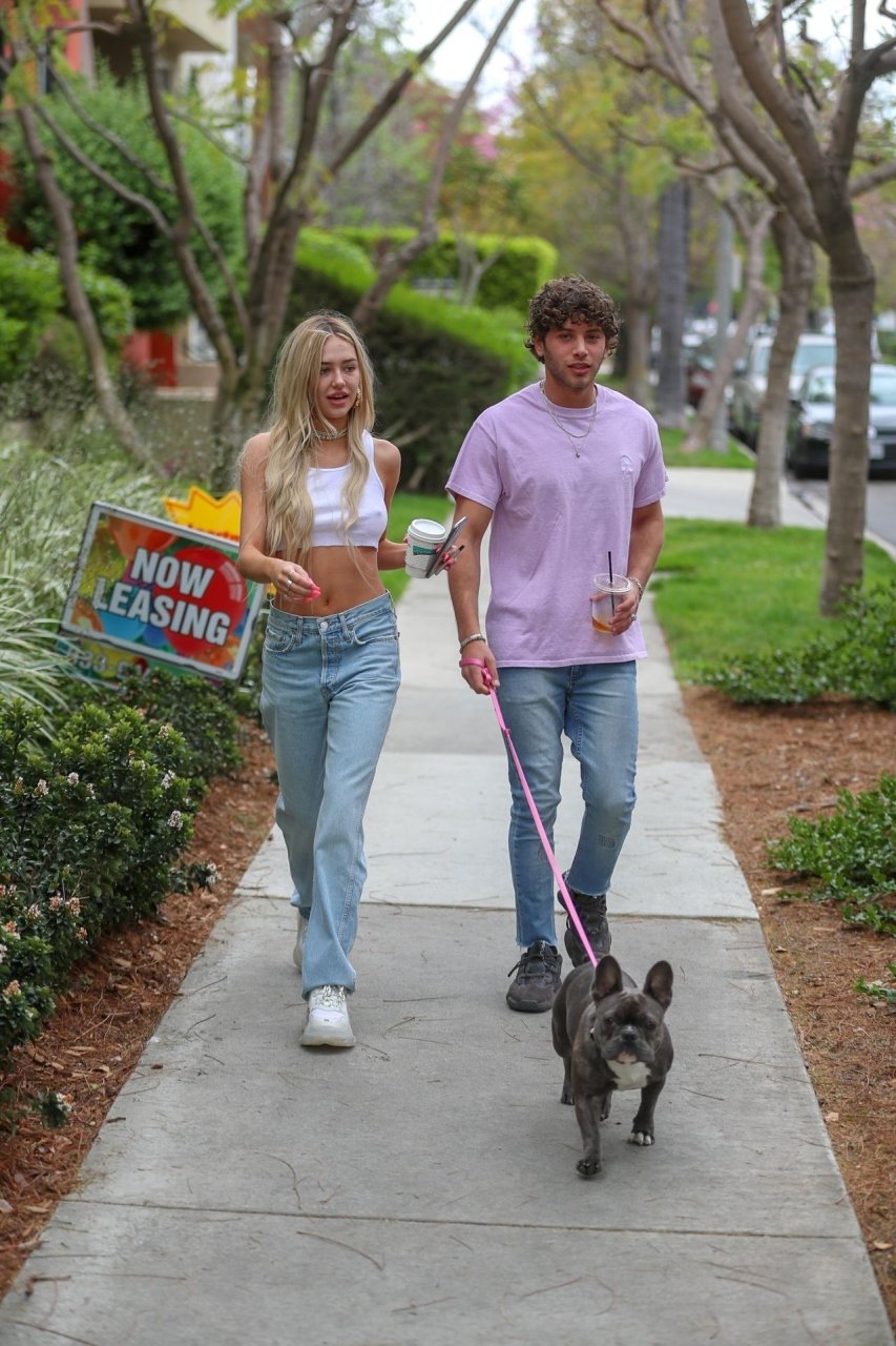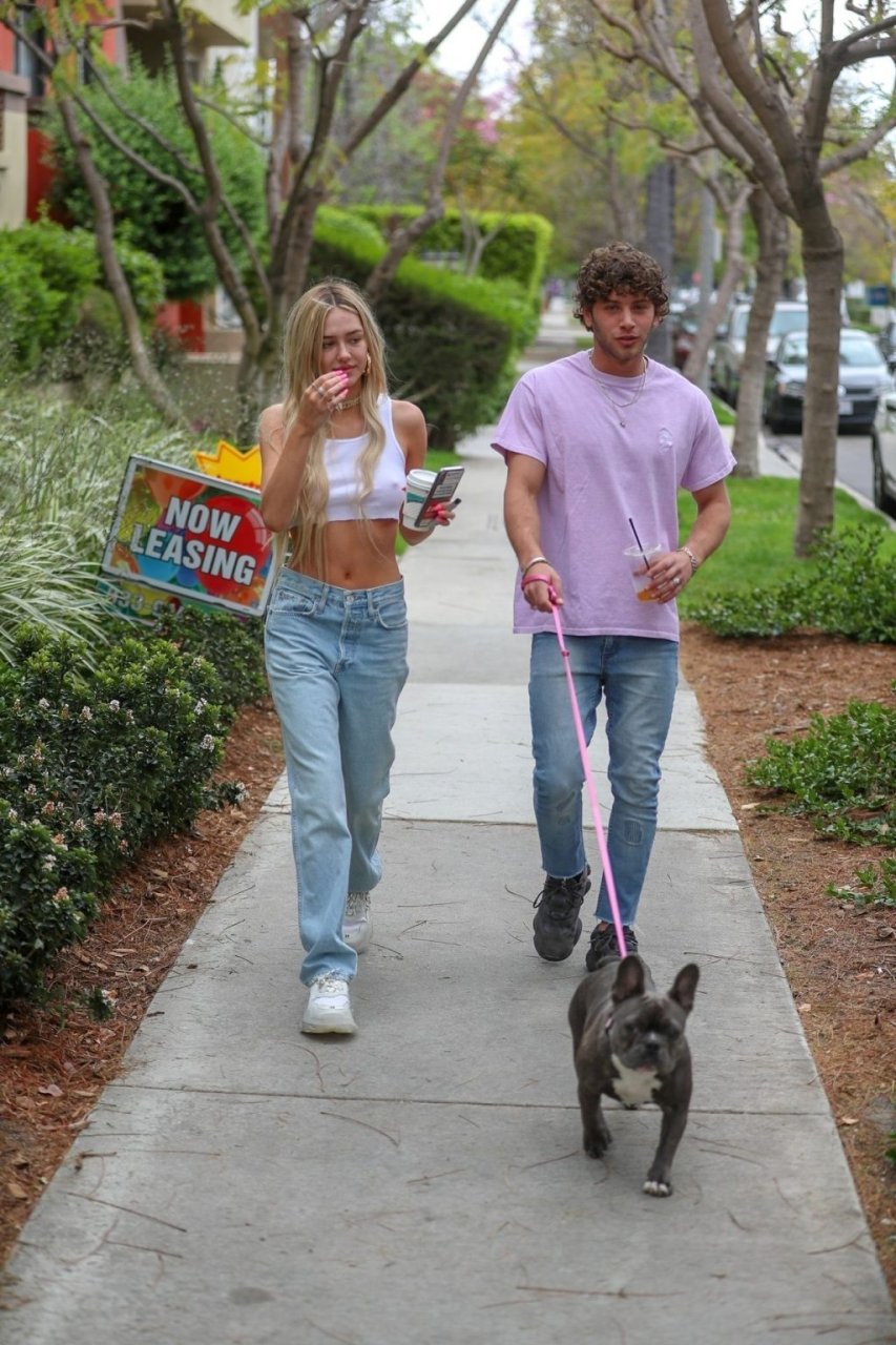 I due sono usciti con sneakers di design, Delilah ha scelto le Balenciaga e Cully indossava le Yeezy 500. Delilah tiene in mano un caffè mentre i due passeggiano per West Hollywood dopo aver mangiato, 16/04/2019.
