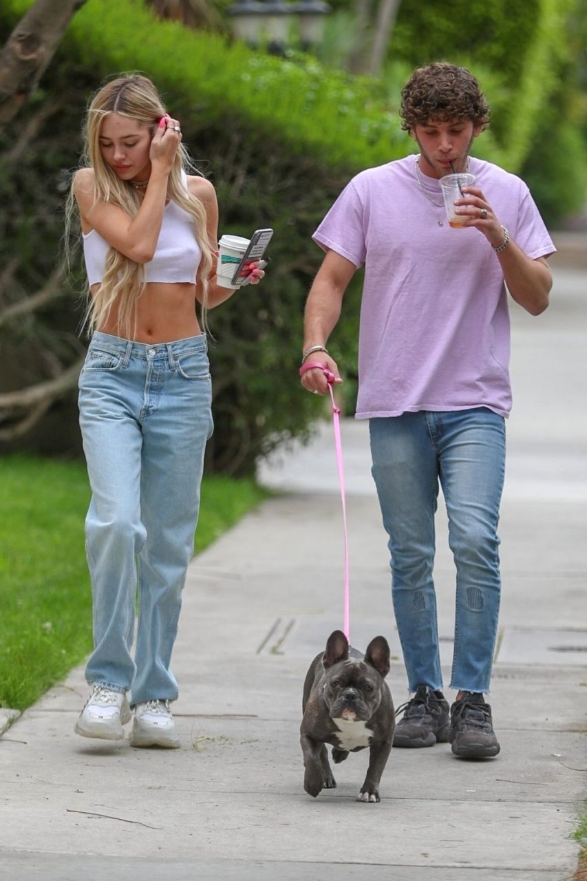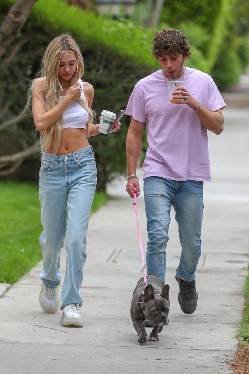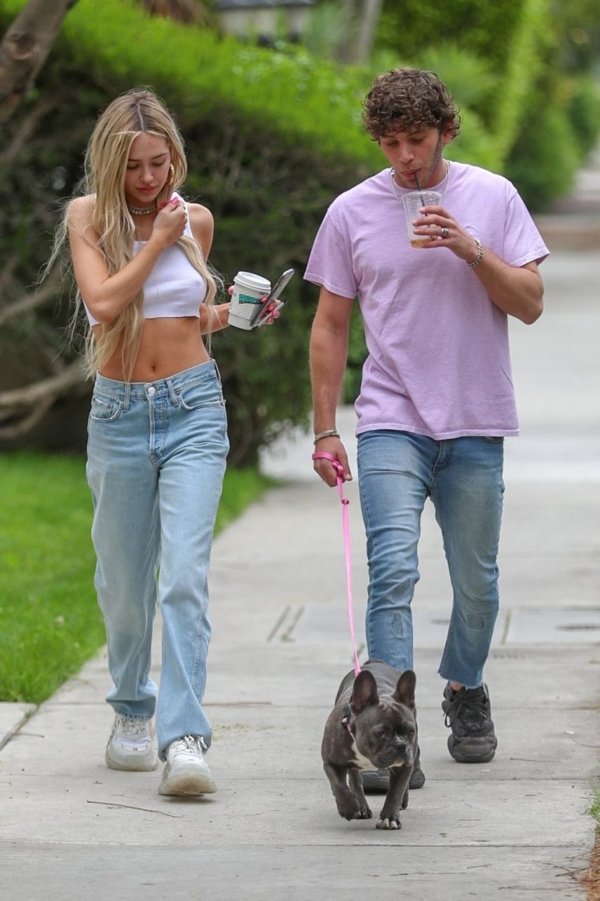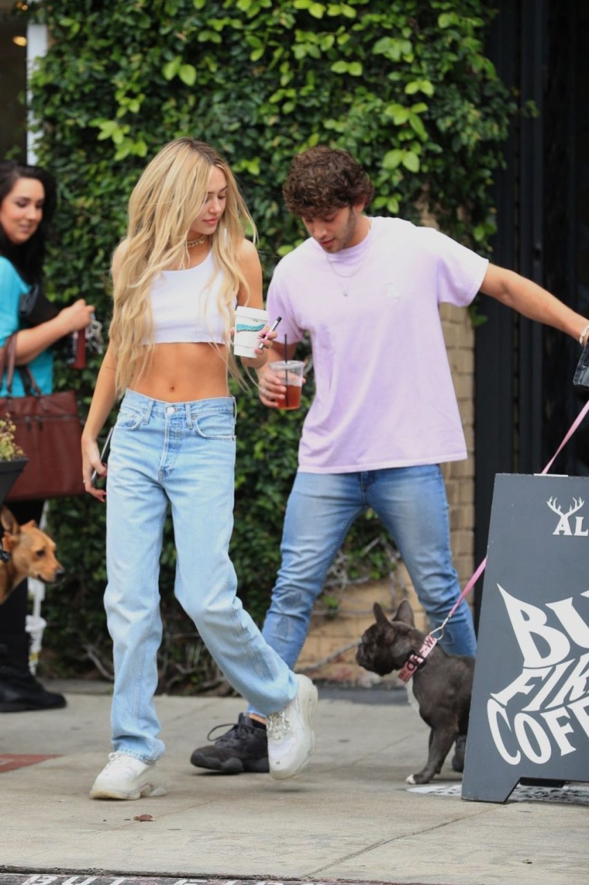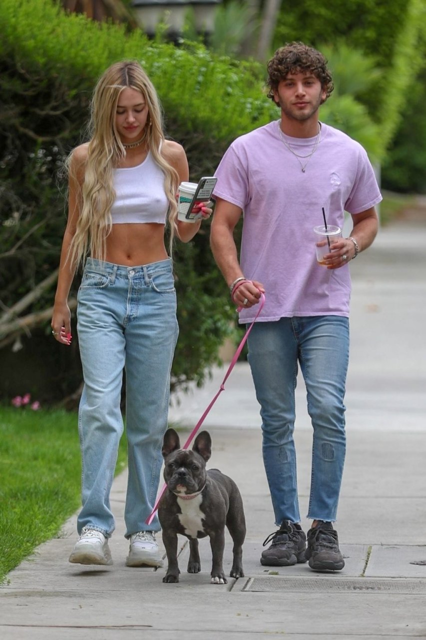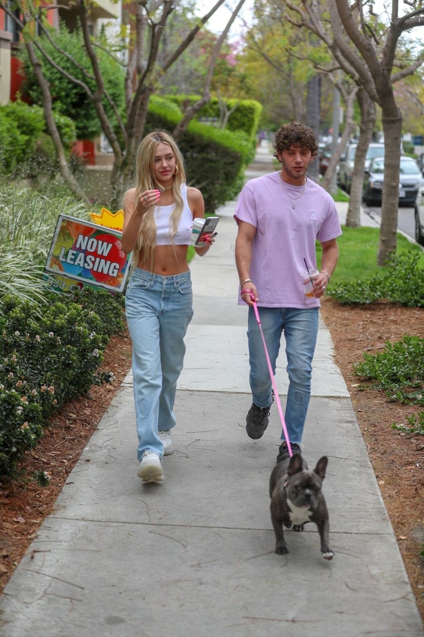I due sono usciti con sneakers di design, Delilah ha scelto le Balenciaga e Cully indossava le Yeezy 500. Delilah tiene in mano un caffè mentre i due passeggiano per West Hollywood dopo aver mangiato, 16/04/2019.