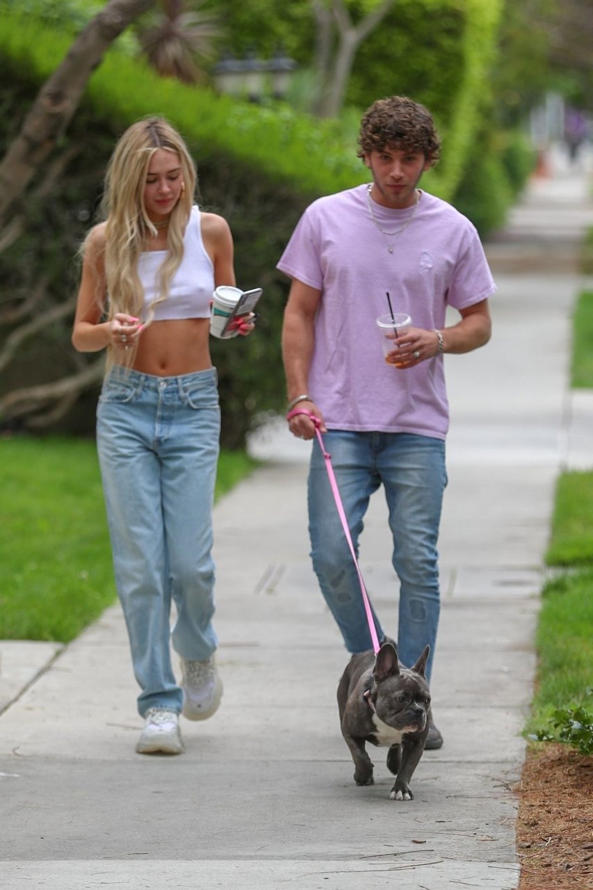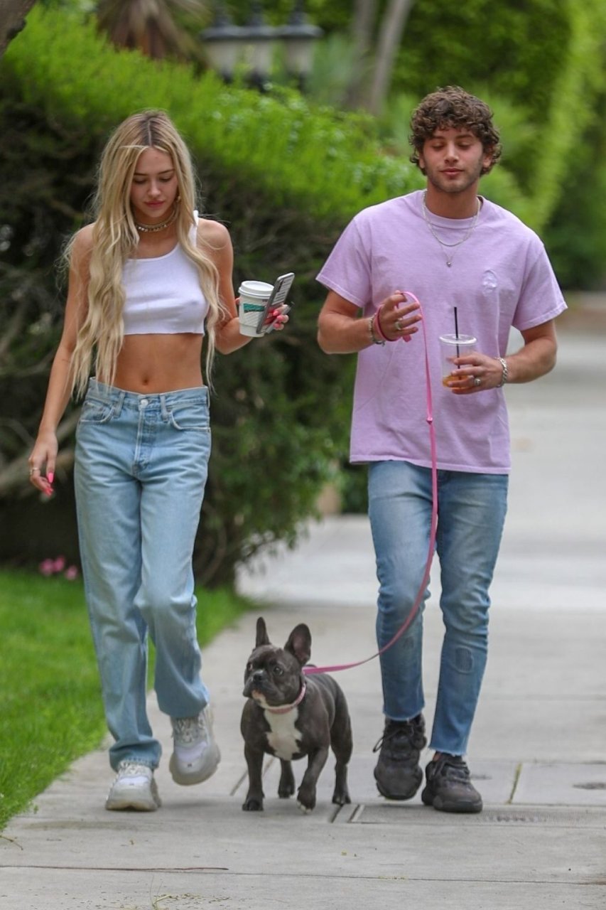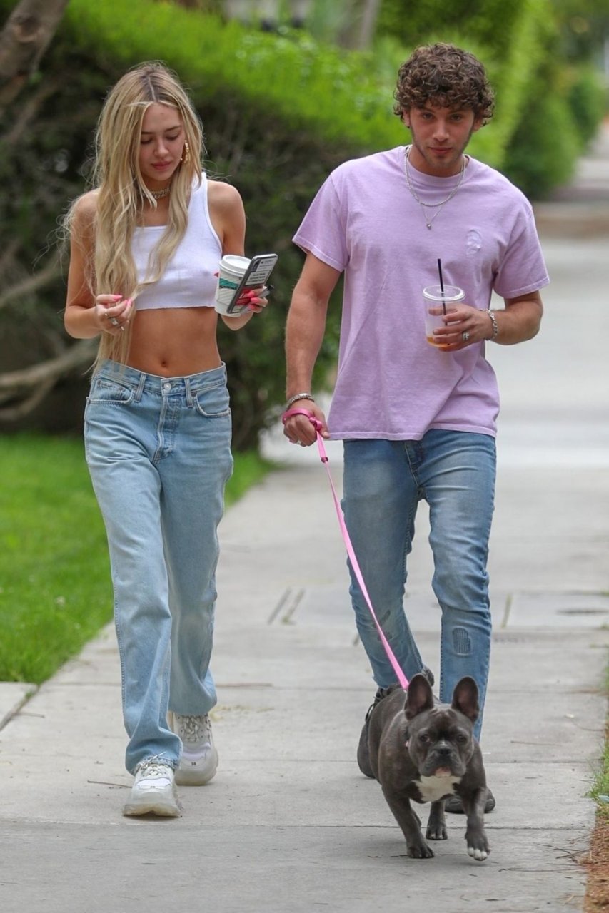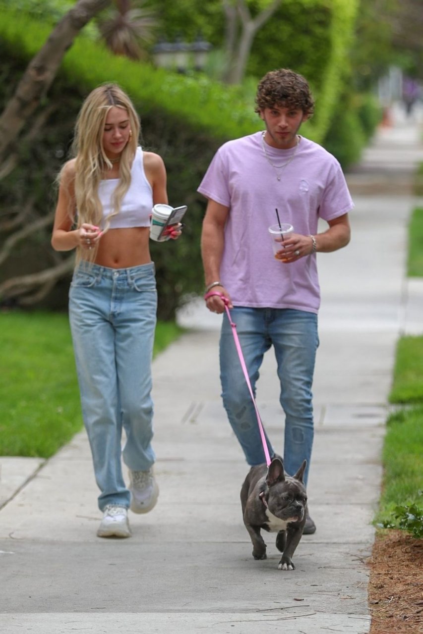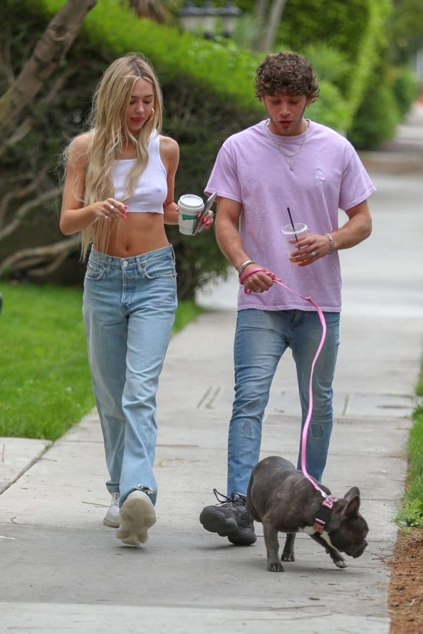I due sono usciti con sneakers di design, Delilah ha scelto le Balenciaga e Cully indossava le Yeezy 500. Delilah tiene in mano un caffè mentre i due passeggiano per West Hollywood dopo aver mangiato, 16/04/2019.