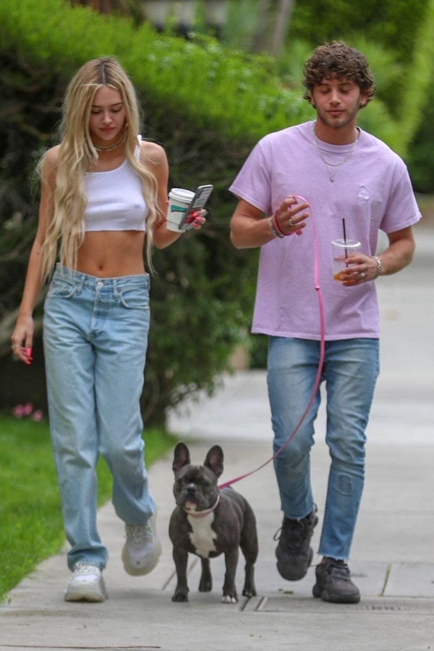 Modella senza reggiseno Delilah Belle Hamlin (20) e il partner Cully Smoller godono della colazione in compagnia del loro bulldog francese.