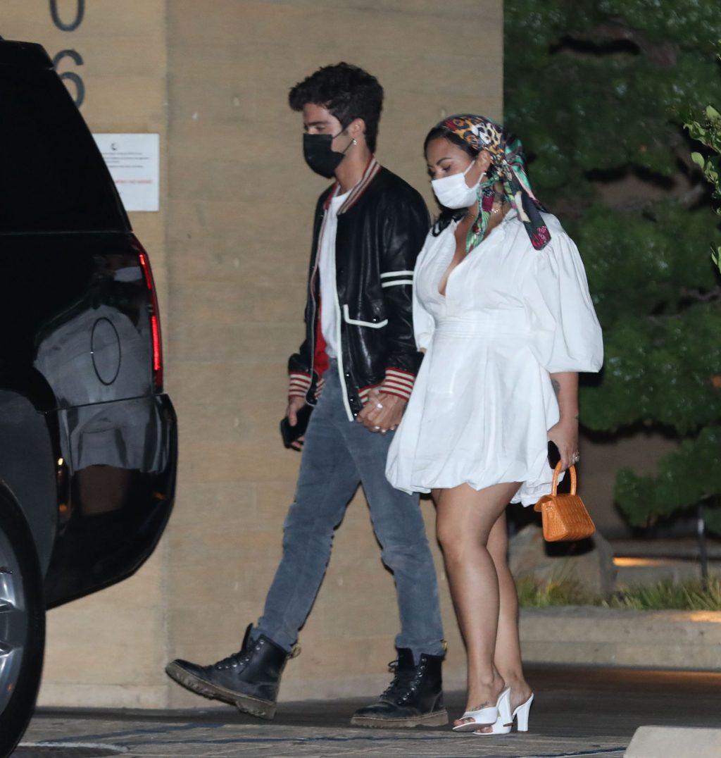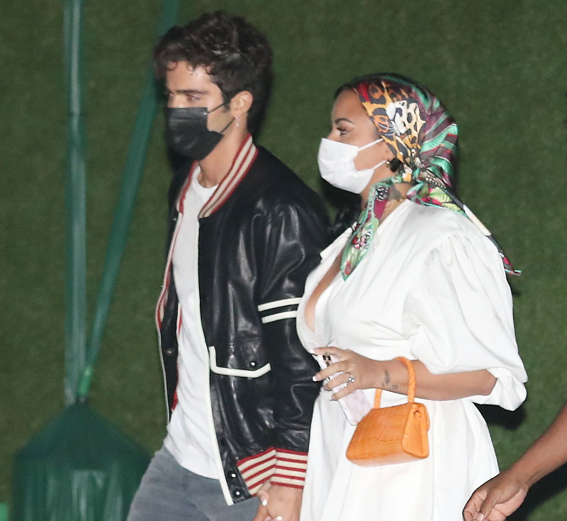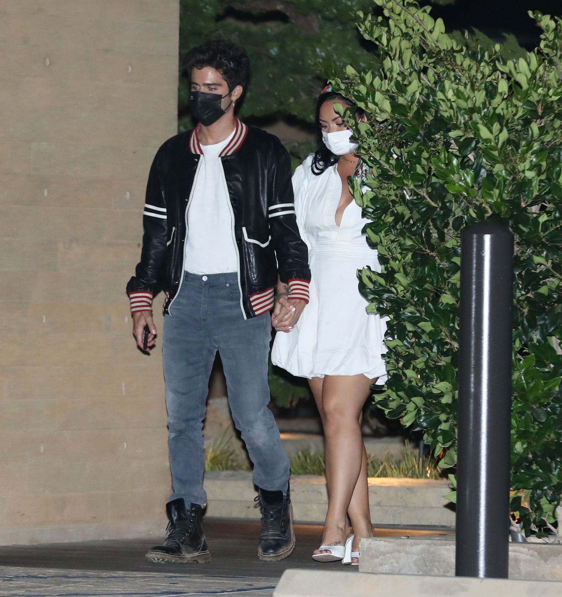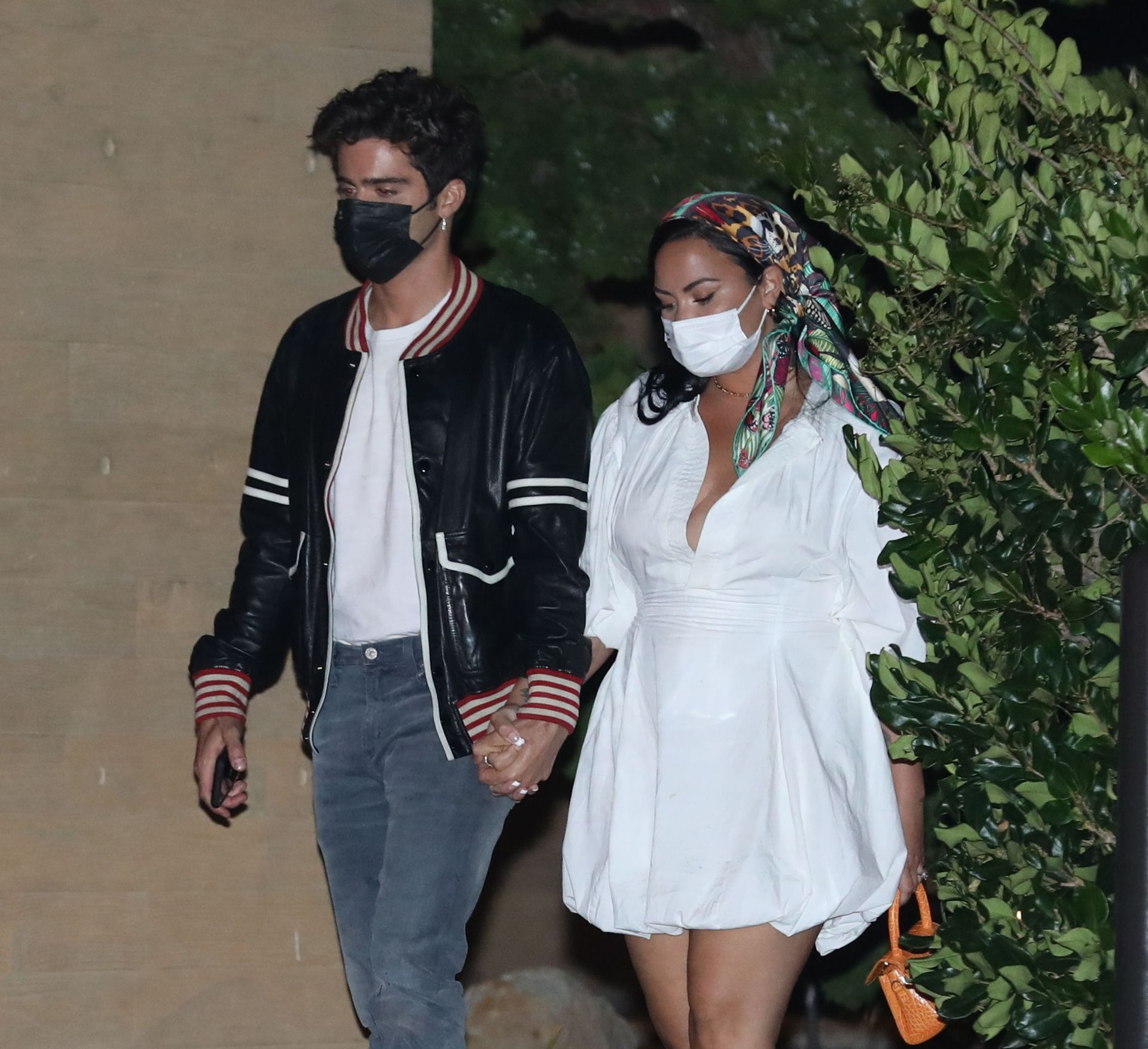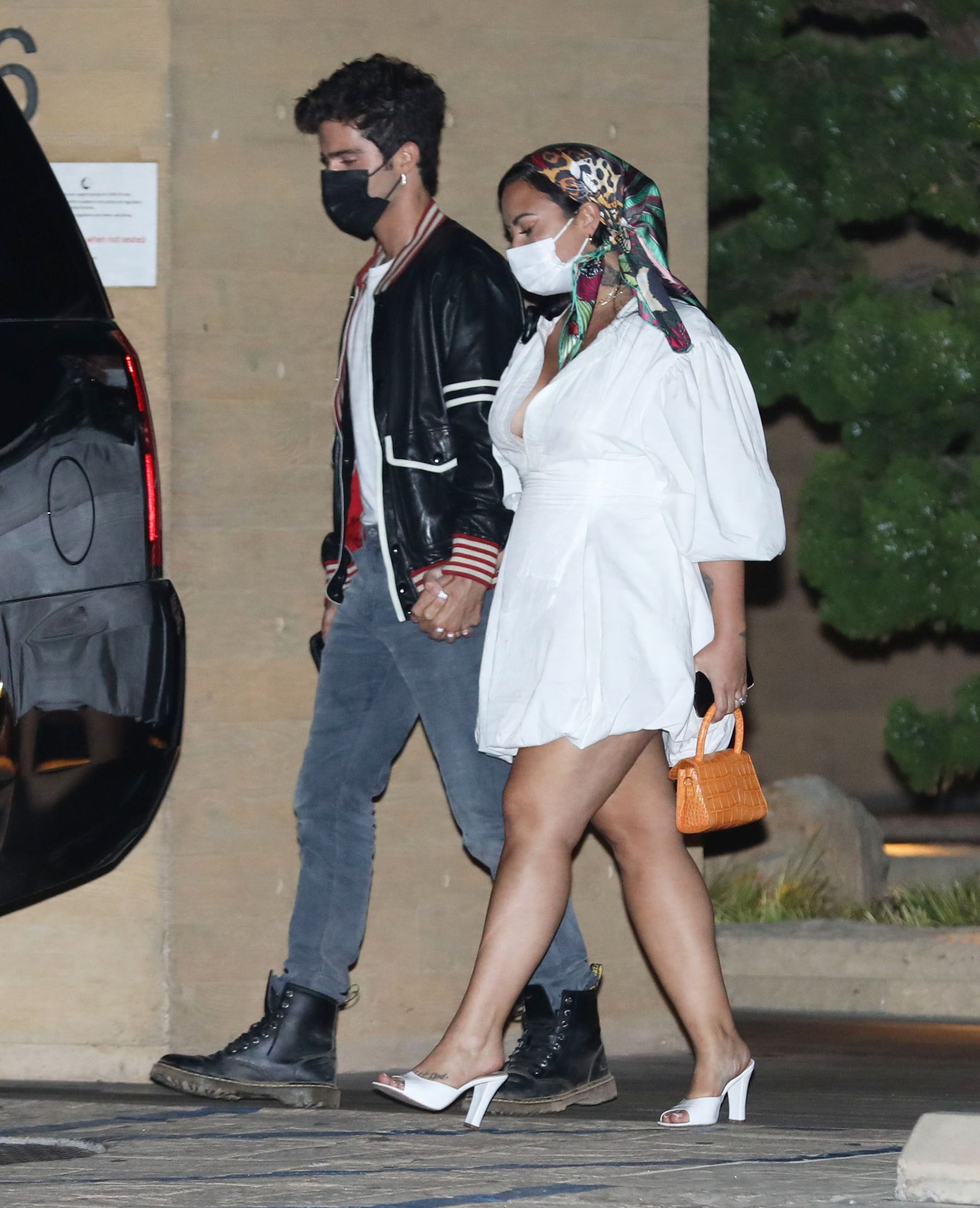 La cantante Demi Lovato e il suo fidanzato Max Ehrich si tengono per mano mentre arrivano per una cena tardiva al Nobu di Malibu, 29/08/2020.