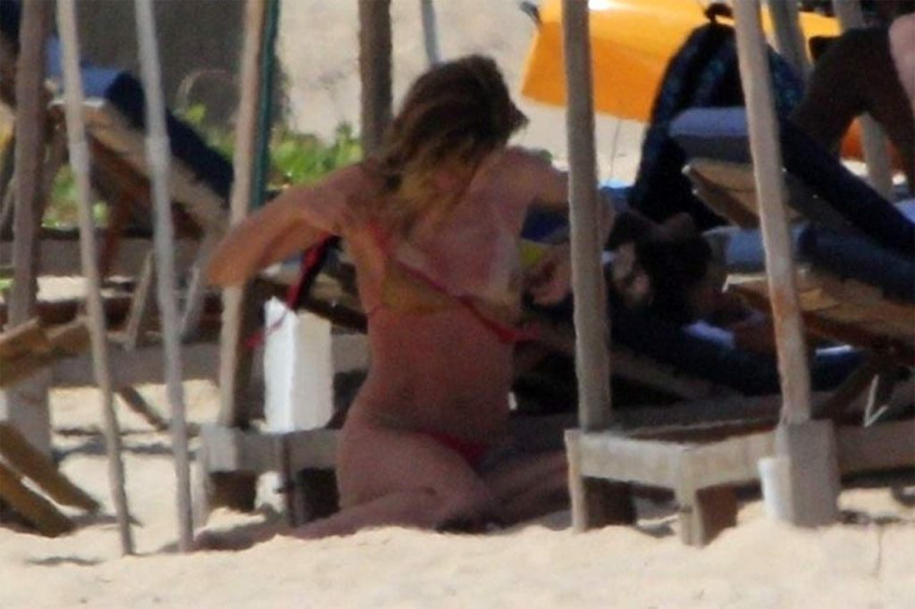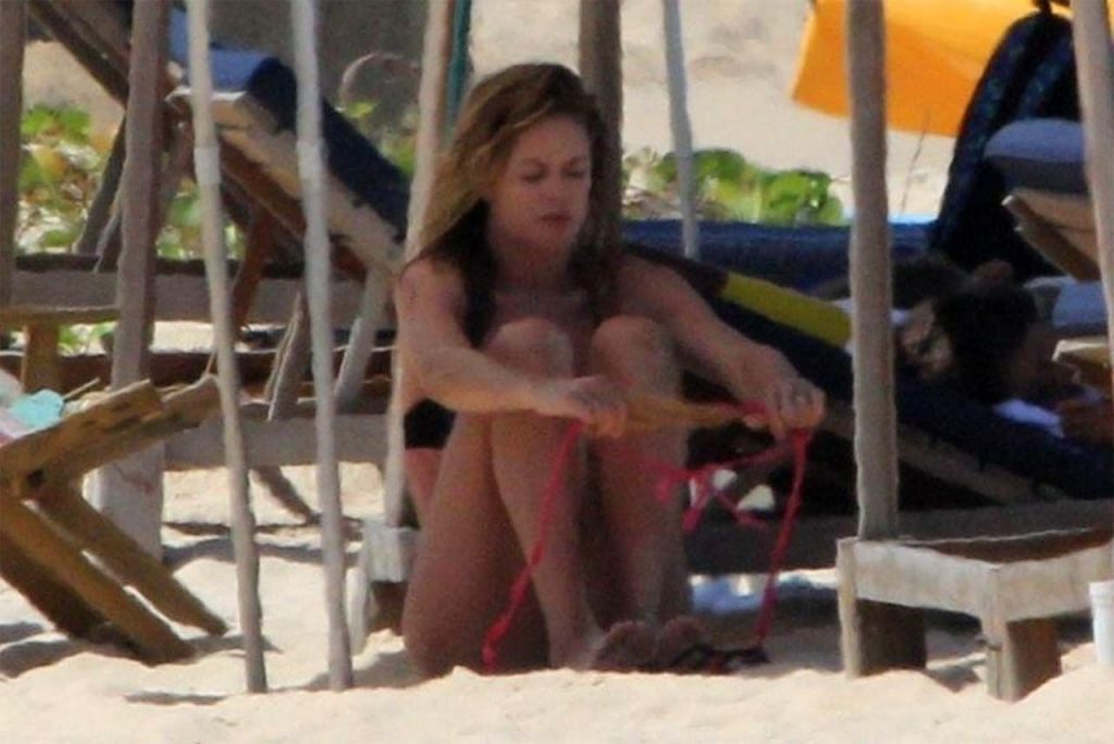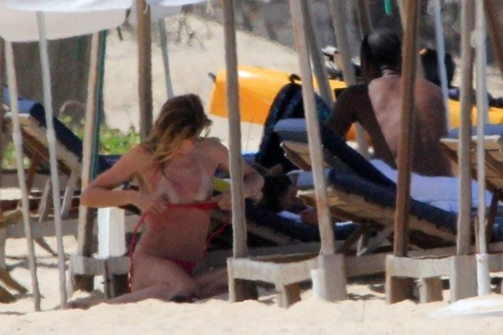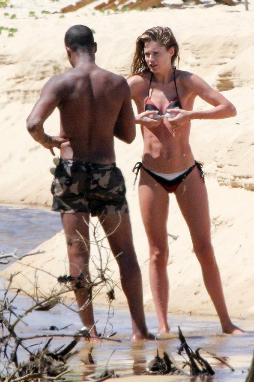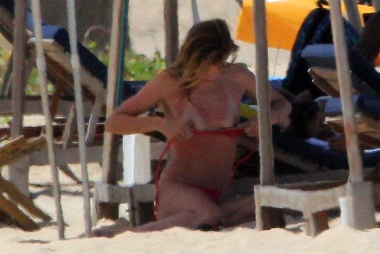Check out how supermodel Doutzen Kroes showed her nude tits on the beach in Bahia! She was hanging with some guy, and he photographed her while Kroes was posing! Then she was changing her bikini to another one, and this was a crucial moment! Her tits were naked so that the paparazzi could catch everything!