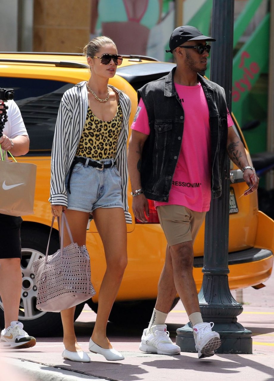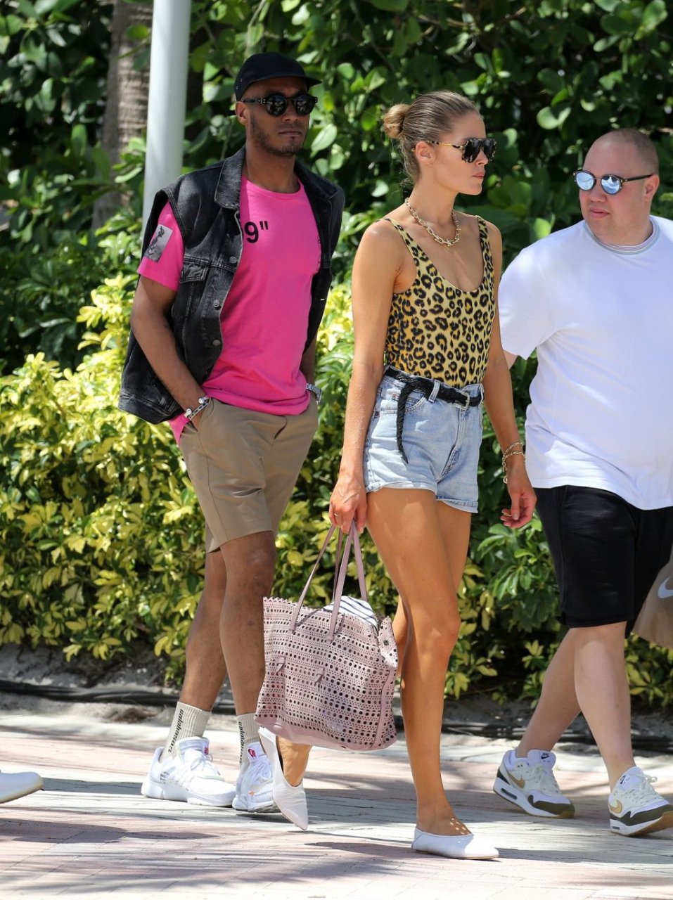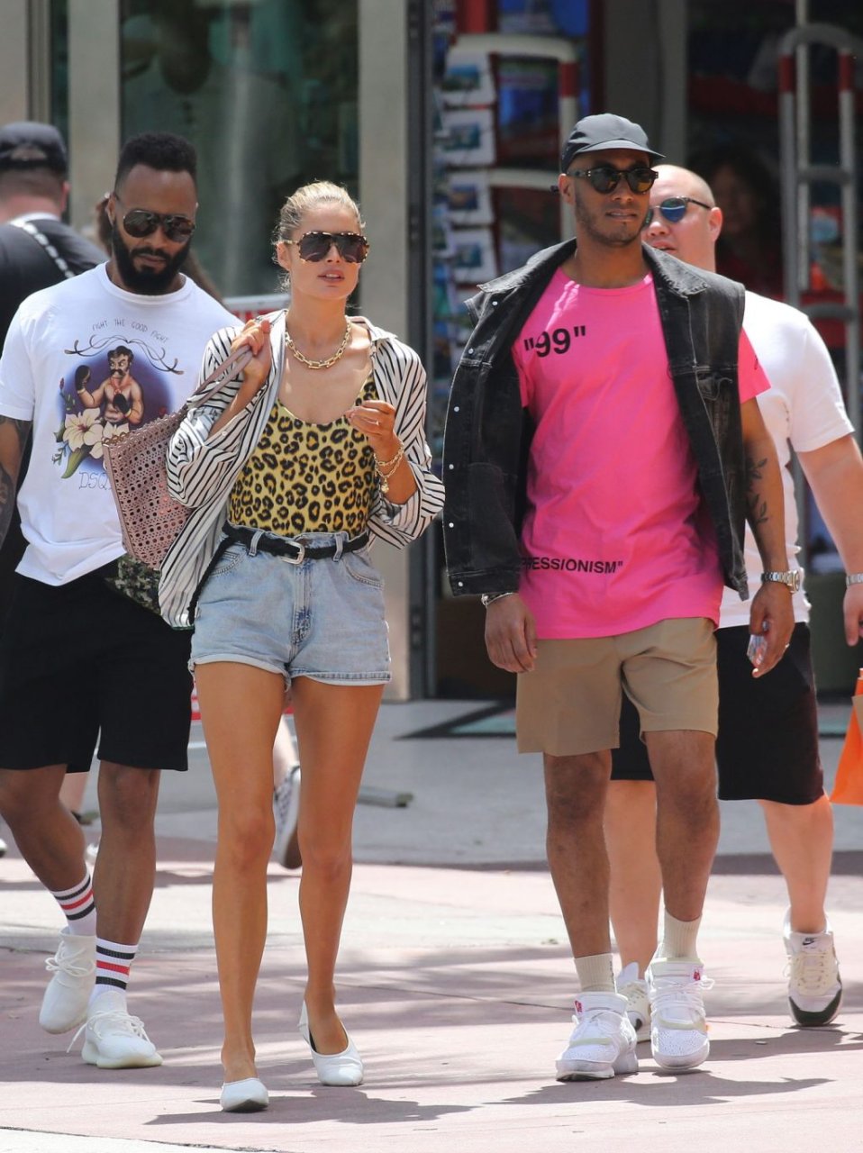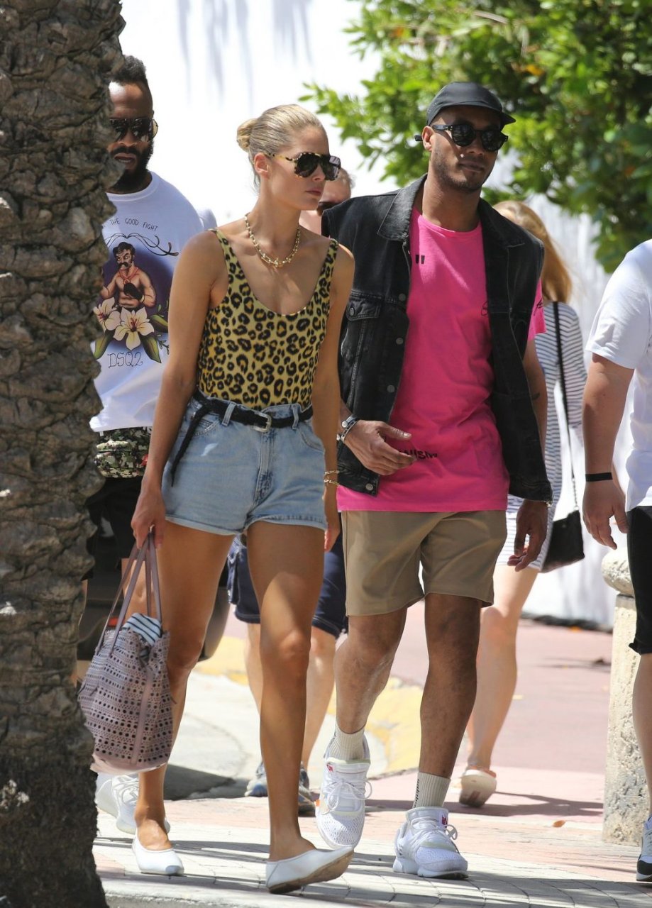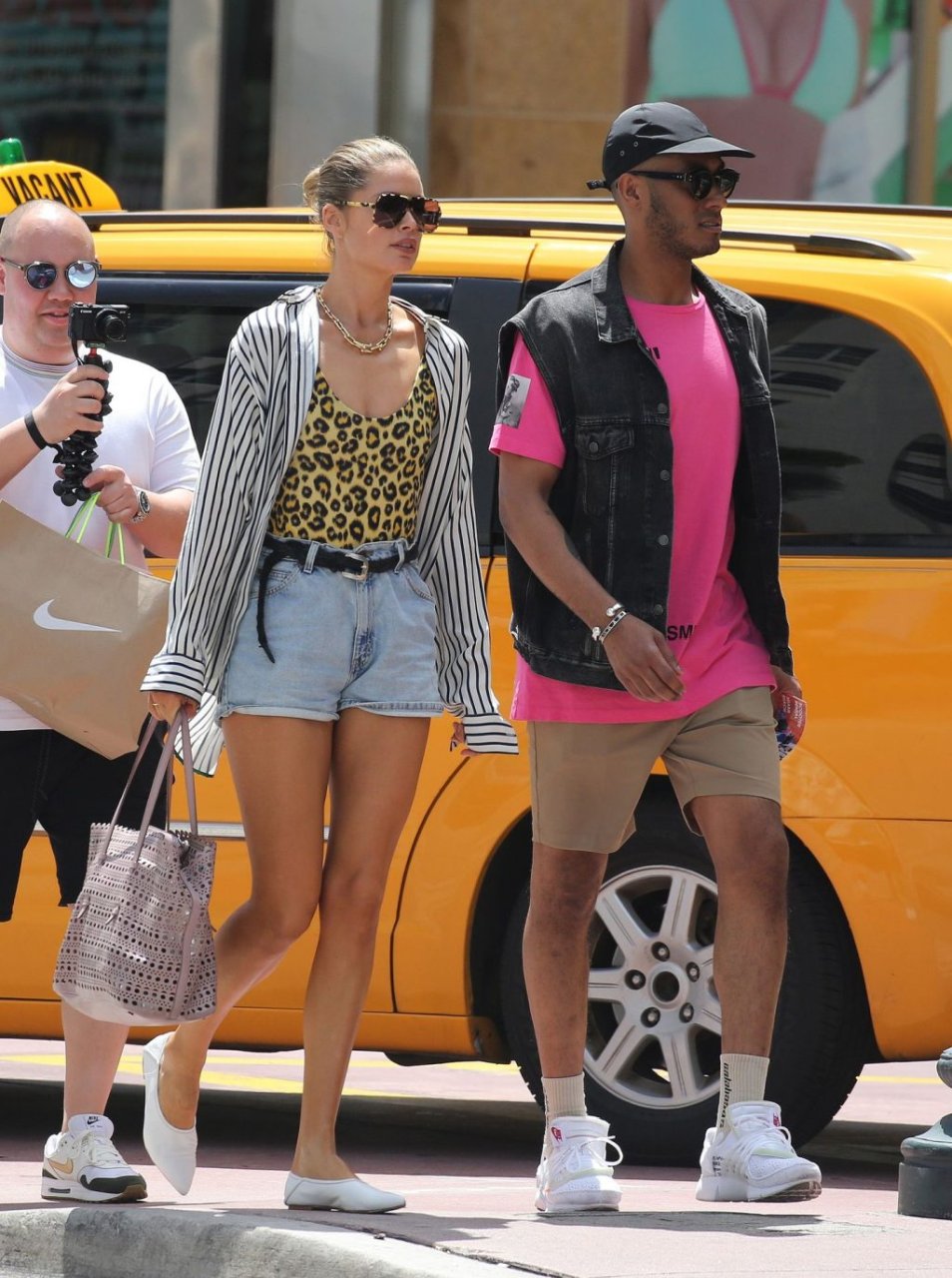 La supermodella Doutzen Kroes indossa dei pantaloncini di jeans e gioielli vistosi sopra il suo costume da bagno per una passeggiata in città con il marito Sunnery James a Miami, 29/03/2019.