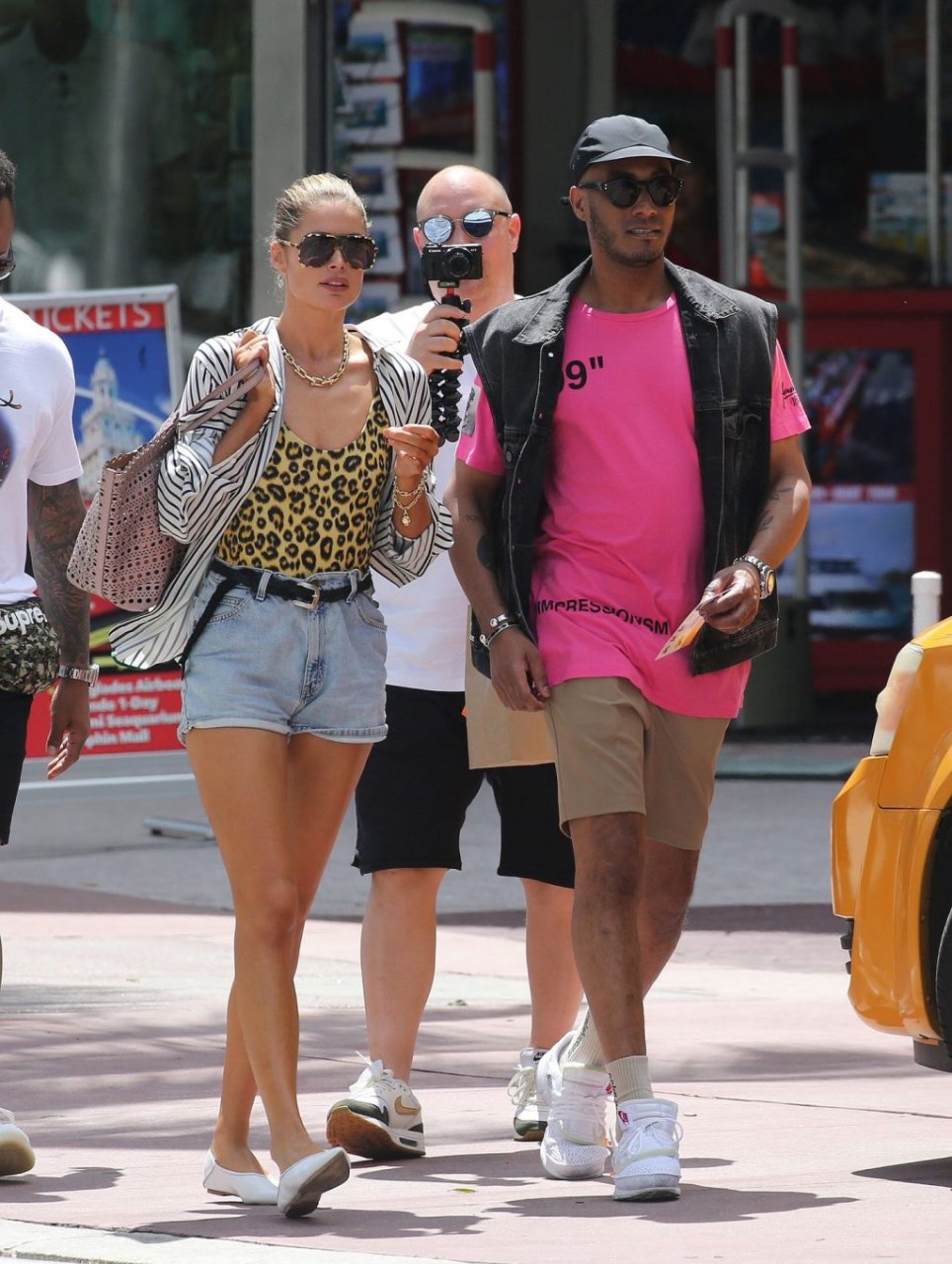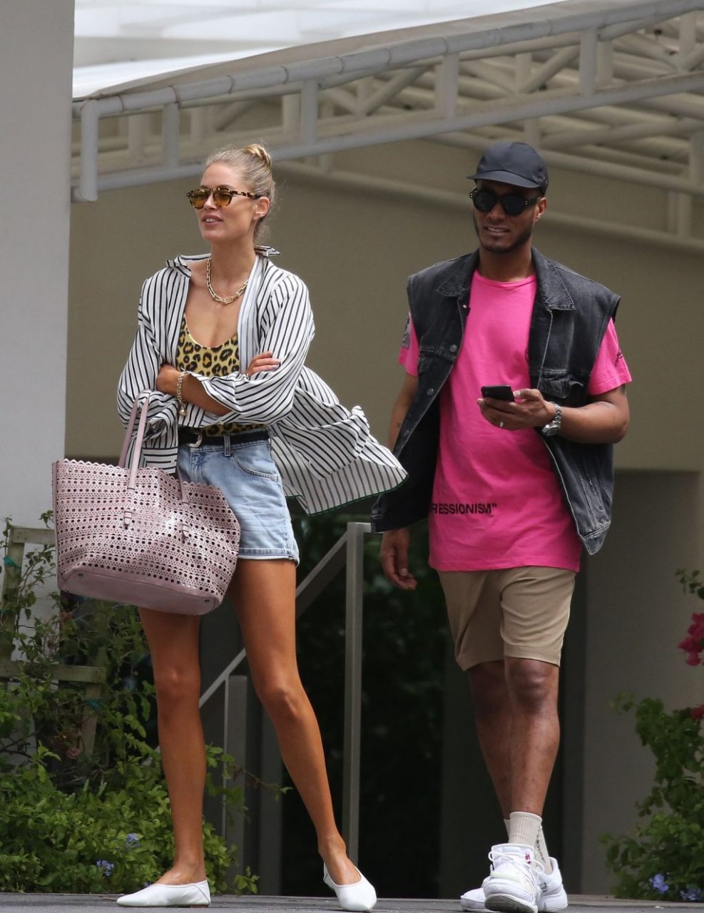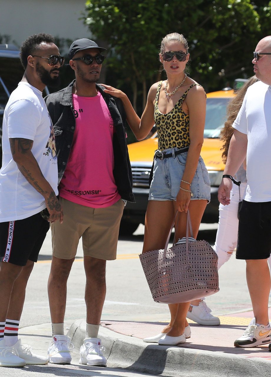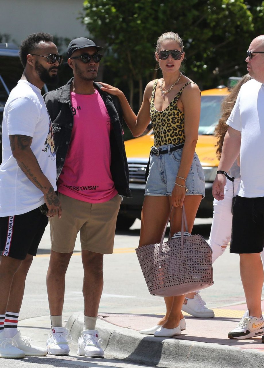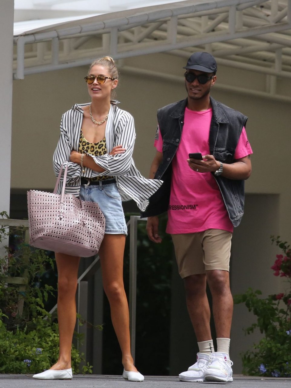 La supermodella Doutzen Kroes indossa dei pantaloncini di jeans e gioielli vistosi sopra il suo costume da bagno per una passeggiata in città con il marito Sunnery James a Miami, 29/03/2019.