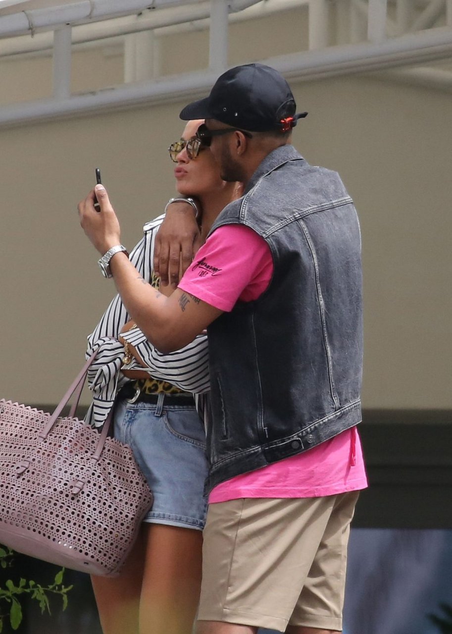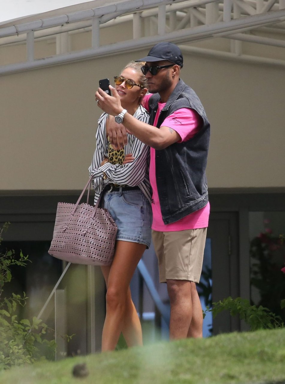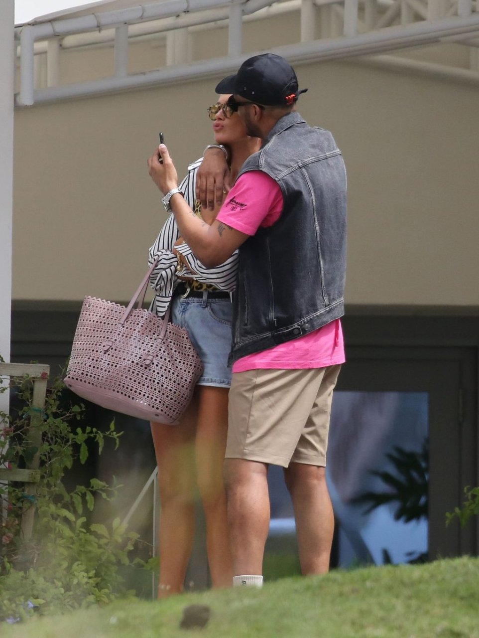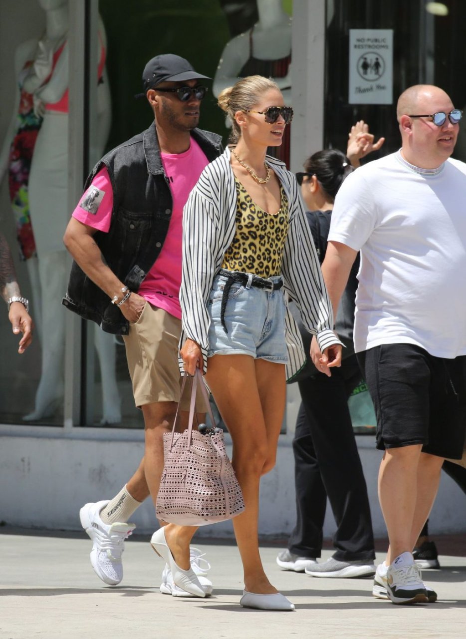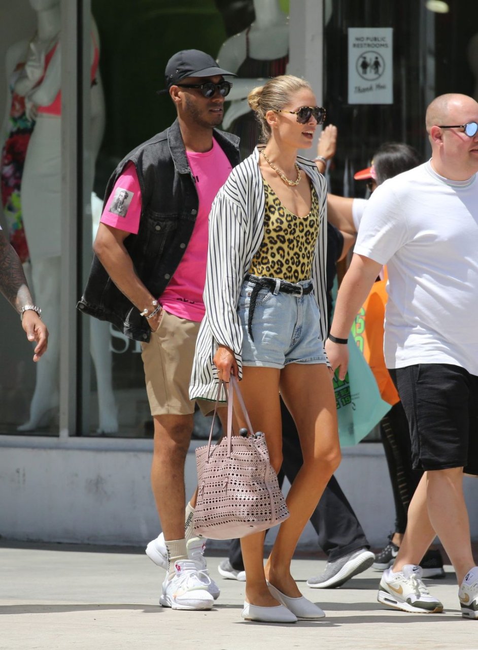 La supermodella Doutzen Kroes indossa dei pantaloncini di jeans e gioielli vistosi sopra il suo costume da bagno per una passeggiata in città con il marito Sunnery James a Miami, 29/03/2019.