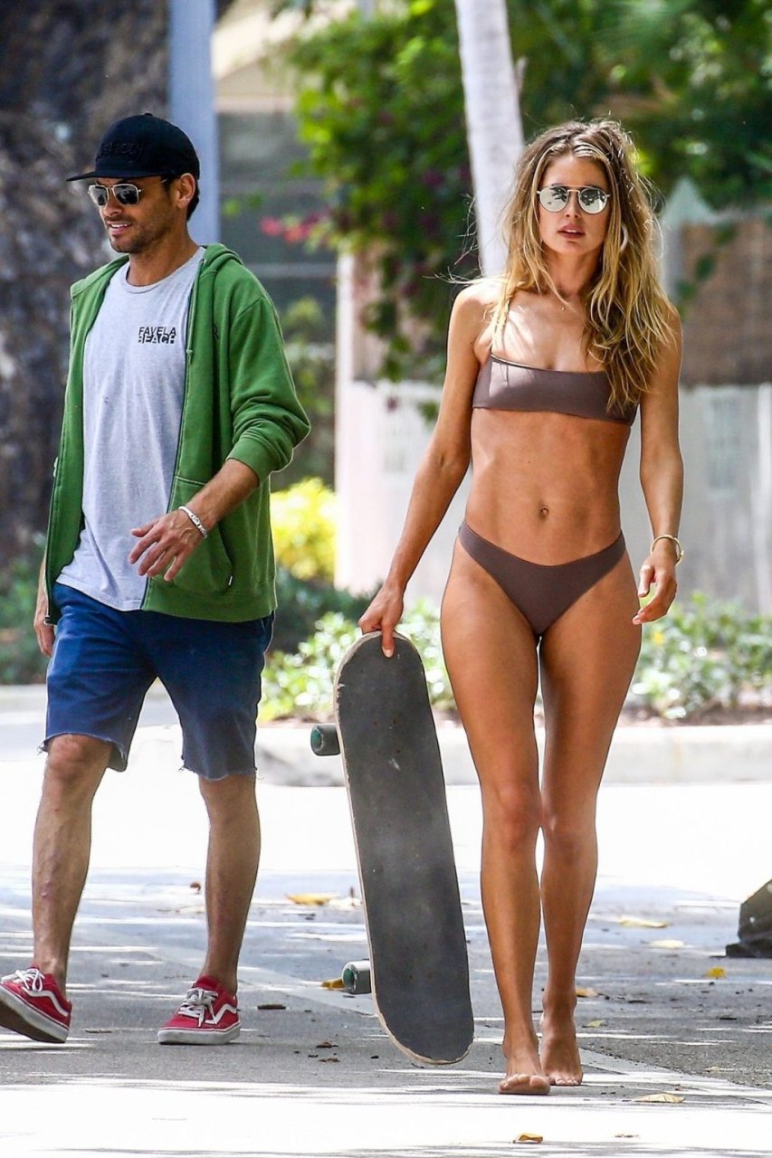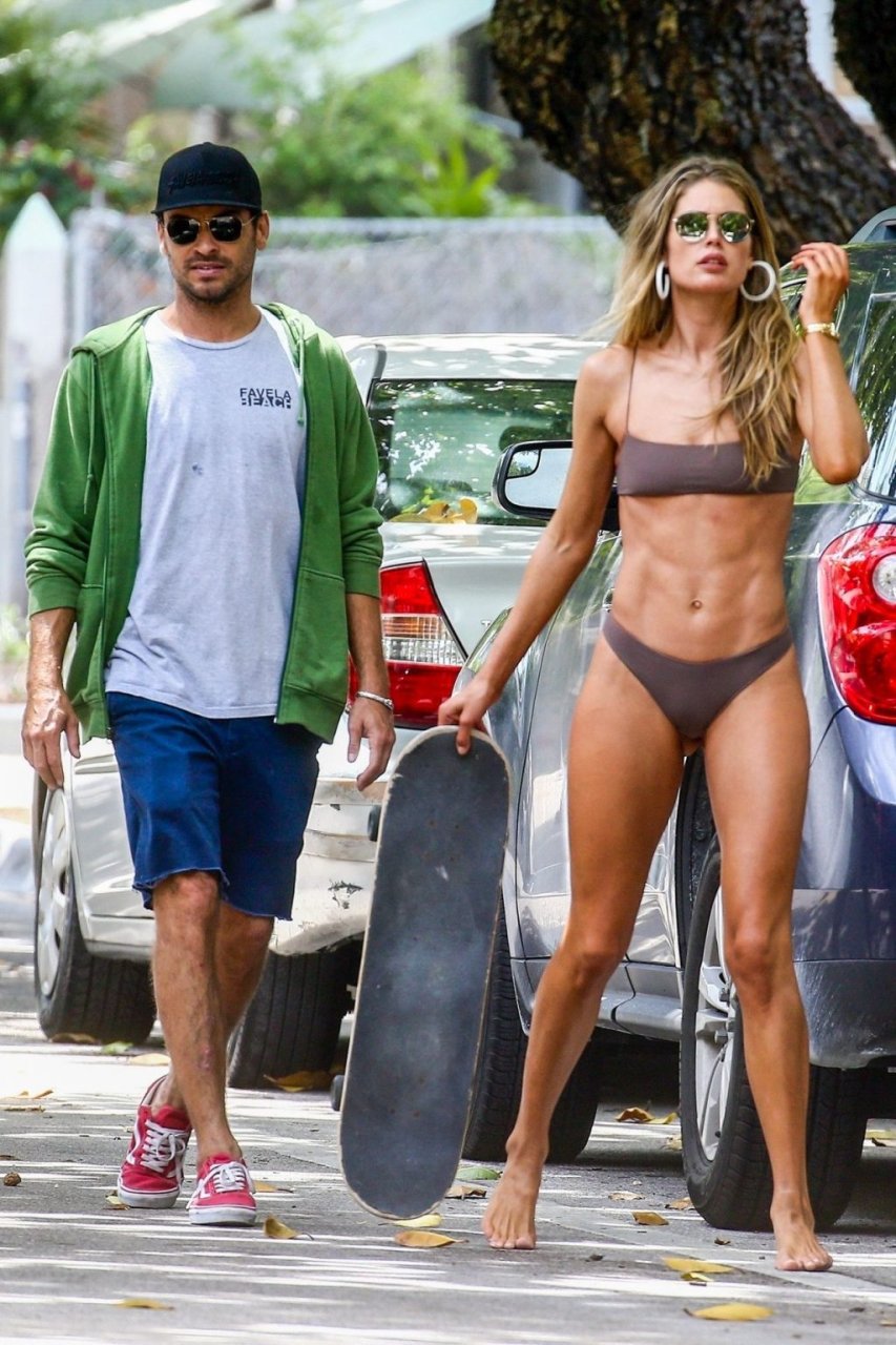 La supermodella olandese, madre e attivista Doutzen Kroes, insieme a suo marito Sunnery James, posa mentre cavalca uno skateboard in un sexy bikini durante un servizio fotografico per le strade di Miami, 28/03/2019.