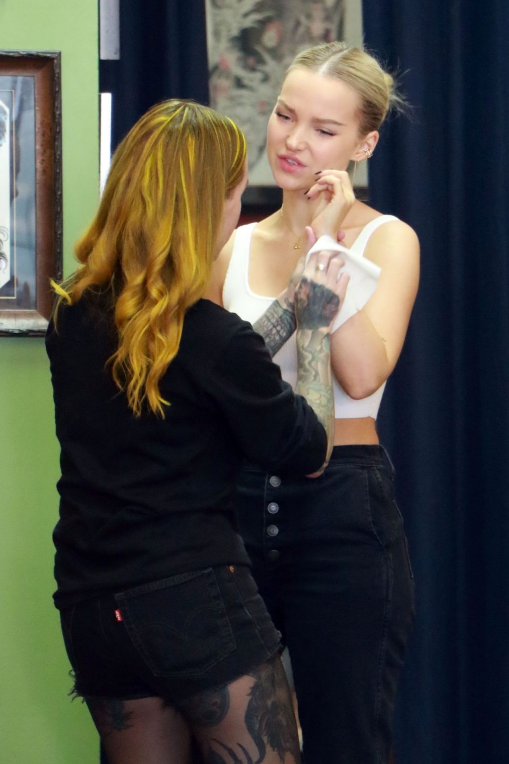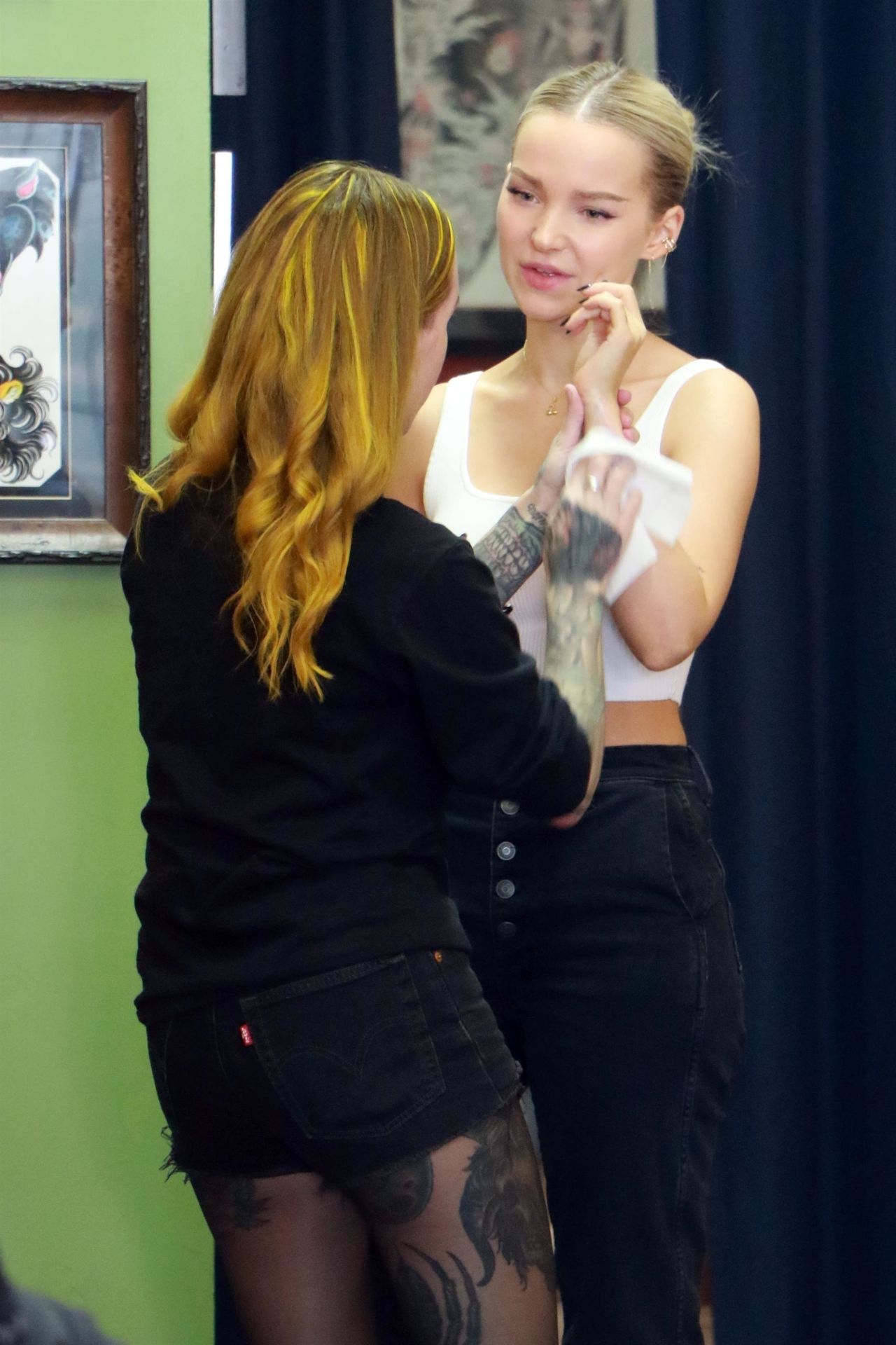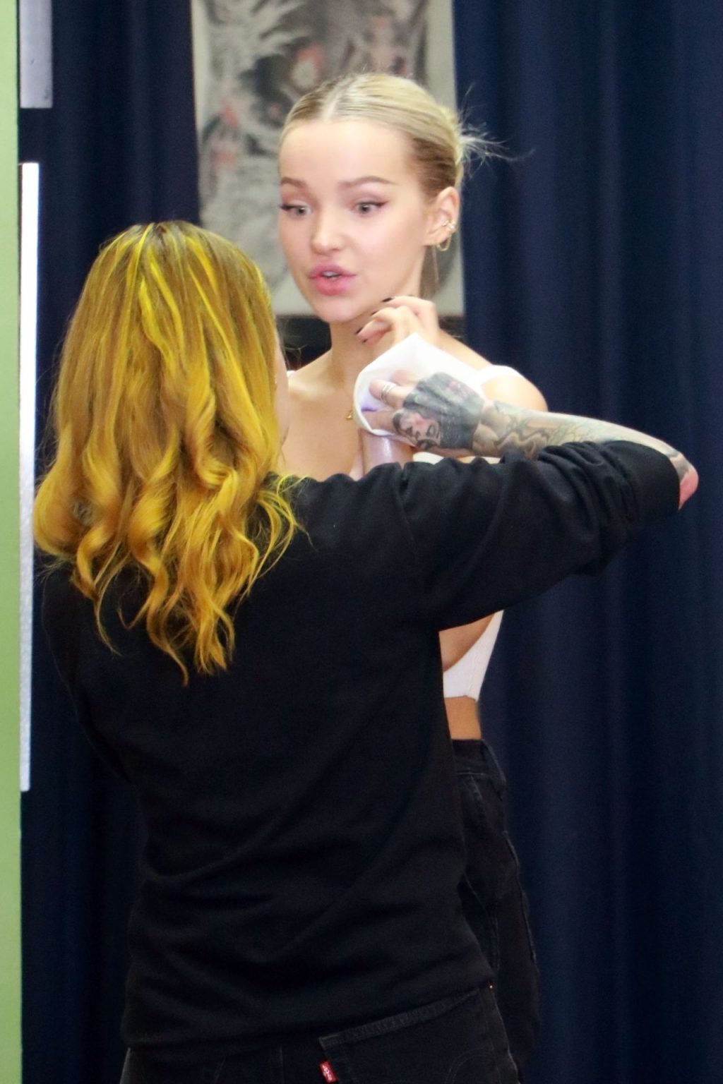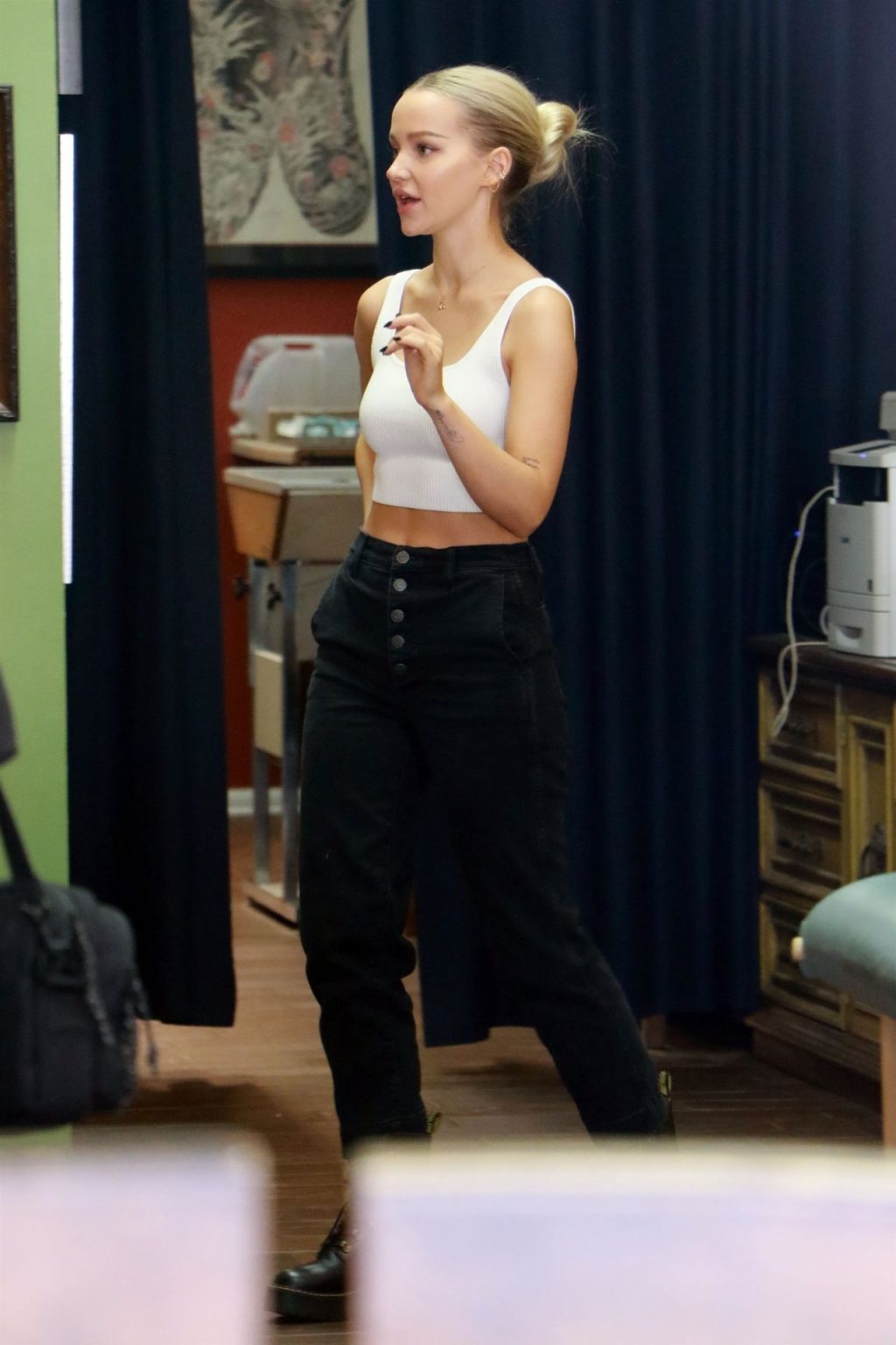Dove Cameron mostra la sua figura tonica con un top corto bianco mentre si prepara per un nuovo tatuaggio e gira una scena in un negozio di tatuaggi locale giovedì.
