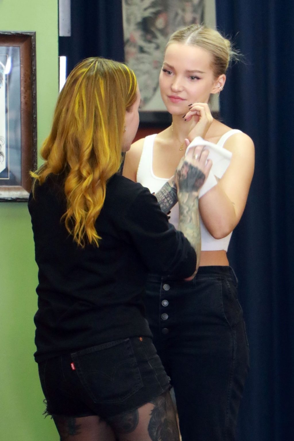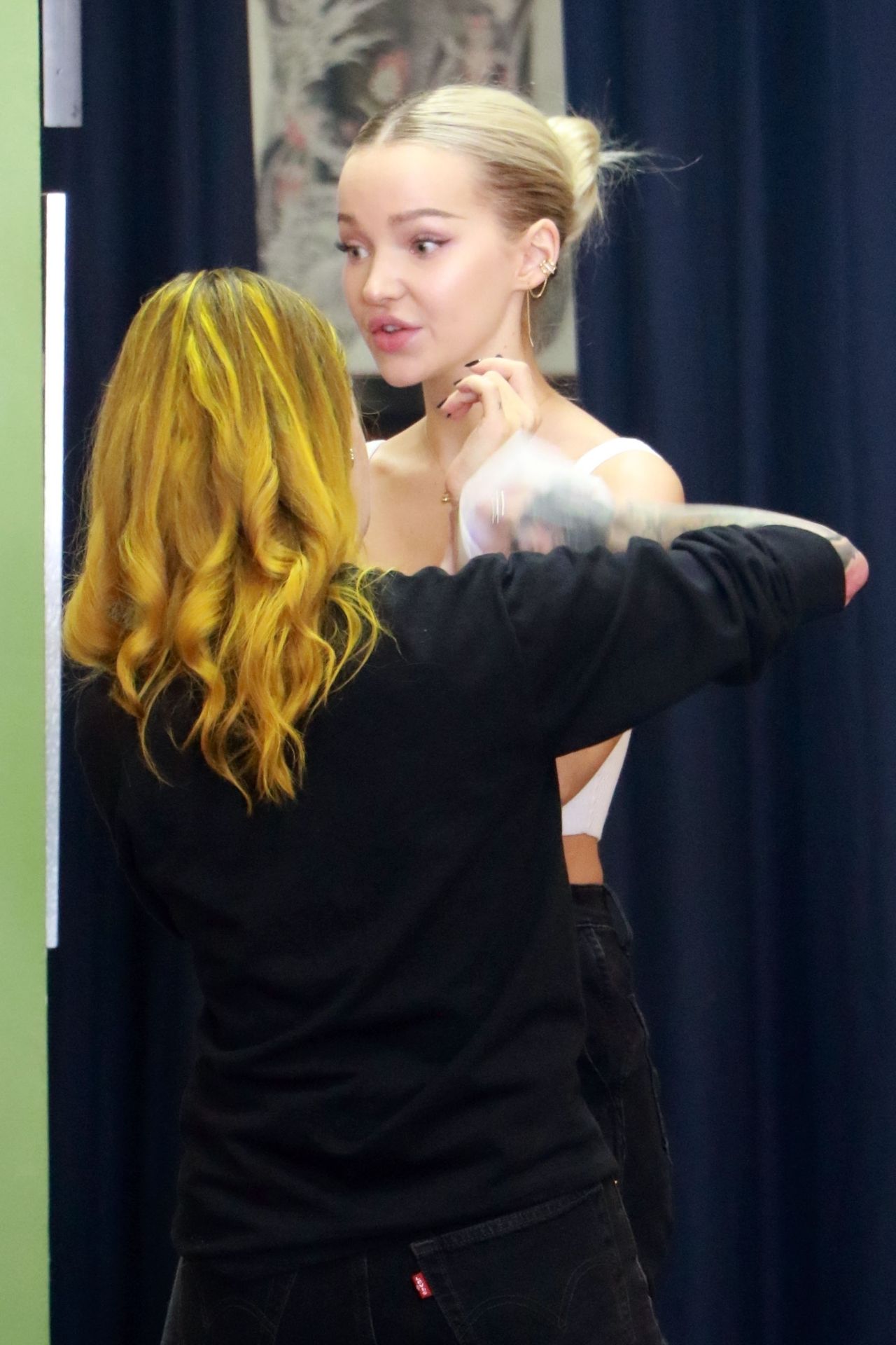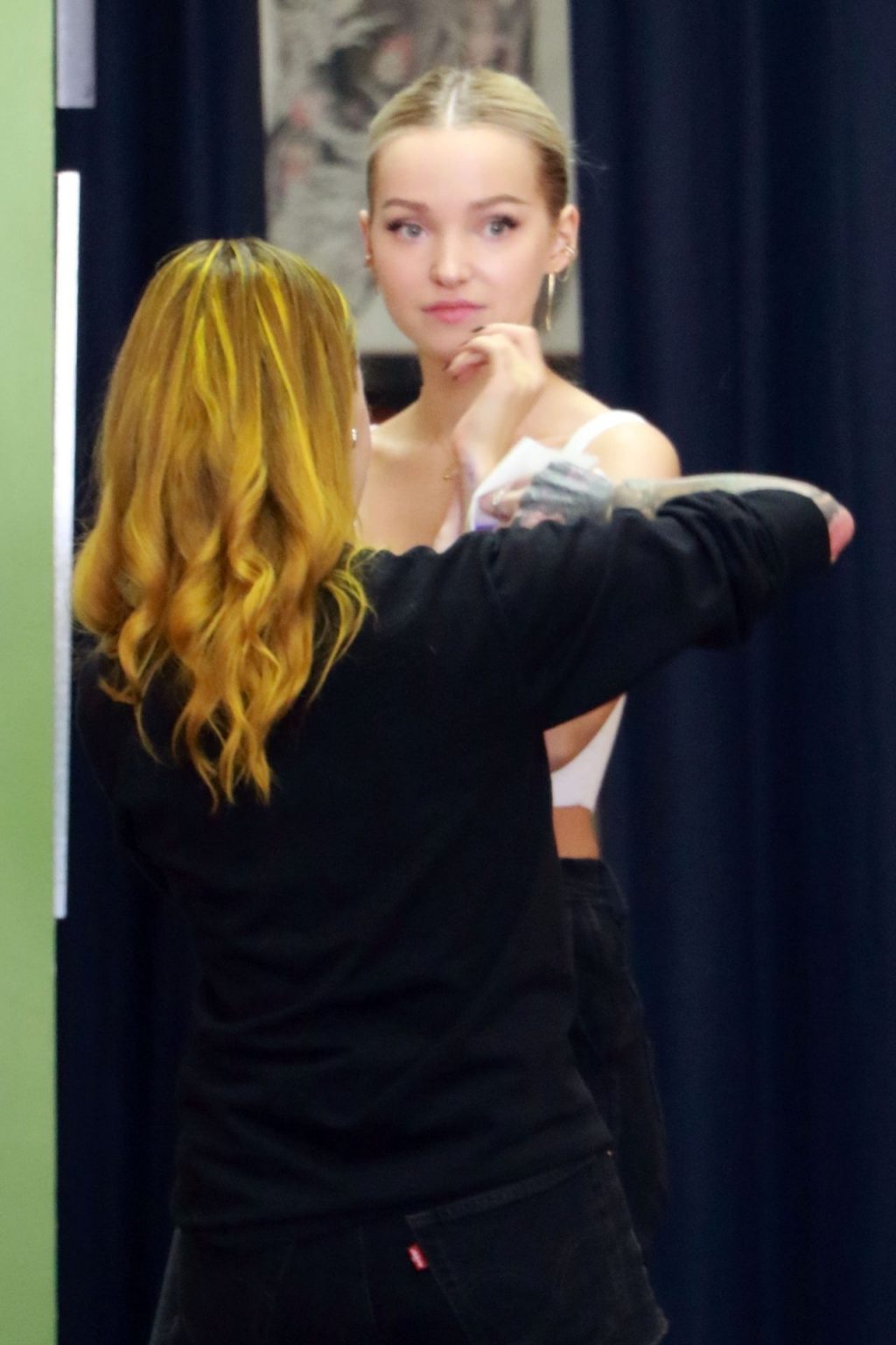 Dove Cameron mostra la sua figura tonica con un top corto bianco mentre si prepara per un nuovo tatuaggio e gira una scena in un negozio di tatuaggi locale giovedì.