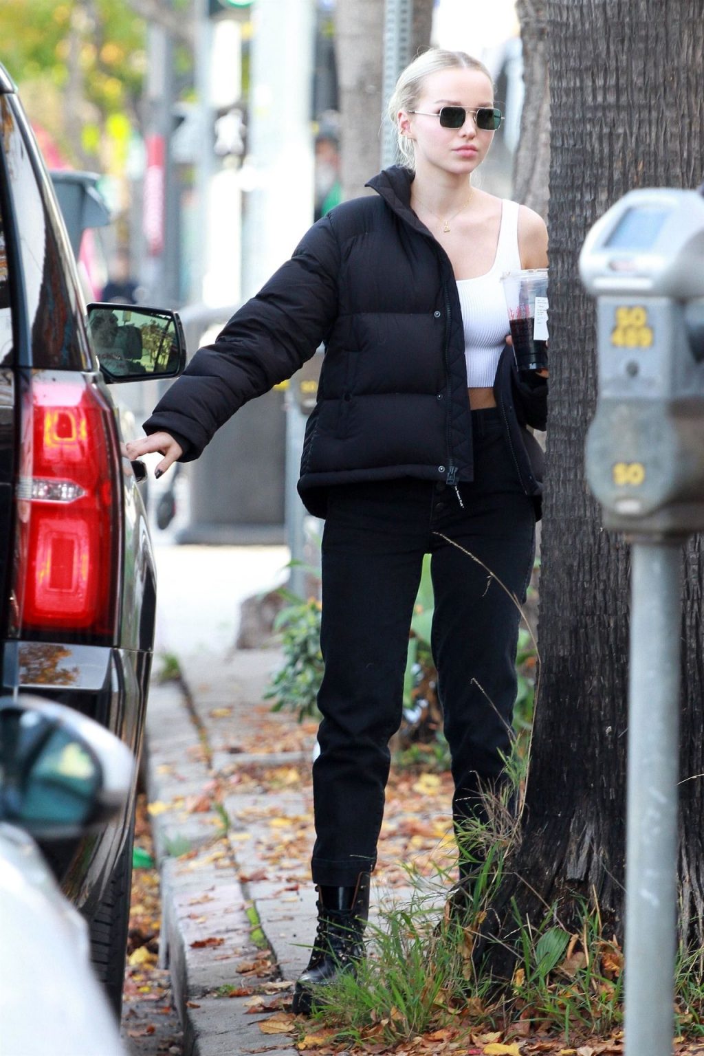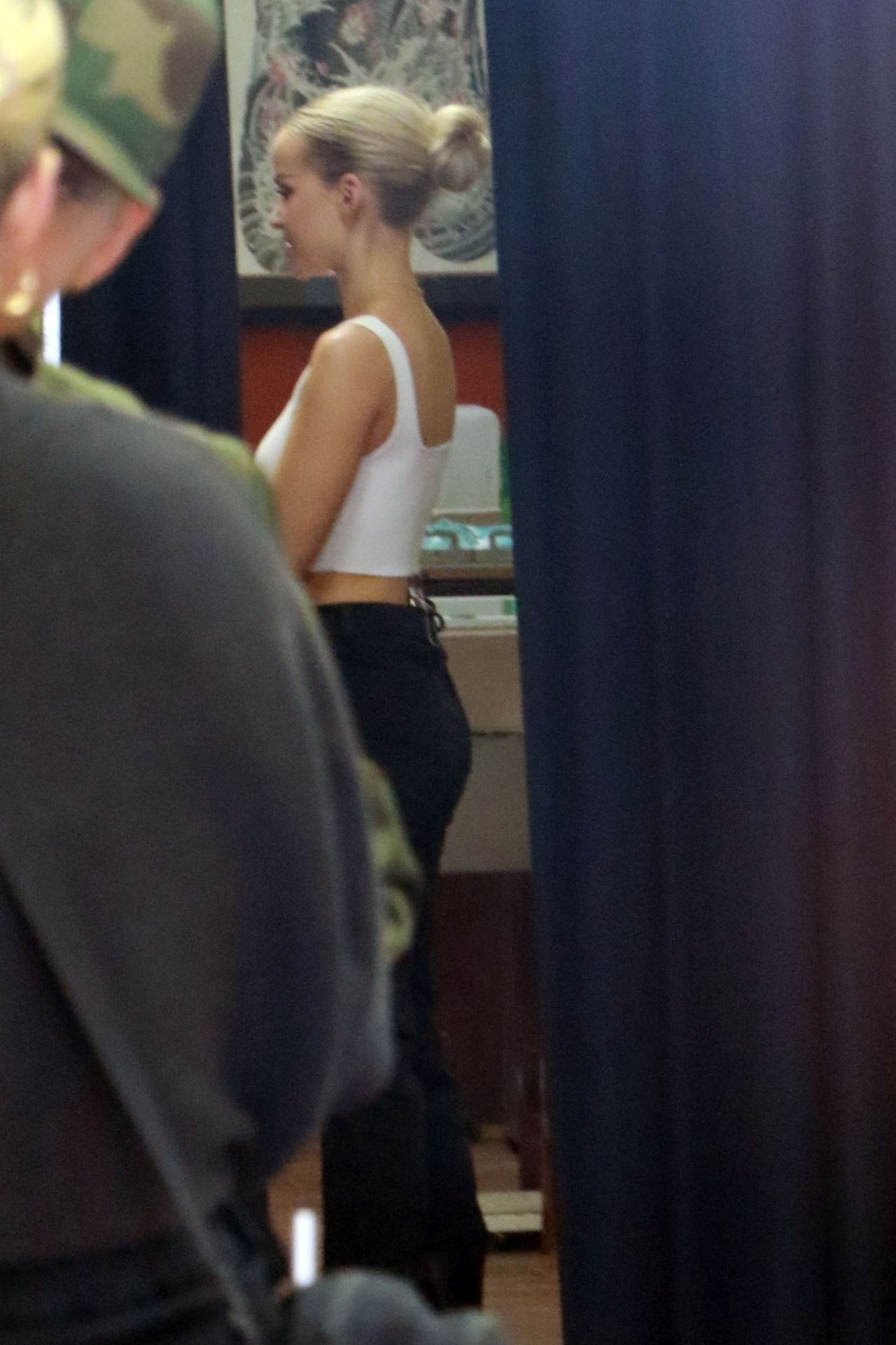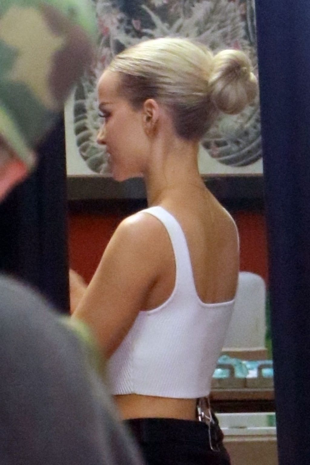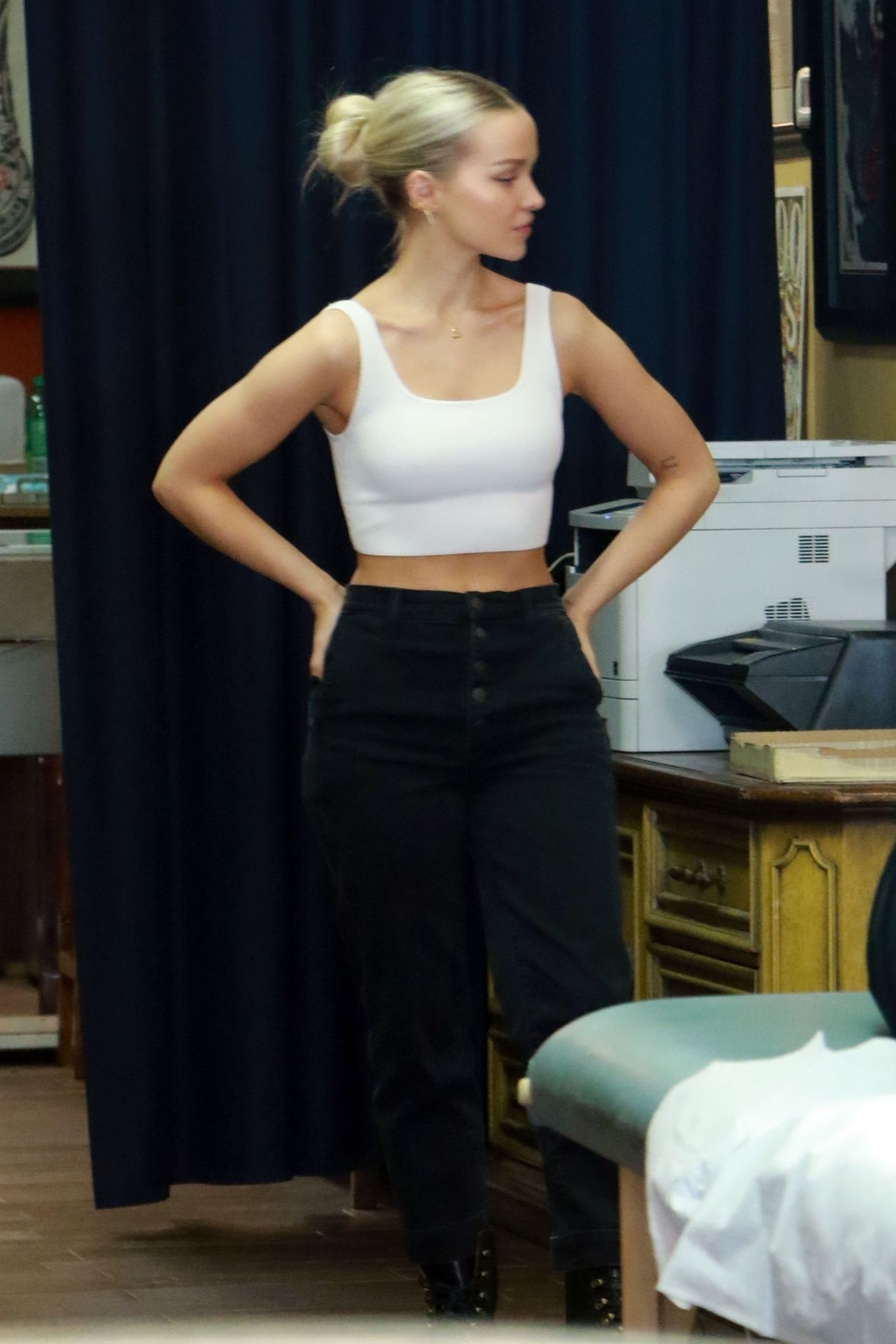 Dove Cameron mostra la sua figura tonica con un top corto bianco mentre si prepara per un nuovo tatuaggio e gira una scena in un negozio di tatuaggi locale giovedì.