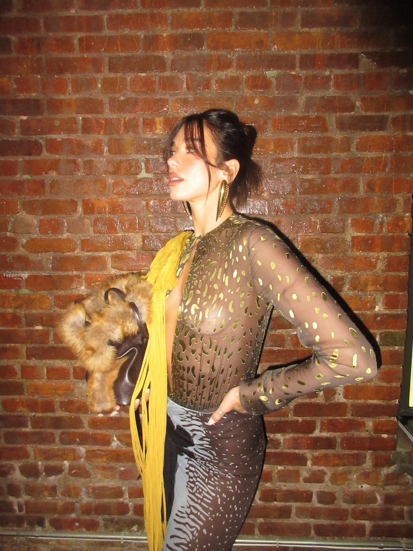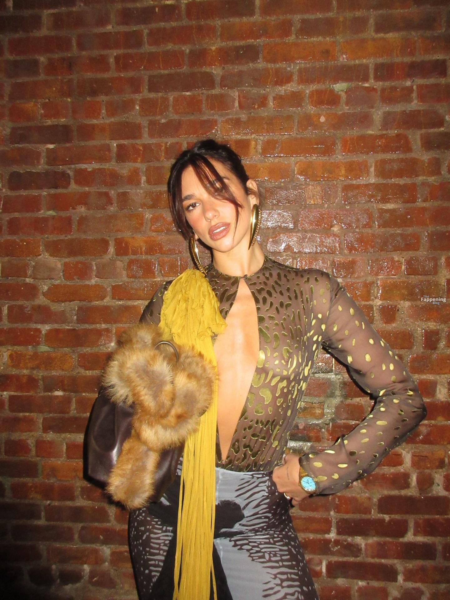 La cantante Dua Lipa appare completamente senza reggiseno con una maglia trasparente che non nasconde nulla – seno scoperto, capezzoli duri completamente visibili.
