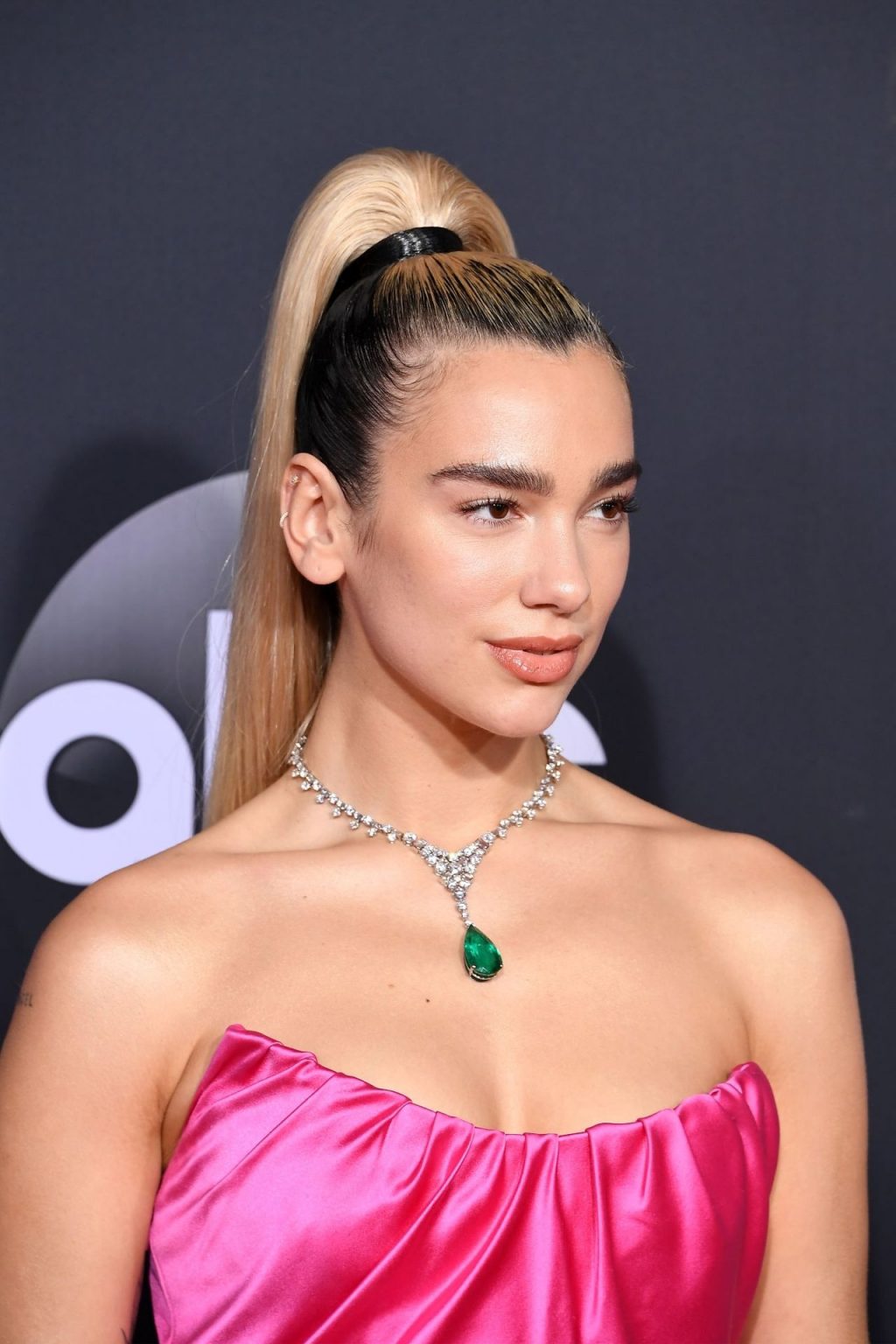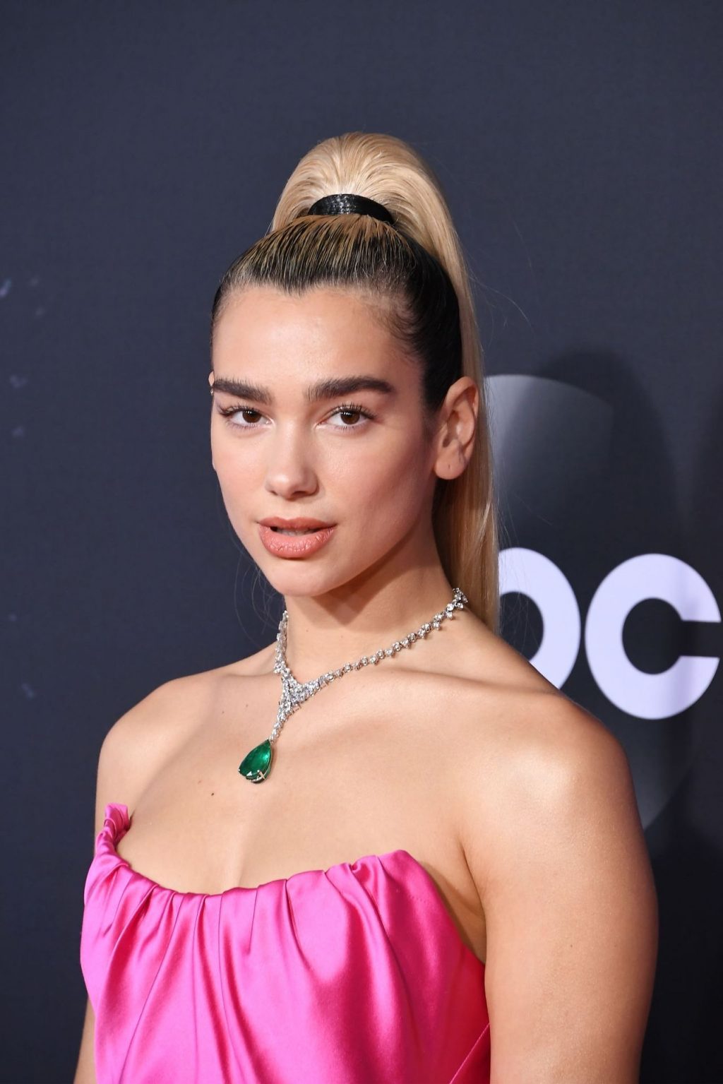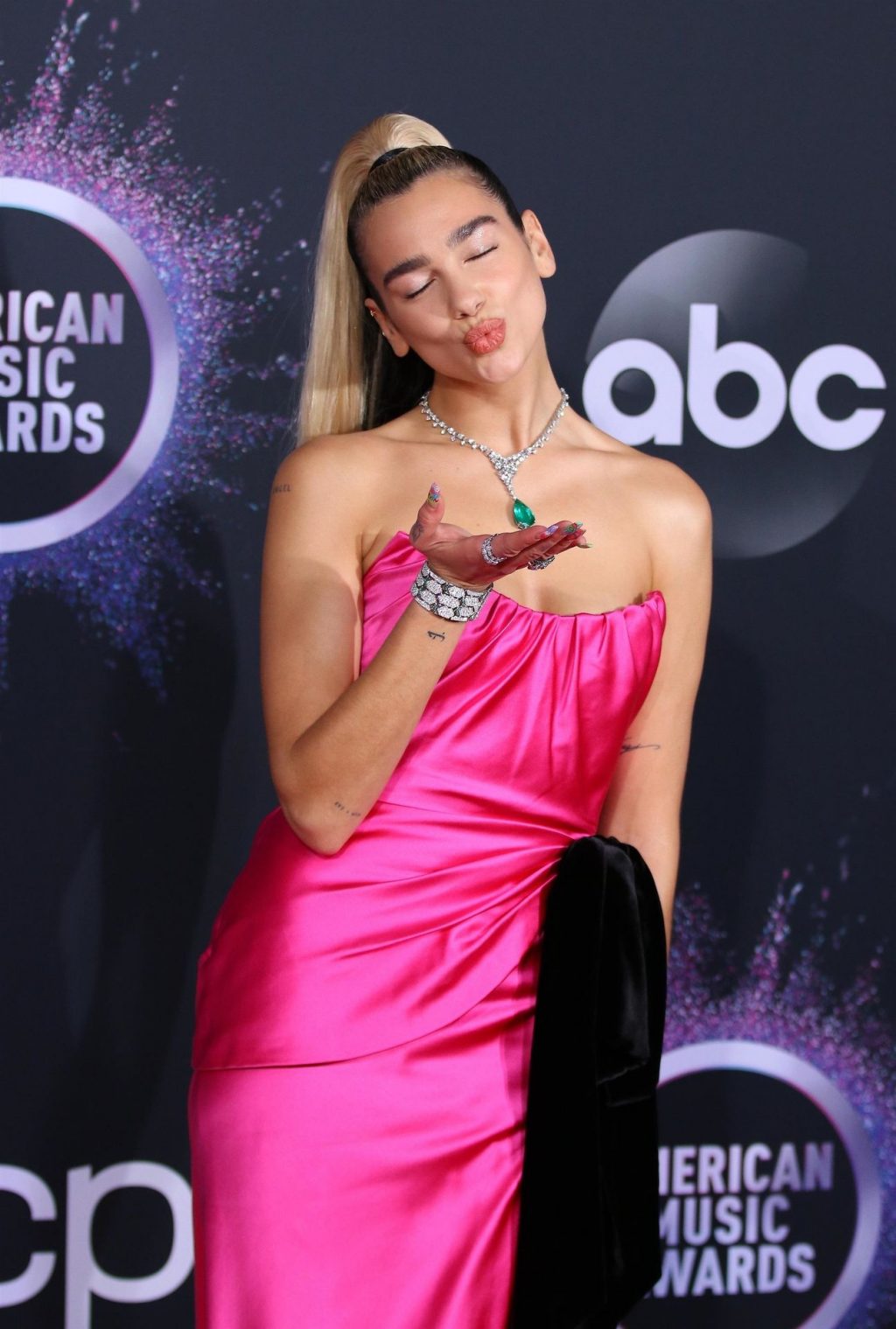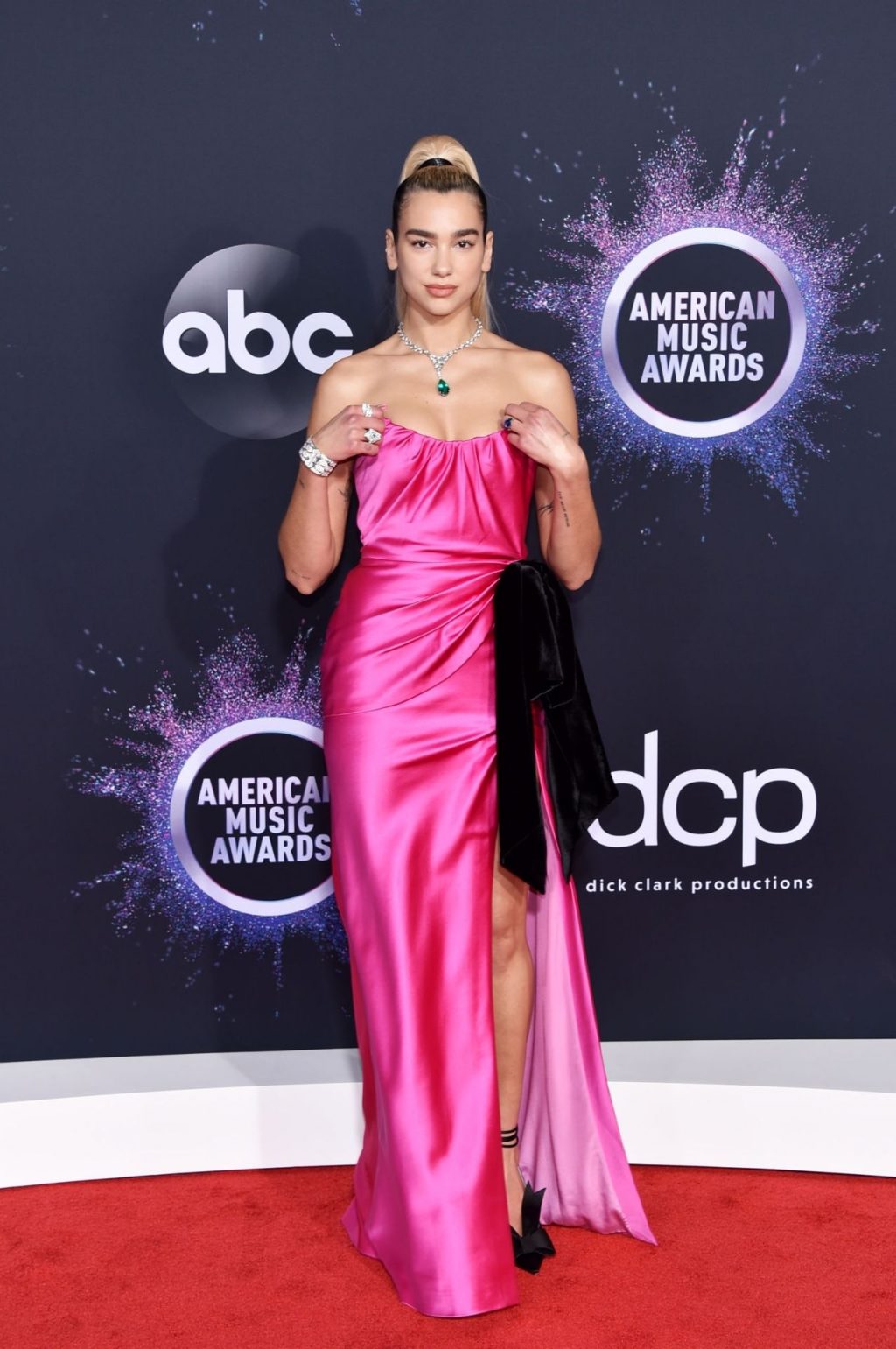 La famosa cantante Dua Lipa è stata fotografata sul red carpet con un vestito rosa insieme ad Anwar Hadid agli American Music Awards 2019 tenutisi al Microsoft Theatre L.A. Live a Los Angeles, 24/11/2019.