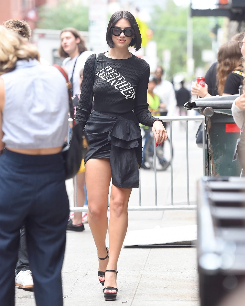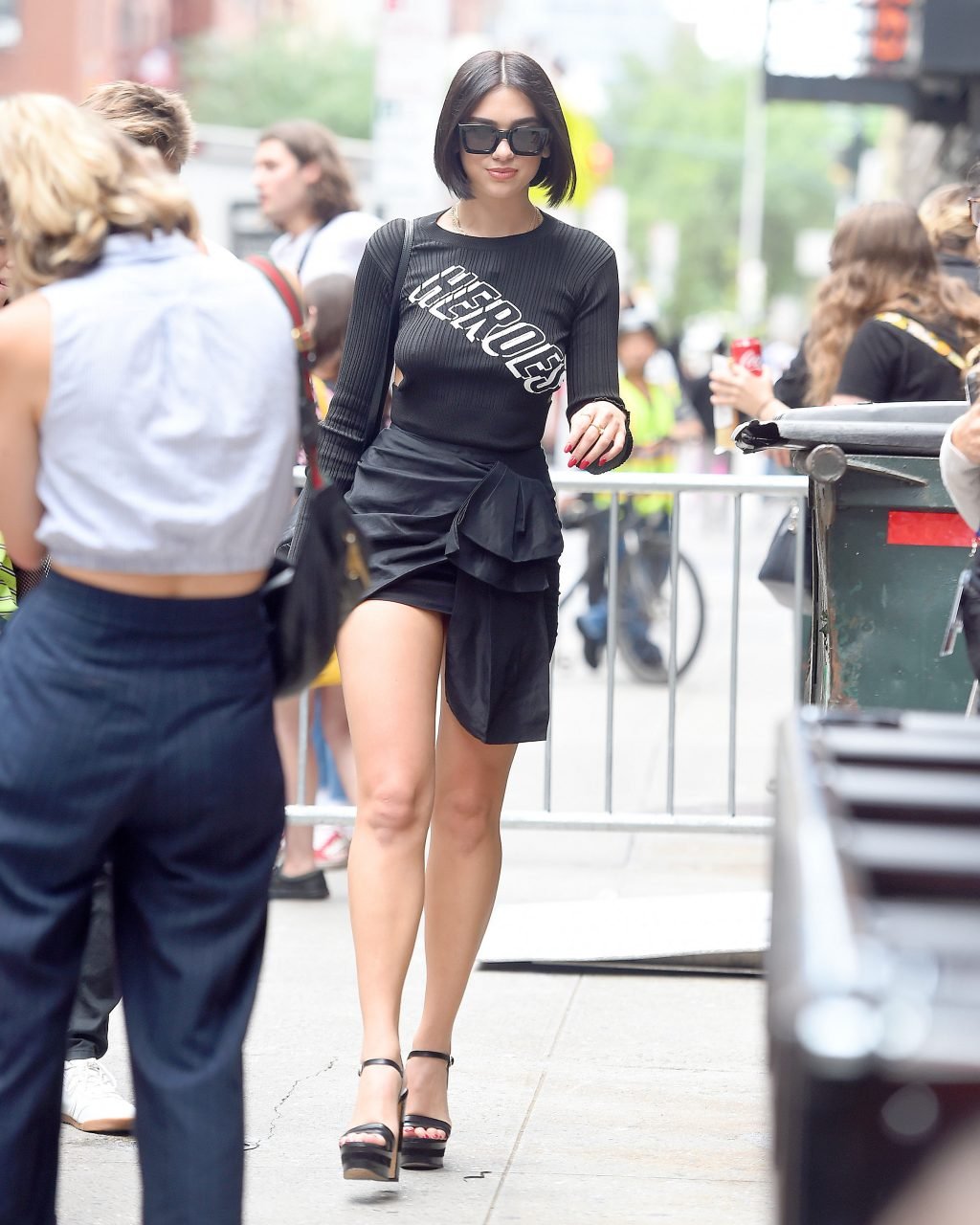 Dua Lipa mostra le sue gambe lunghe in una bella gonna corta con fiocco, mutandine bianche, scarpe con plateau e maglione Heroes a New York City, 26/07/2018.