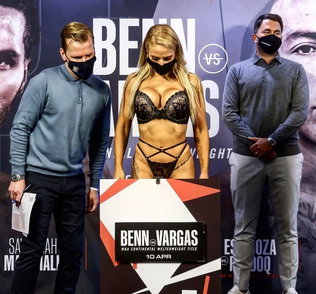 La pugile australiana Ebanie “Blonde Bomber” Bridges mostra le sue tette finte prima del combattimento per il titolo WBA dei pesi gallo contro Shannon Courtenay durante la pesatura, 04/09/2021. I suoi seni sono troppo grandi per la WBA… ma i nostri fan aspettano la sua nudità.