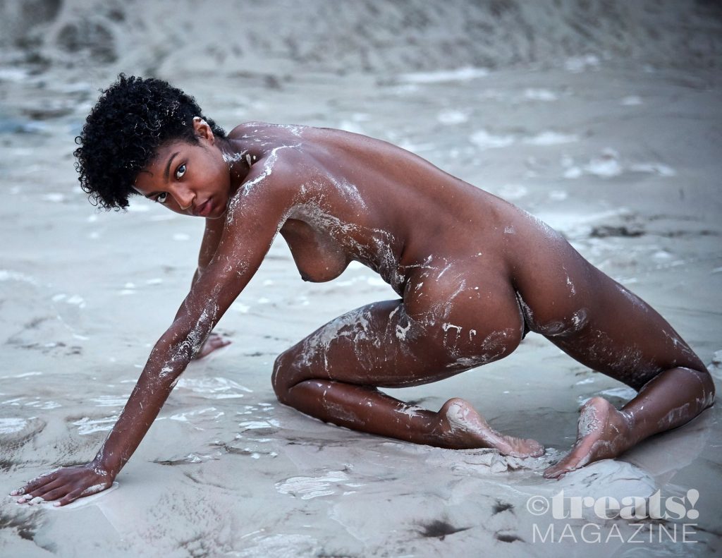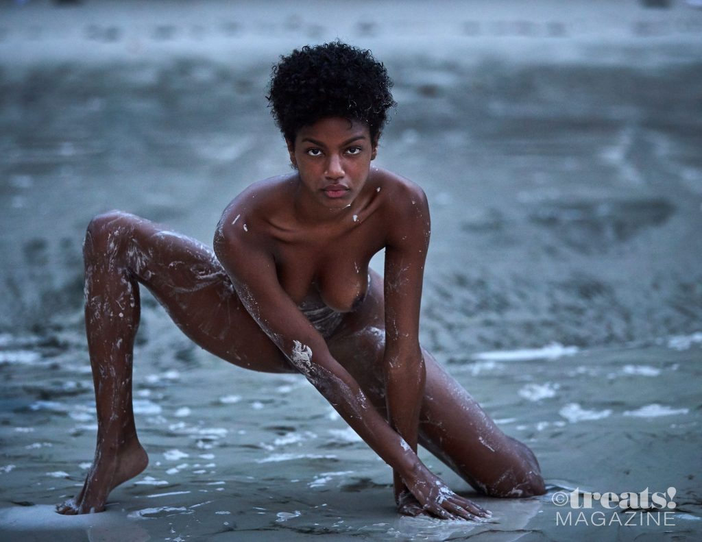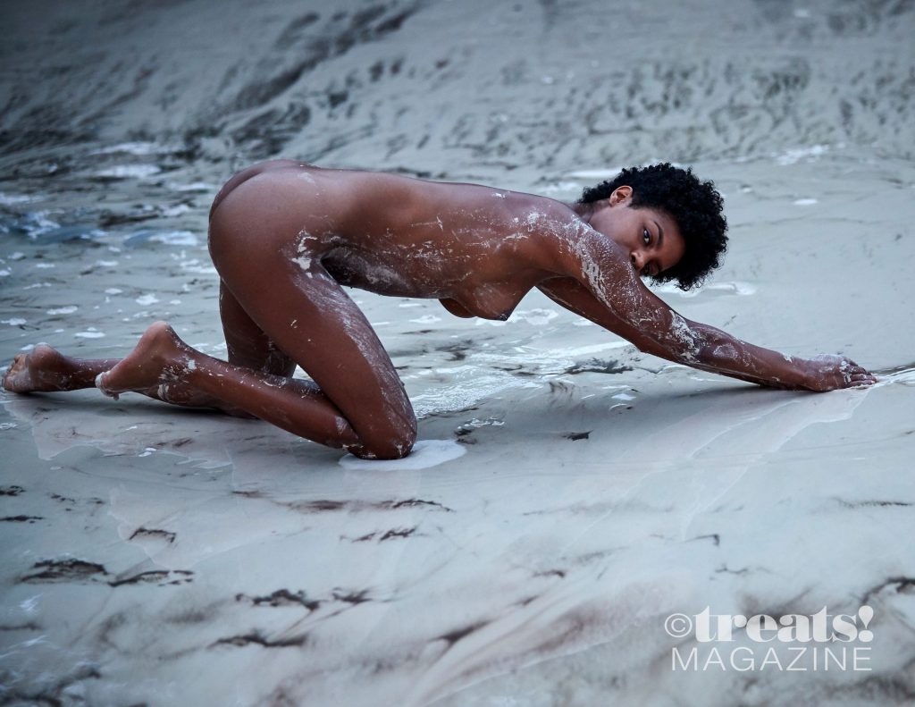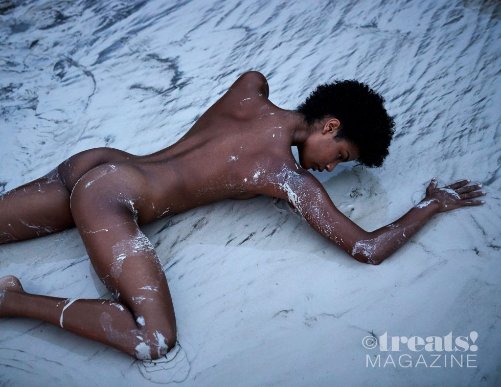 La modella Ebonee Davis mostra il suo corpo nudo in varie pose sulla spiaggia in un servizio fotografico di David Bellemere per la rivista treats! (2017).