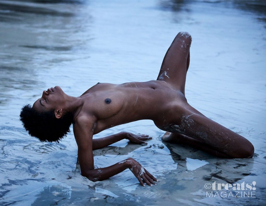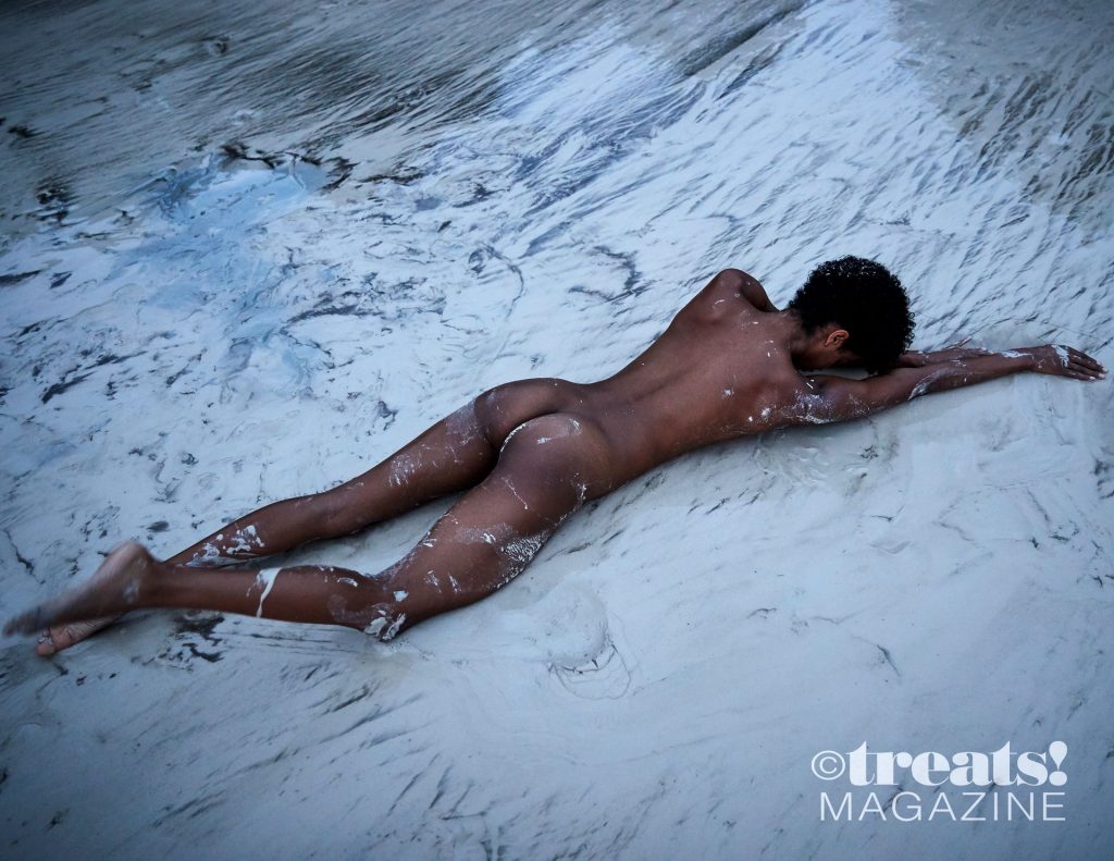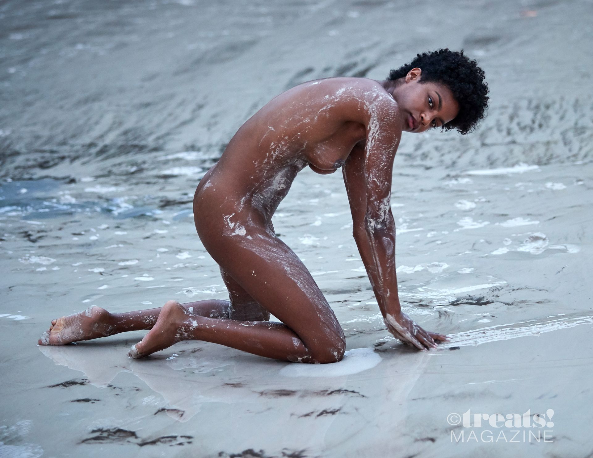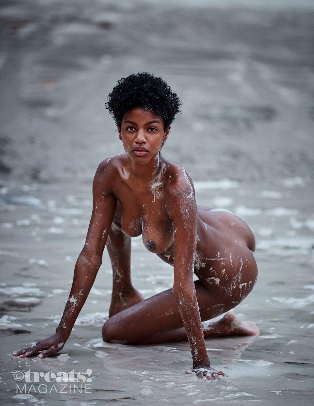 La modella Ebonee Davis mostra il suo corpo nudo in varie pose sulla spiaggia in un servizio fotografico di David Bellemere per la rivista treats! (2017).