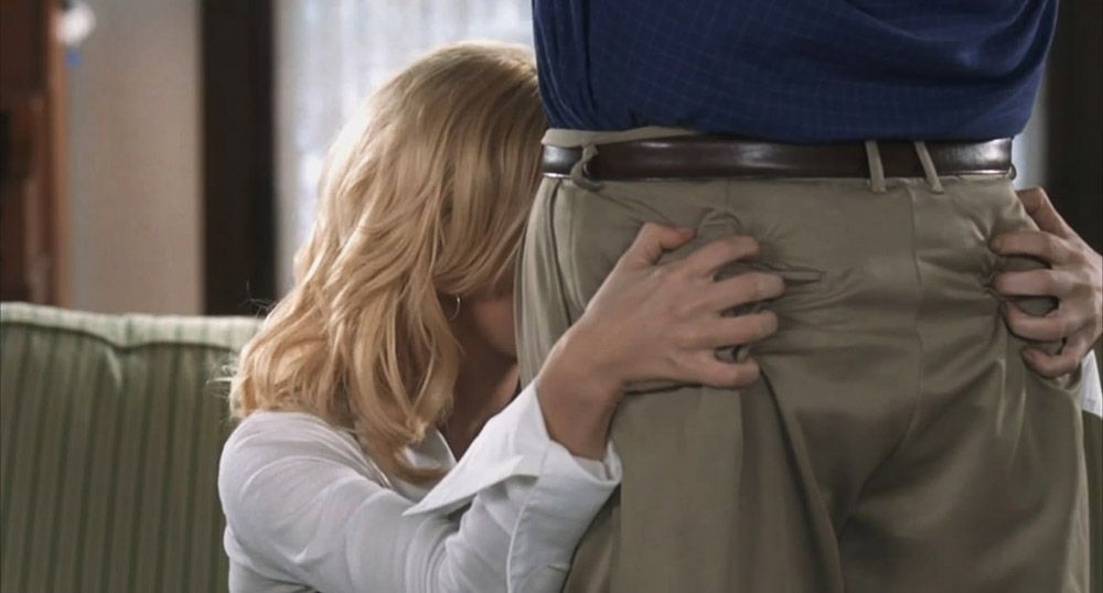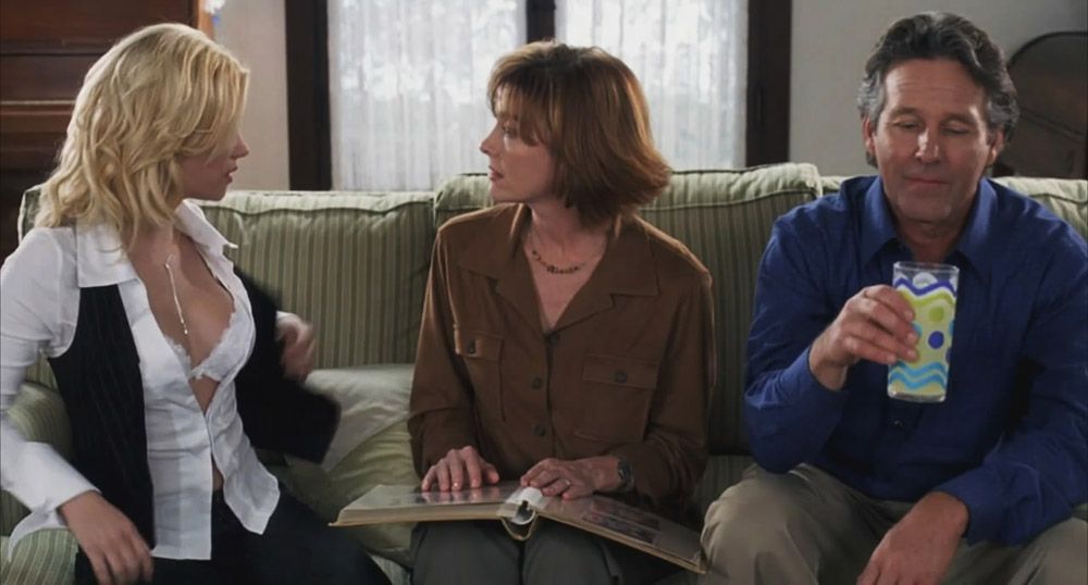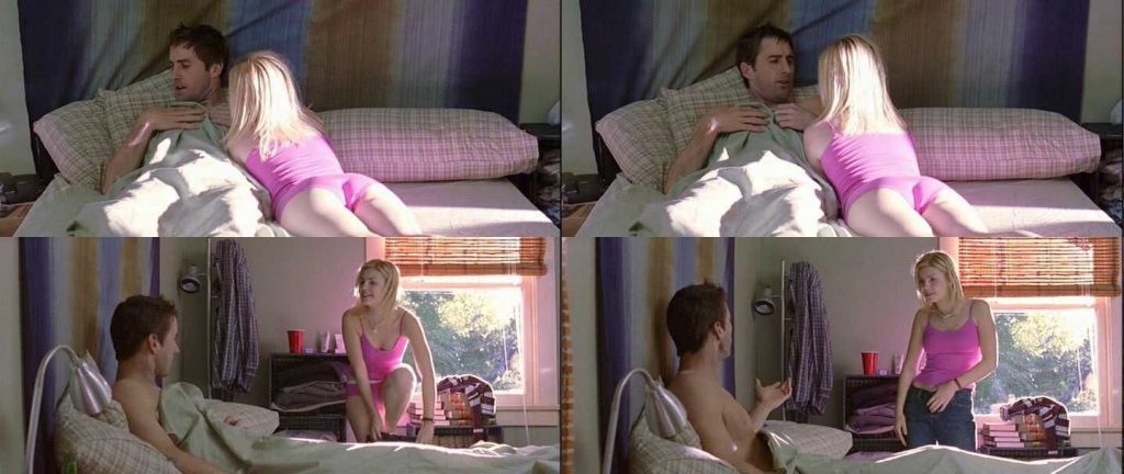 In scene three, Elisha Cuthbert sits on the couch. The guy imagines that Elisha goes down on the other guy and then unbutt her shirt to show her bra before kissing Donna Bullock. Then the guy imagines having sex with Elisha. It’s hot!