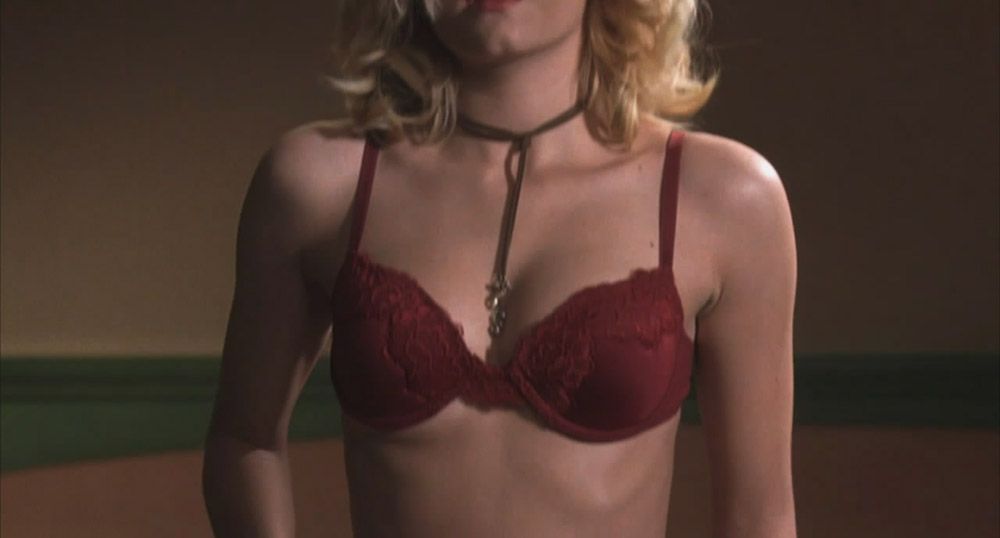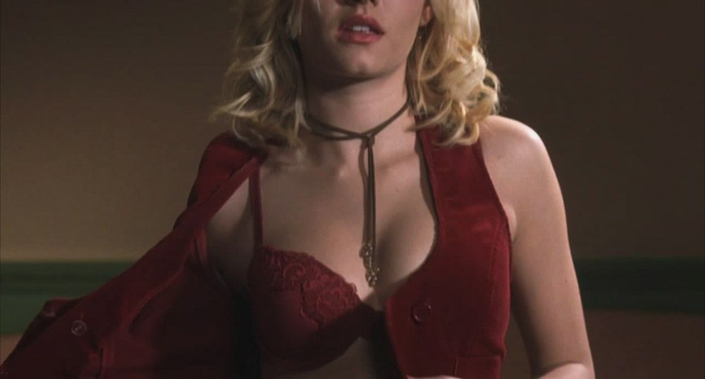 Blonde Elisha Cuthbert is sexy unbuttoning her top lying on a bed in a motel room. She exposes her red bra and crawls up to the guy, then shows ass in tight pants as she leans down, watching him get all naughty.