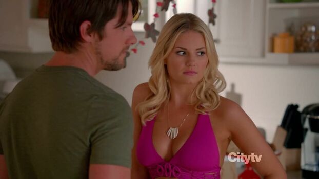 Blonde Elisha Cuthbert is sexy unbuttoning her top lying on a bed in a motel room. She exposes her red bra and crawls up to the guy, then shows ass in tight pants as she leans down, watching him get all naughty.