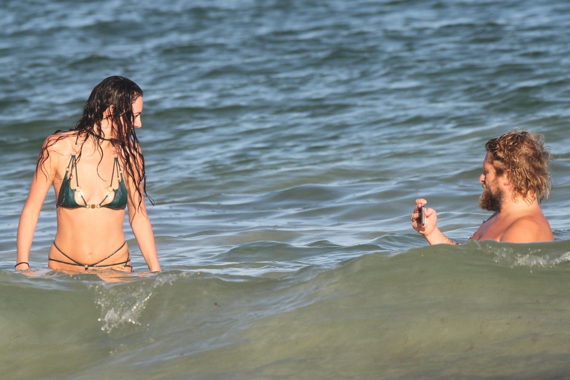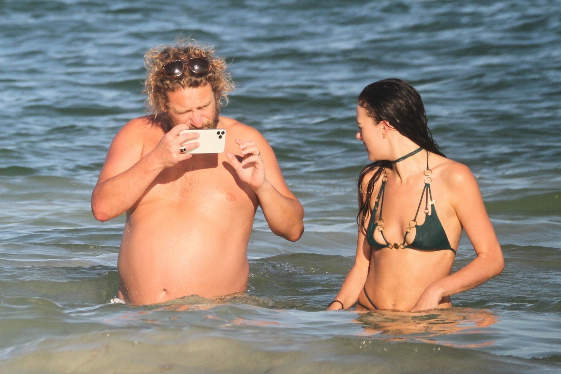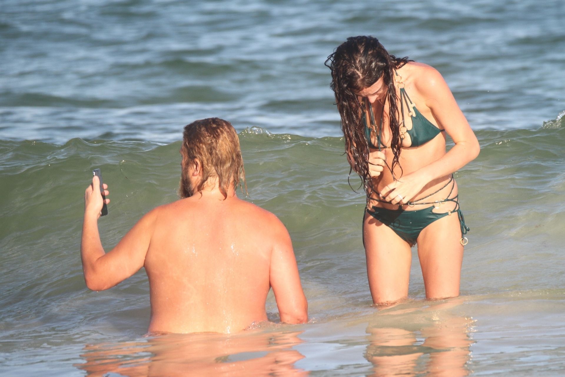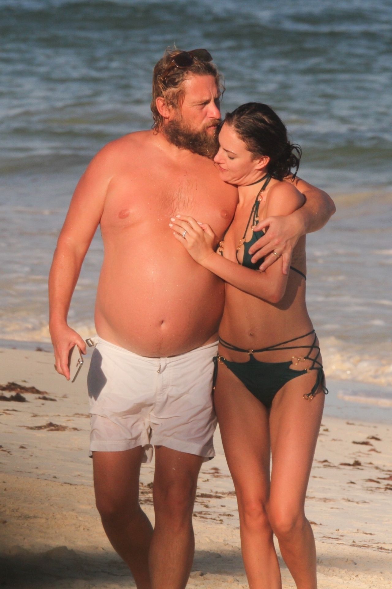 Modella Eliza Cummings e il fotografo hollywoodiano Greg Williams sono stati visti mentre si godevano la luna di miele a Tulum, Messico, il 24/11/2019. Eliza si è bagnata sulla spiaggia, indossando un minuscolo bikini verde.