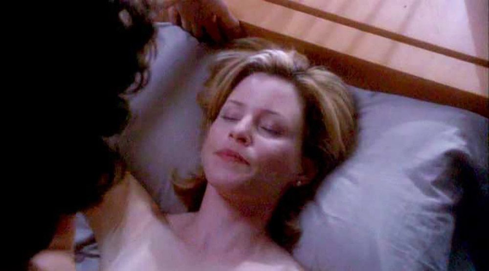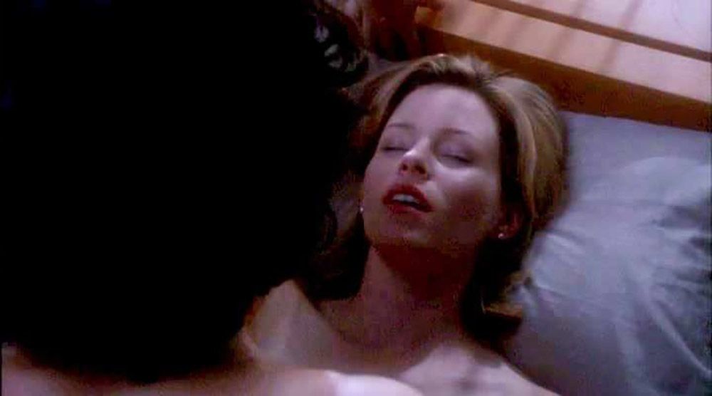 Old, but gold scenes where Elizabeth Banks is lying on her back having sex with a guy. He looks down at her and panics with his thoughts until they stop. And talk for a bit as his arm covers Elizabeth Banks’s nude boobs. She is giving us glimpses of her nipples.