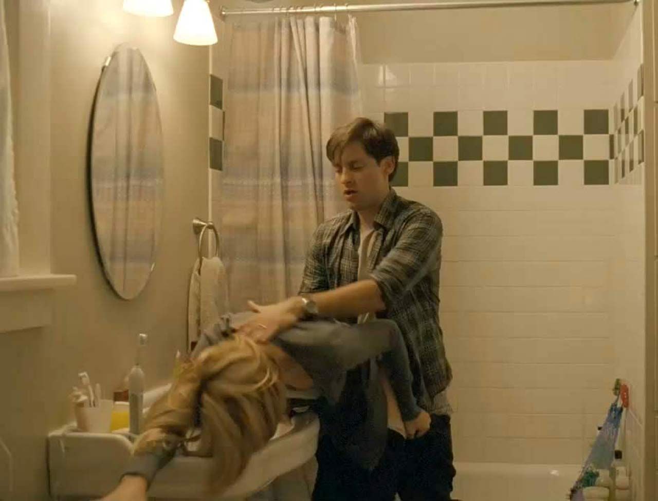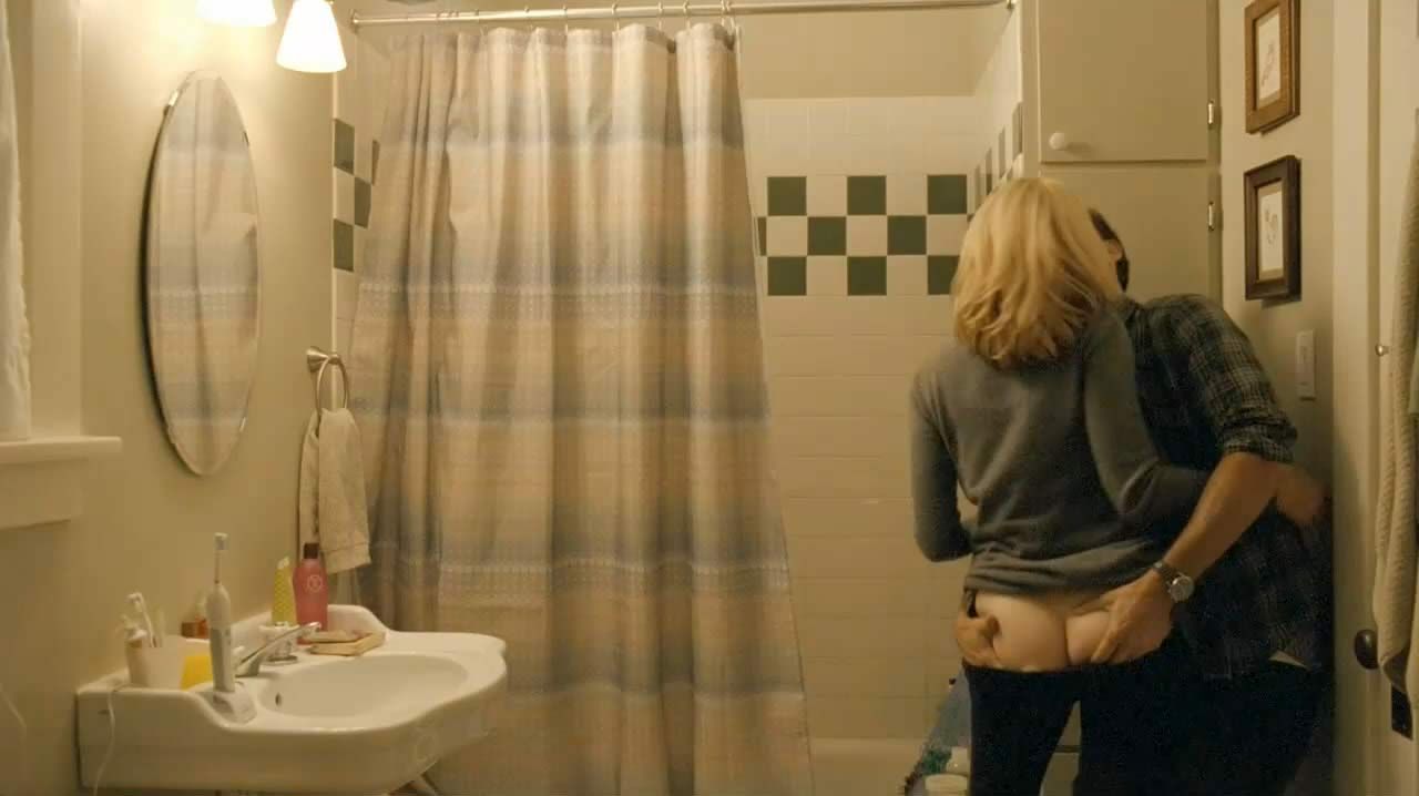 Elizabeth Banks si bacia con un uomo e poi fa sesso con lui in piedi in un bagno. Banks finisce piegata sul lavandino con l’uomo dietro che la penetra. La maggior parte dell’azione è accelerata, ma vediamo in tempo reale quando l’uomo le abbassa i pantaloni e le stringe il sedere nudo.