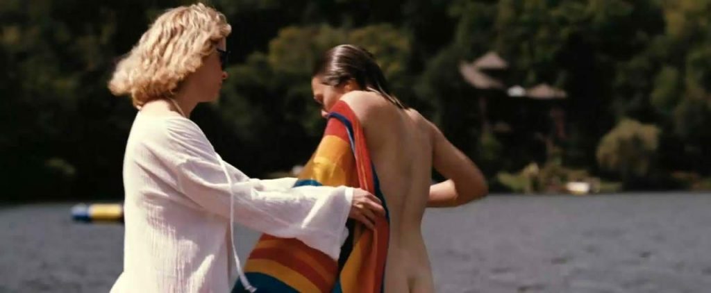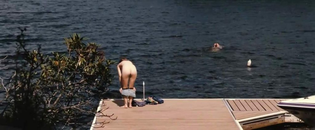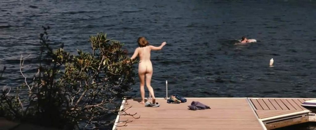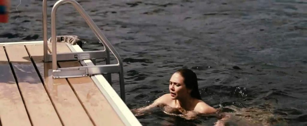 Elizabeth Olsen showed her tight ass and nude back as takes the clothes off on the dock and jumps into the lake. Then she is swimming a bit and leaving the water, showing her naked butt again!