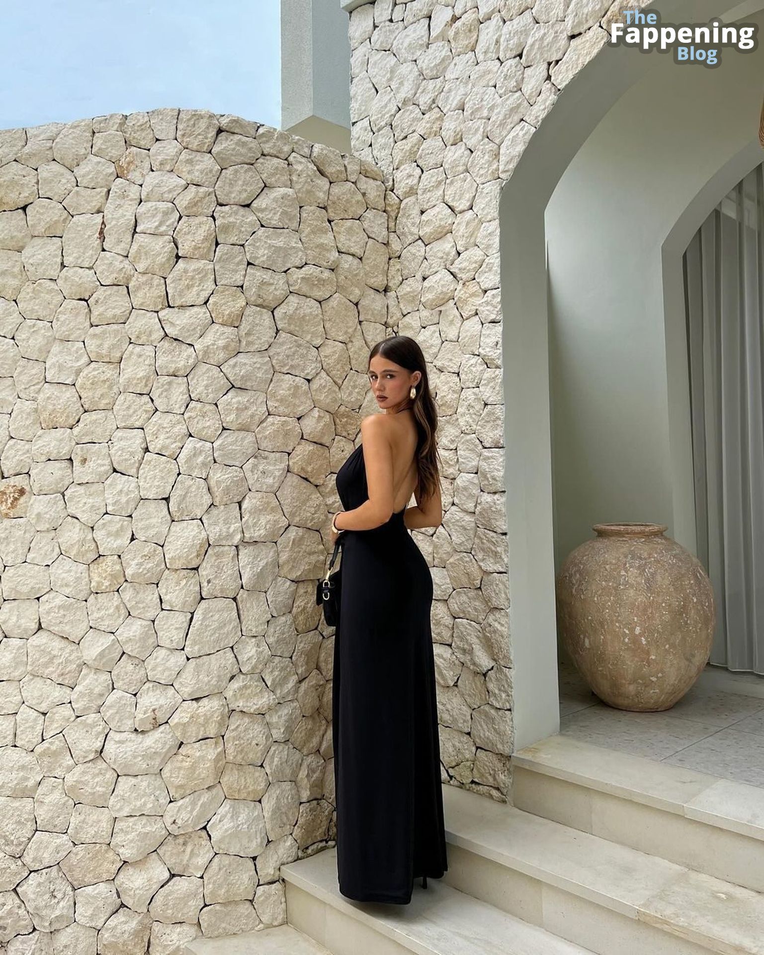 Guarda il look senza reggiseno di Ella Cervetto mentre mostra il suo seno incredibile in un audace abito bianco e nero.