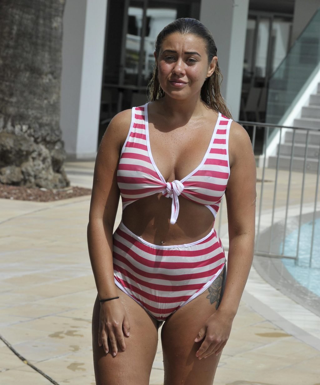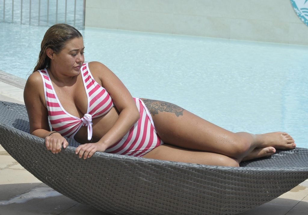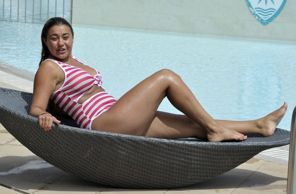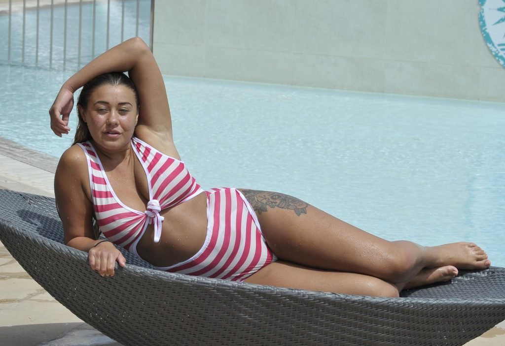 Big Brother’s Ellie Young è stata vista in bikini rosso-bianco mentre mostra un décolleté abbondante a bordo piscina mentre si gode il sole a Palma, Spagna, 08/04/2018.
