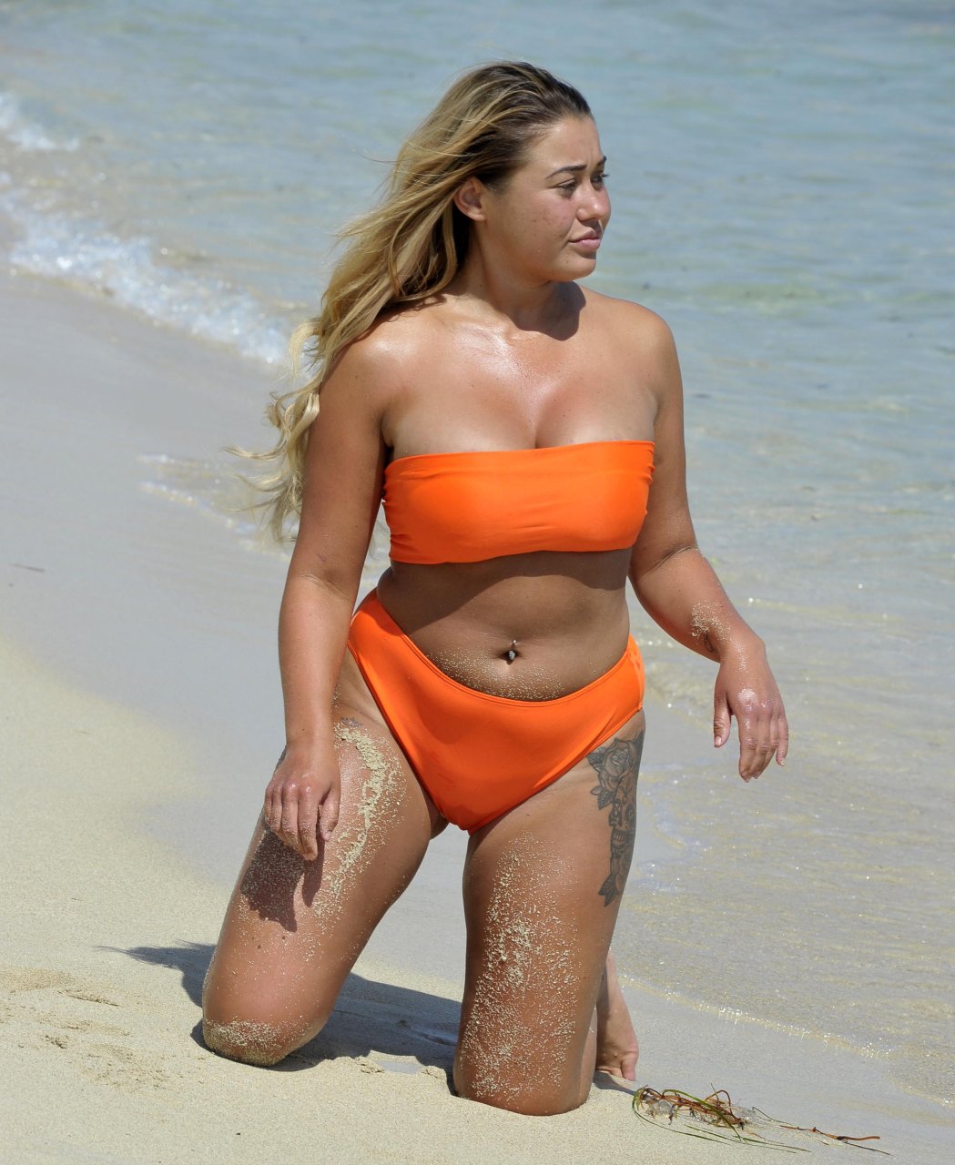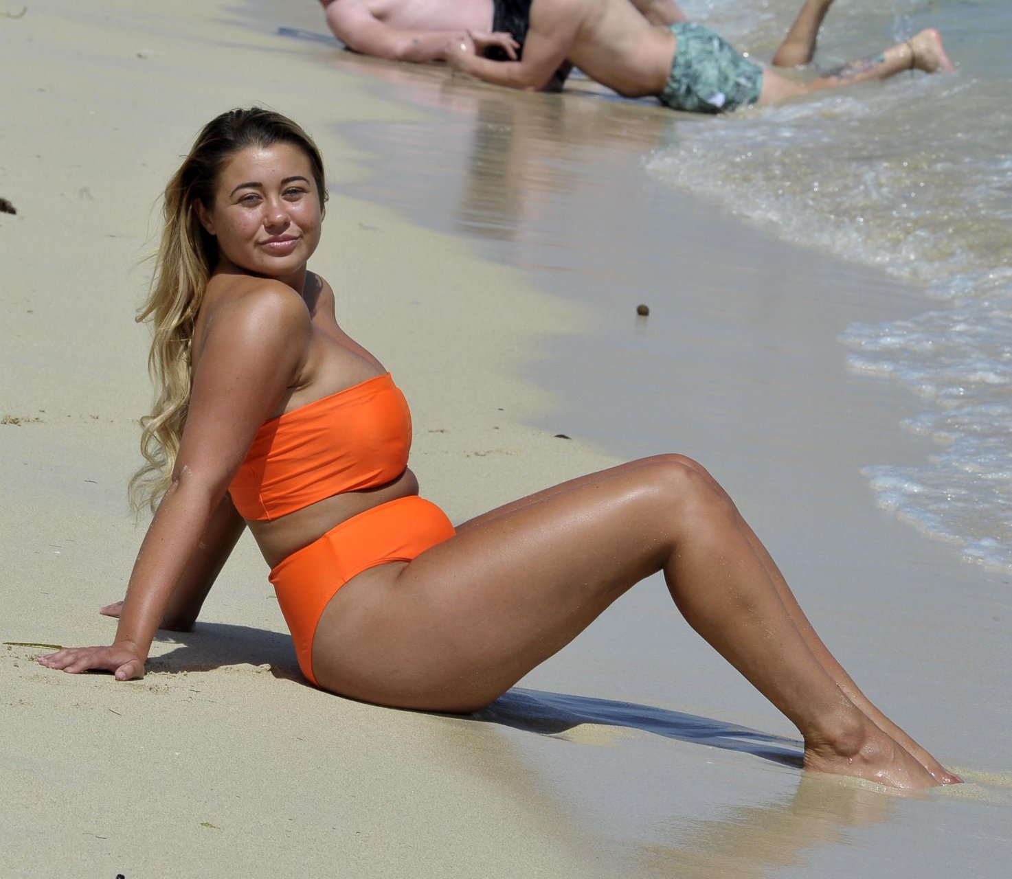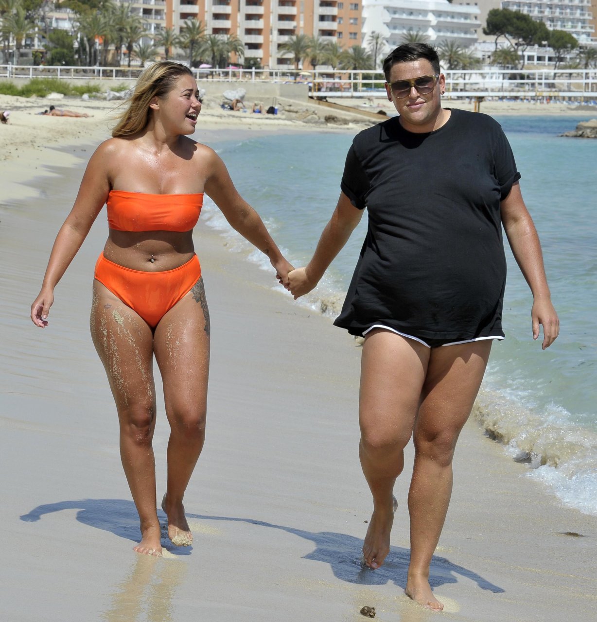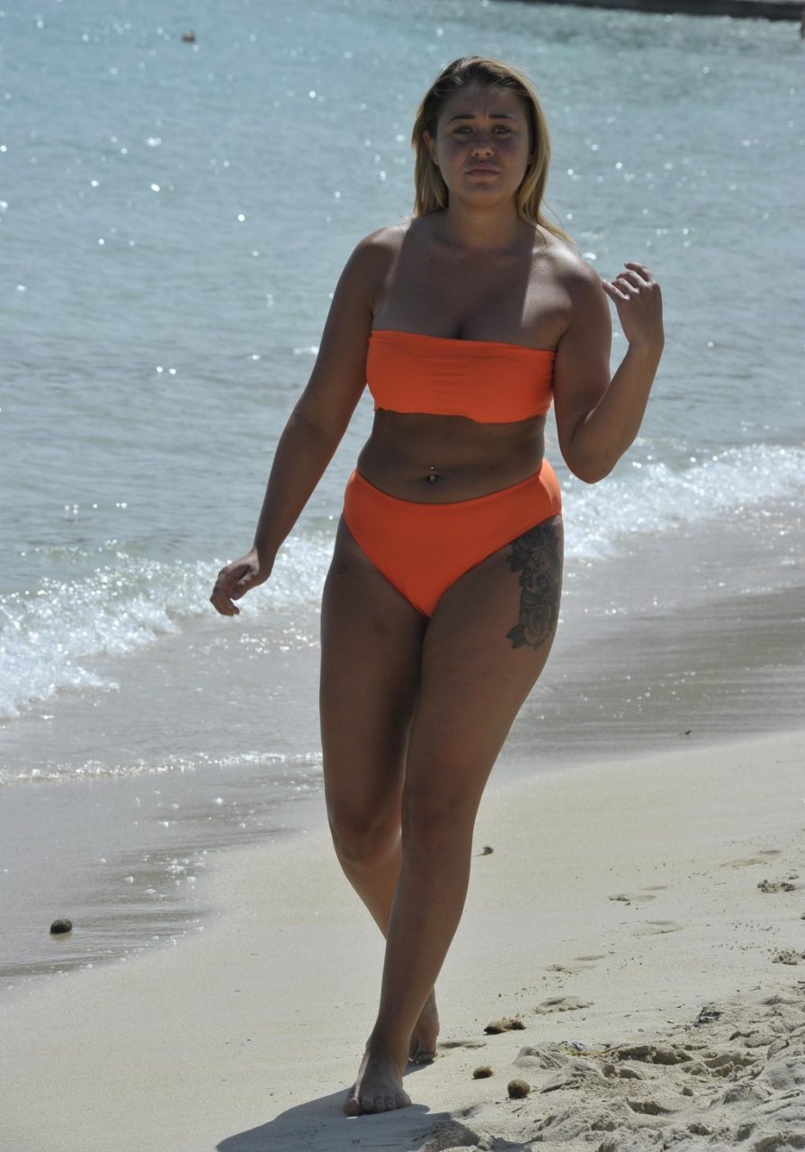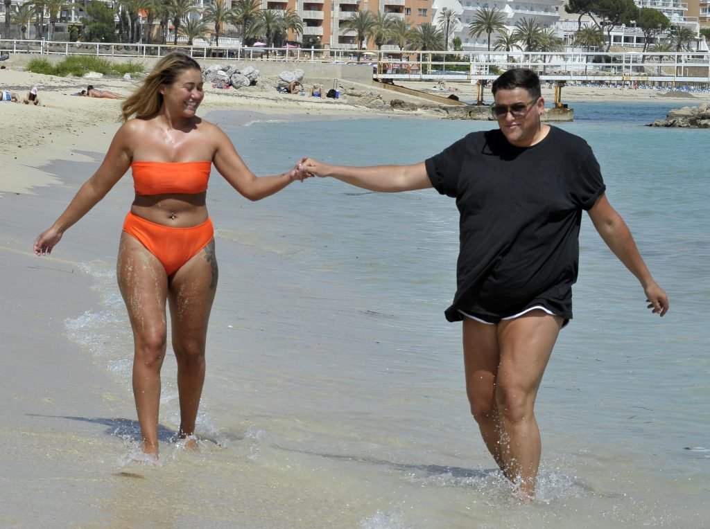 Ibiza Weekender e Big Brother Ellie Young sfoggia un décolleté prosperoso mentre mostra il seno in un bikini arancione brillante, mentre si diverte sulla spiaggia con il collega televisivo David Potts (David Weekender) – Magaluf, Spagna (ottobre 2018).
