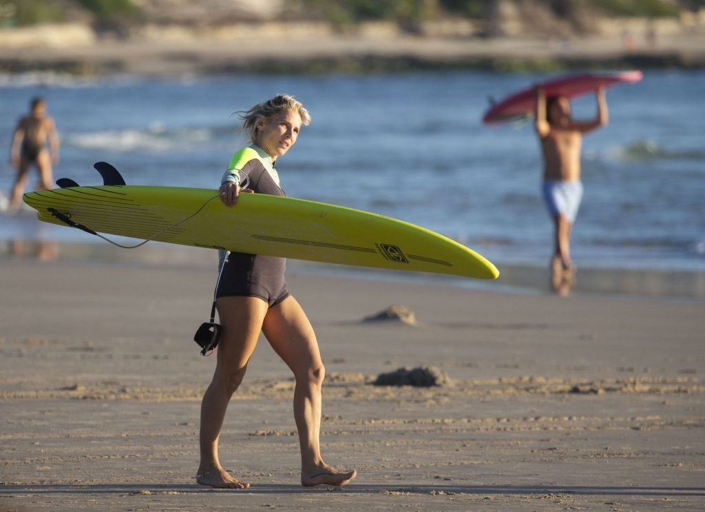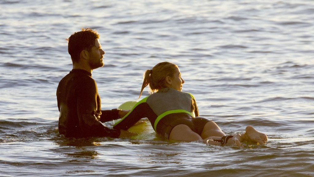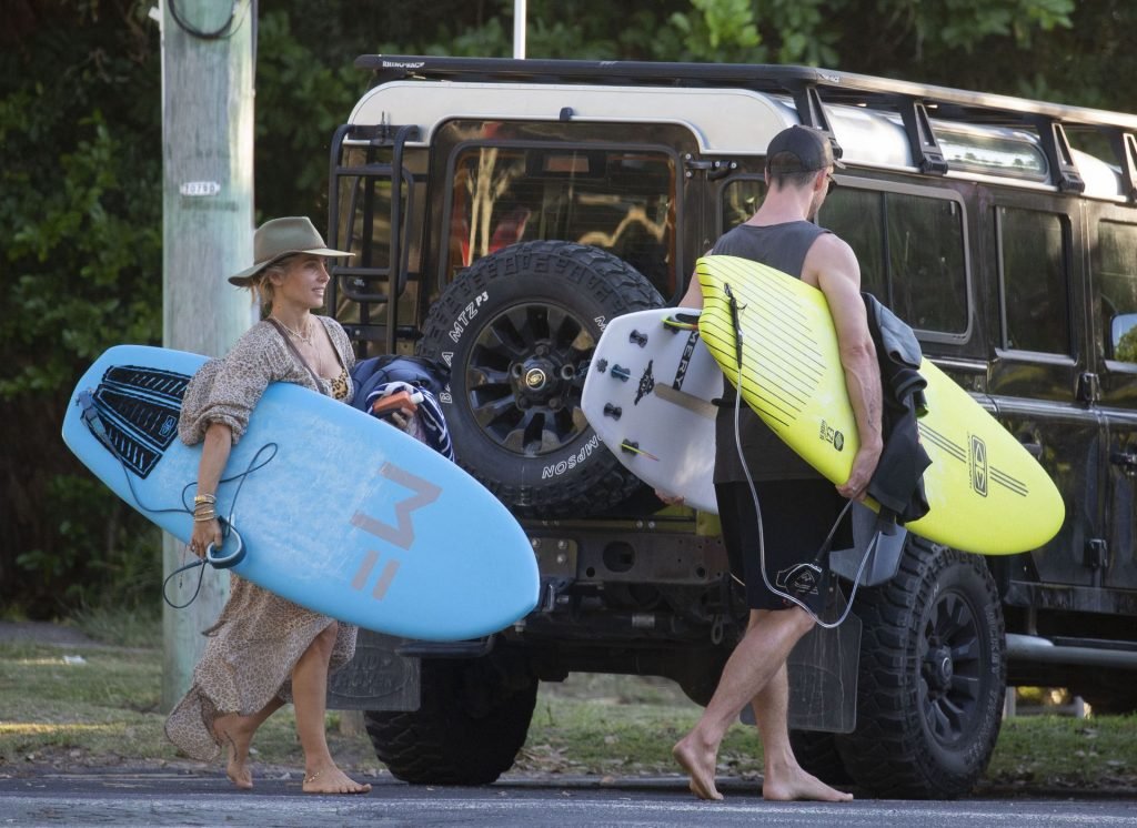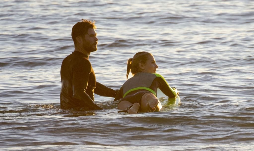 Chris ed Elsa hanno sistemato le loro tavole e si sono goduti il tramonto durante una visita nel tardo pomeriggio alla spiaggia The Pass di Byron. Chris è stato attento con Elsa in acqua, aiutandola a raggiungere le onde.