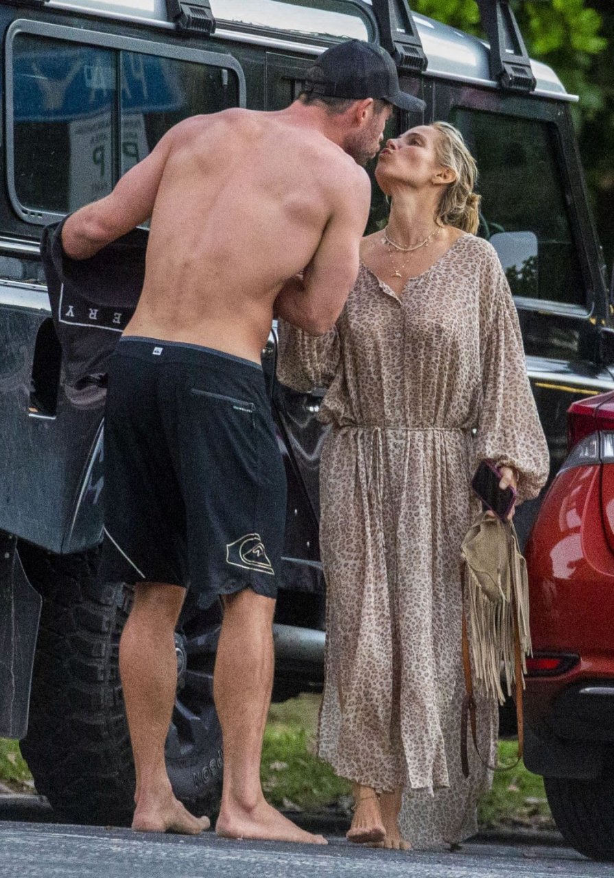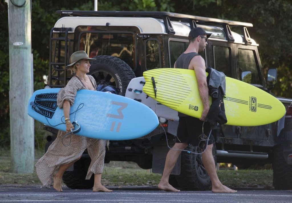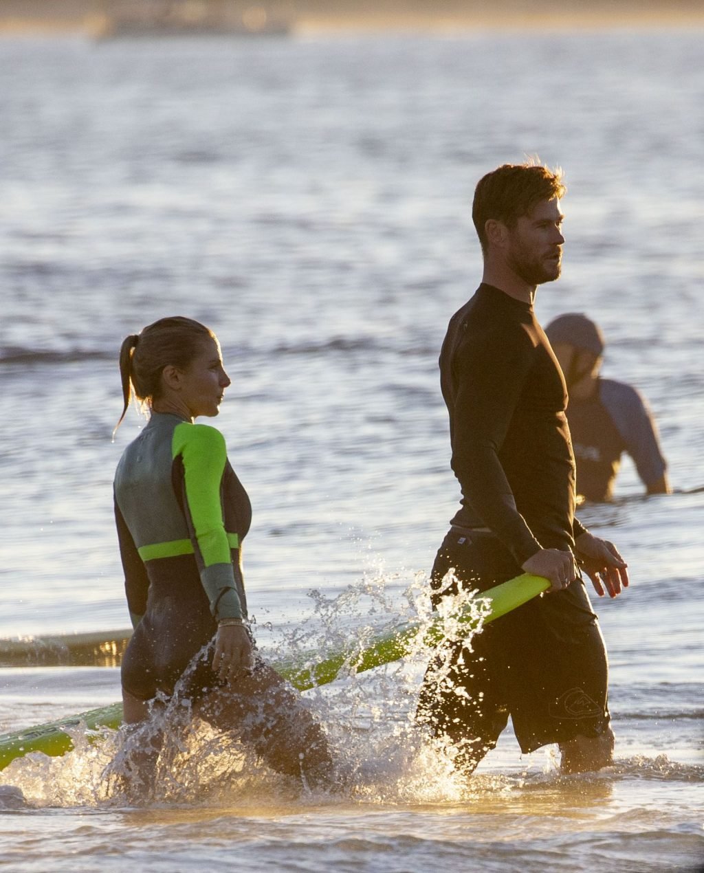 Chris Hemsworth (Thor di “Avengers”) ed Elsa Pataky hanno una romantica sessione di surf al tramonto insieme a Byron Bay, 10/05/2019.