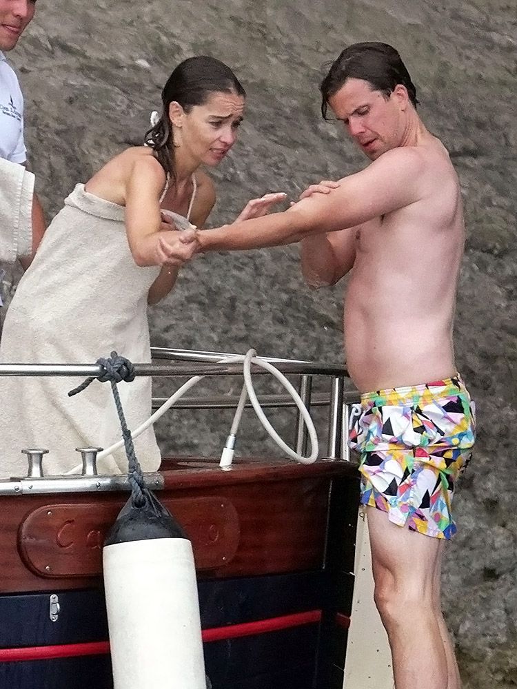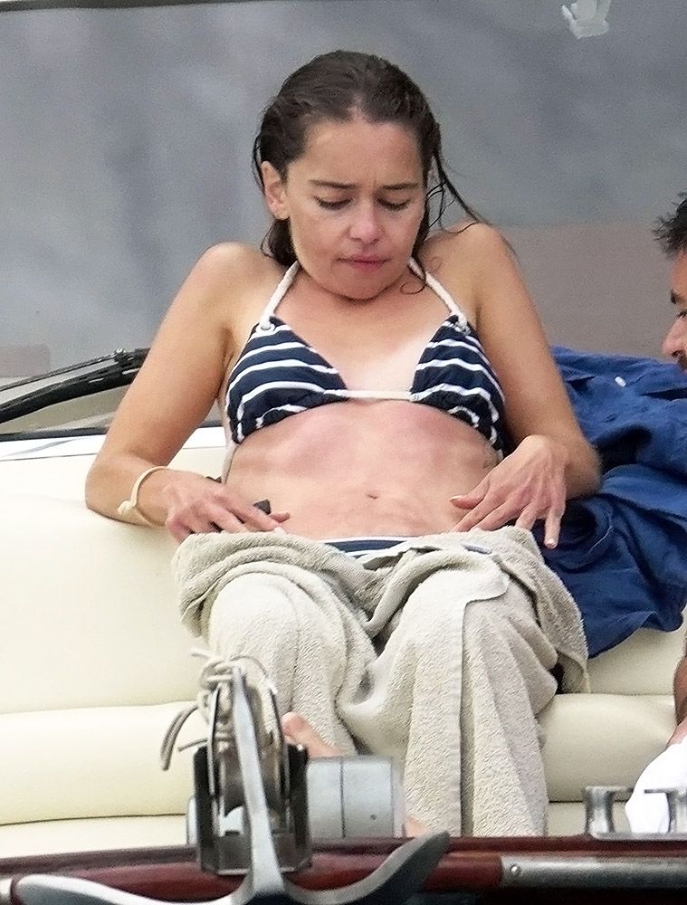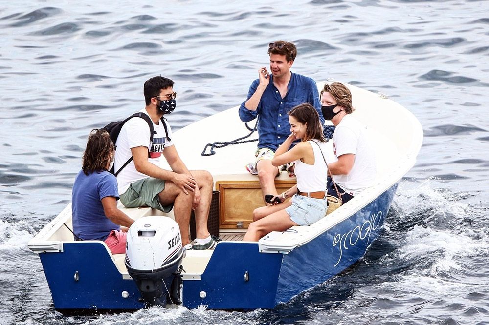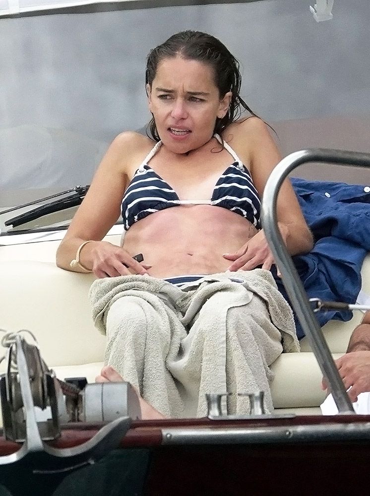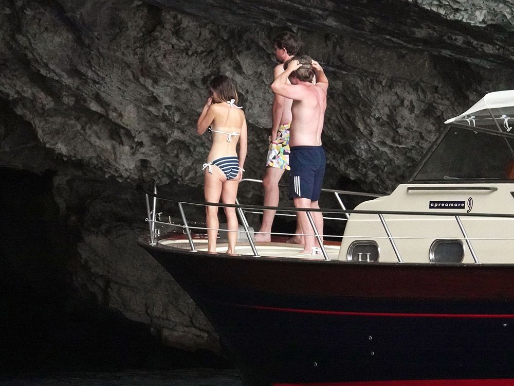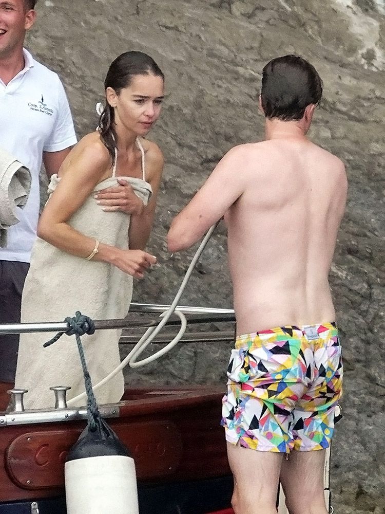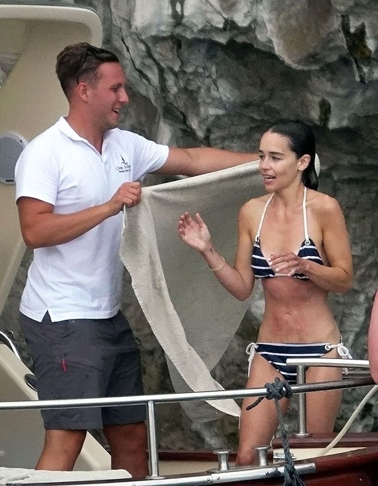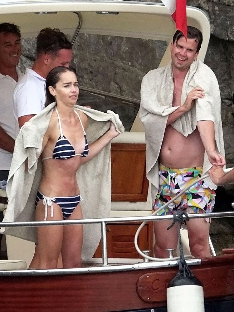 The actress Emilia Clarke is seen with her friends during the summer holiday in Italy. The English beau enjoyed a boat trip with the male friends and went for a swim in a striped bikini. The group visited some caves while out on their boat enjoying the summer in Italy! Emilia Clarke wore a sexy bikini and showed a lot of skin!