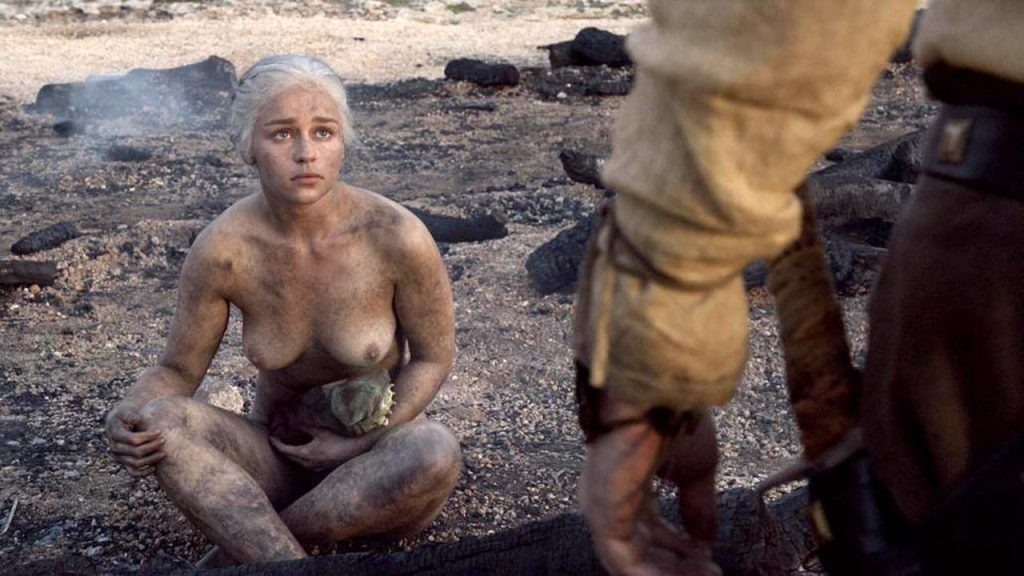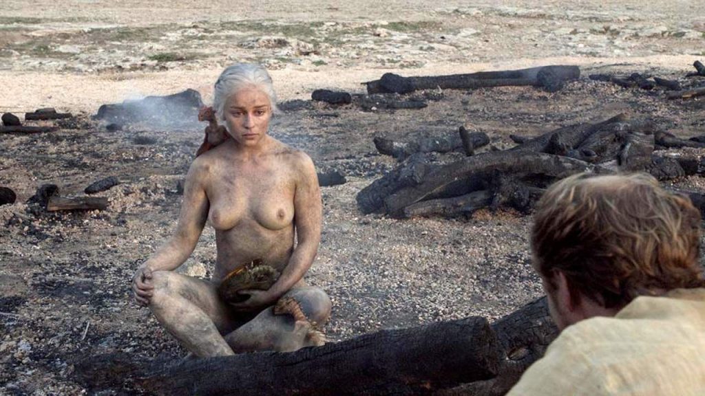 In this scene, we can see Emilia Clarke nude, sitting with her legs crossed in the remains of an extinguished fire. We see her bare boobs as she holds a baby dragon in her lap and stands up while covering her pussy with another dragon.