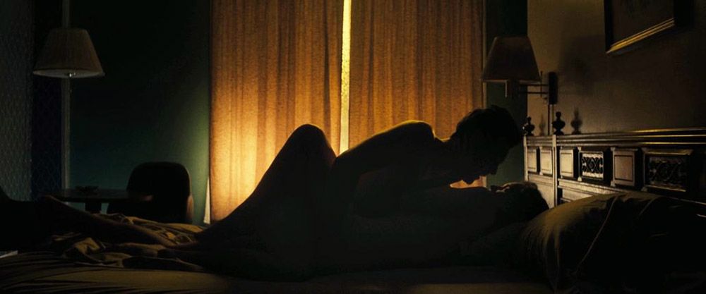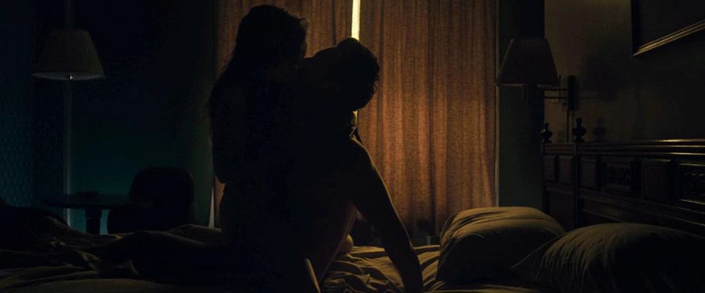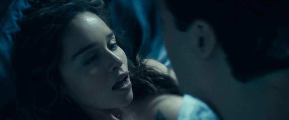 Then Emilia Clarke is sitting on a piece of furniture in a motel room. She and a guy have sex in slow motion, her dress strap off the shoulder. We then see a bit more cleavage from Emilia while on her back under the guy, as they have sex again.