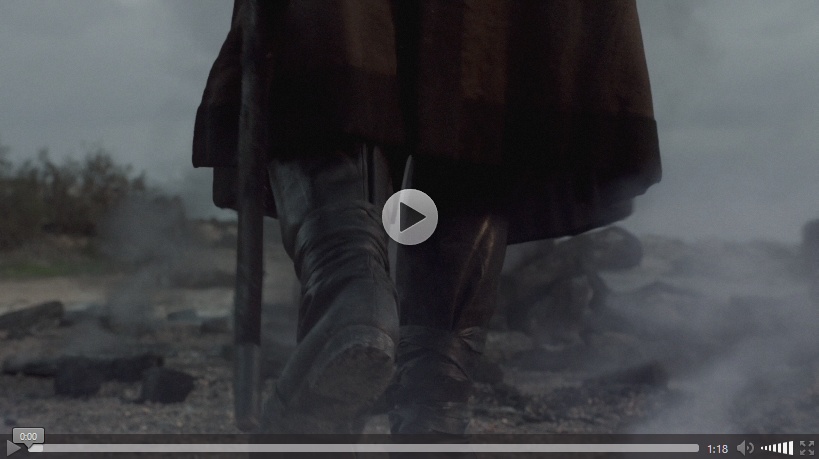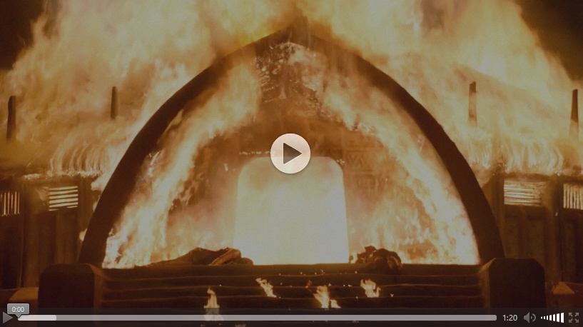 Sexy actress Emilia Clarke emerging naked from a burning building, her breasts becoming visible as she steps out of the flames and looks out over a crowd of people kneeling below.
