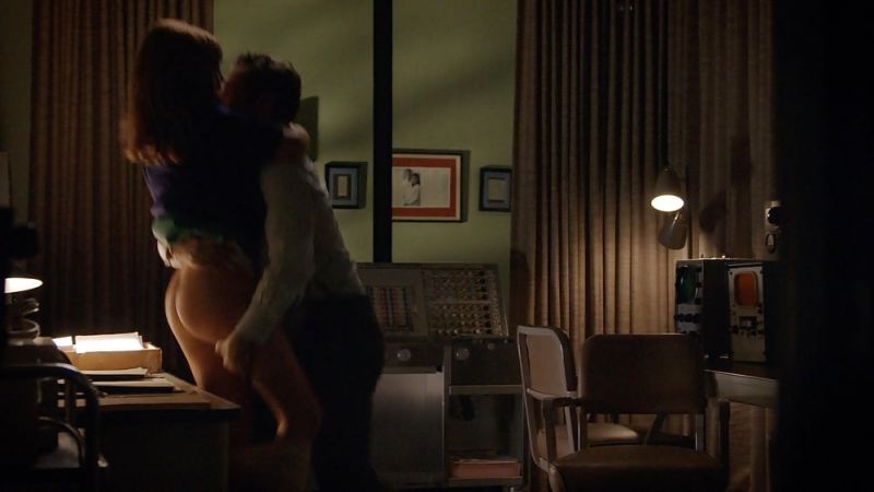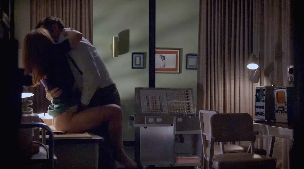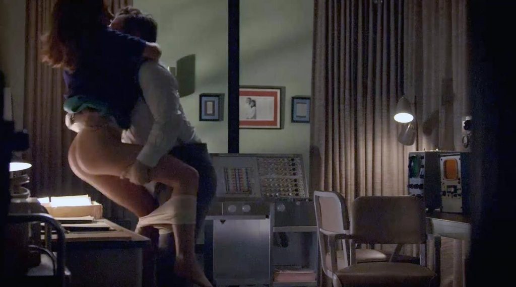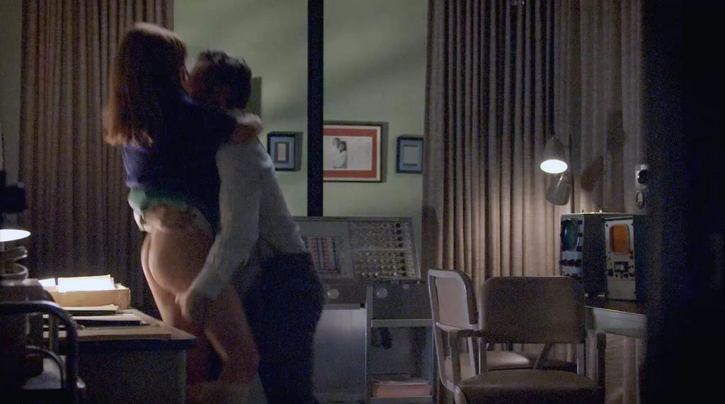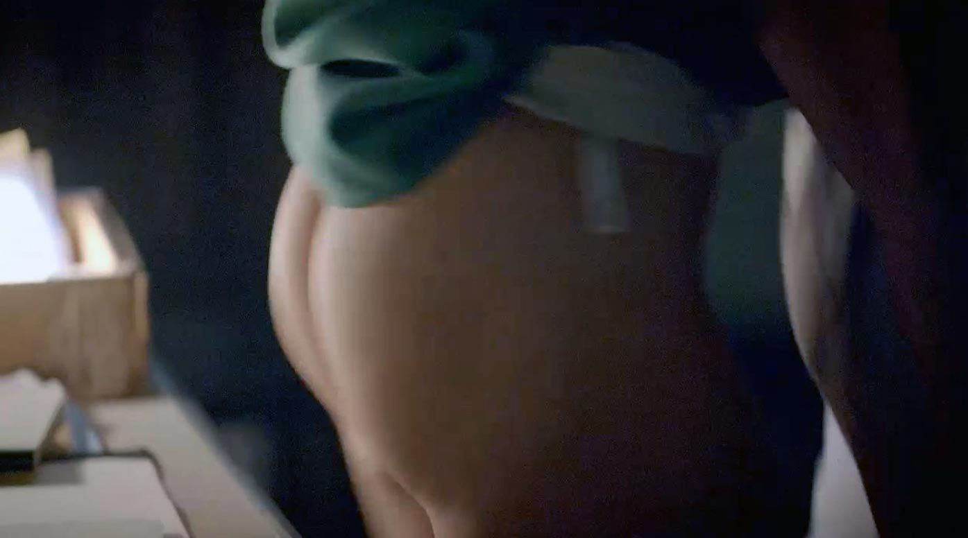 Emily Kinney has sex with a man in an office late at night when he lifts her and carries her to a desk, where he pushes up her skirt and down her slip, exposing her naked buttocks. The guy puts her on top of the desk, and she tries to seduce him before he drives her backward.