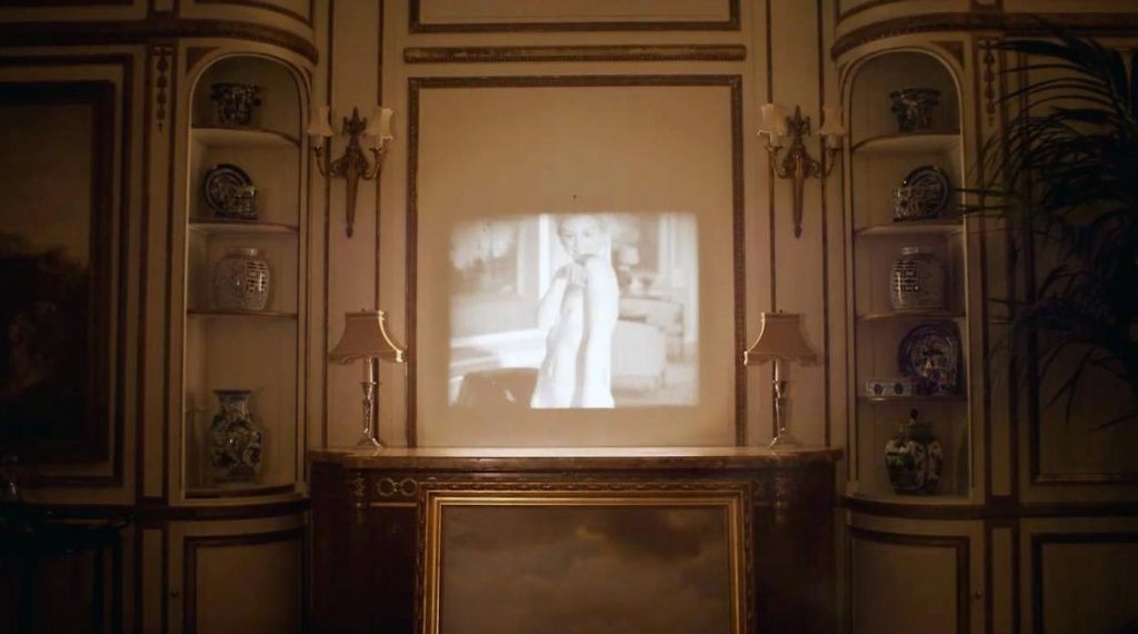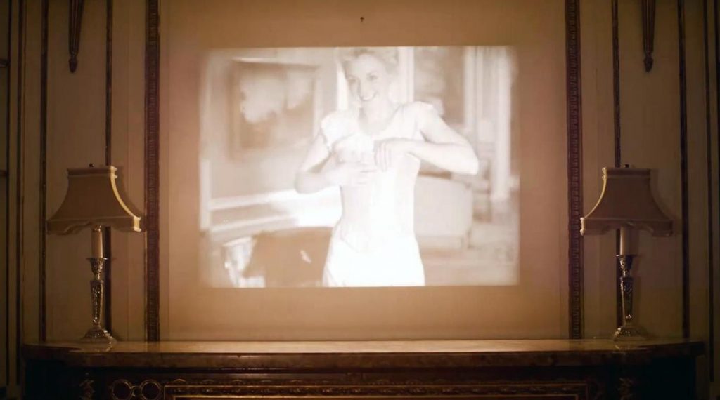Emily Kinney is seen in an old-style movie undressing and baring her breasts in a frame projected on a wall.
